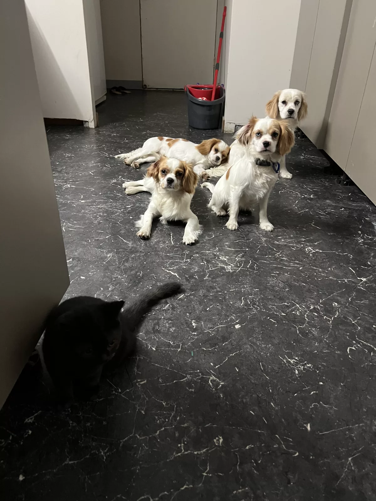 Dogs have access to: warm bedding, water at all times, ample space to exercise, natural light
