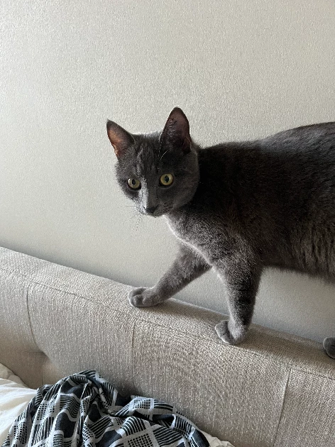 This boy is of Russian blue descent, exhibiting the breed's striking looks and intelligent demeanour, though we are not certain if he is full breed or not. He is a wonderful companion to have under the right circumstances and thrives on attention.