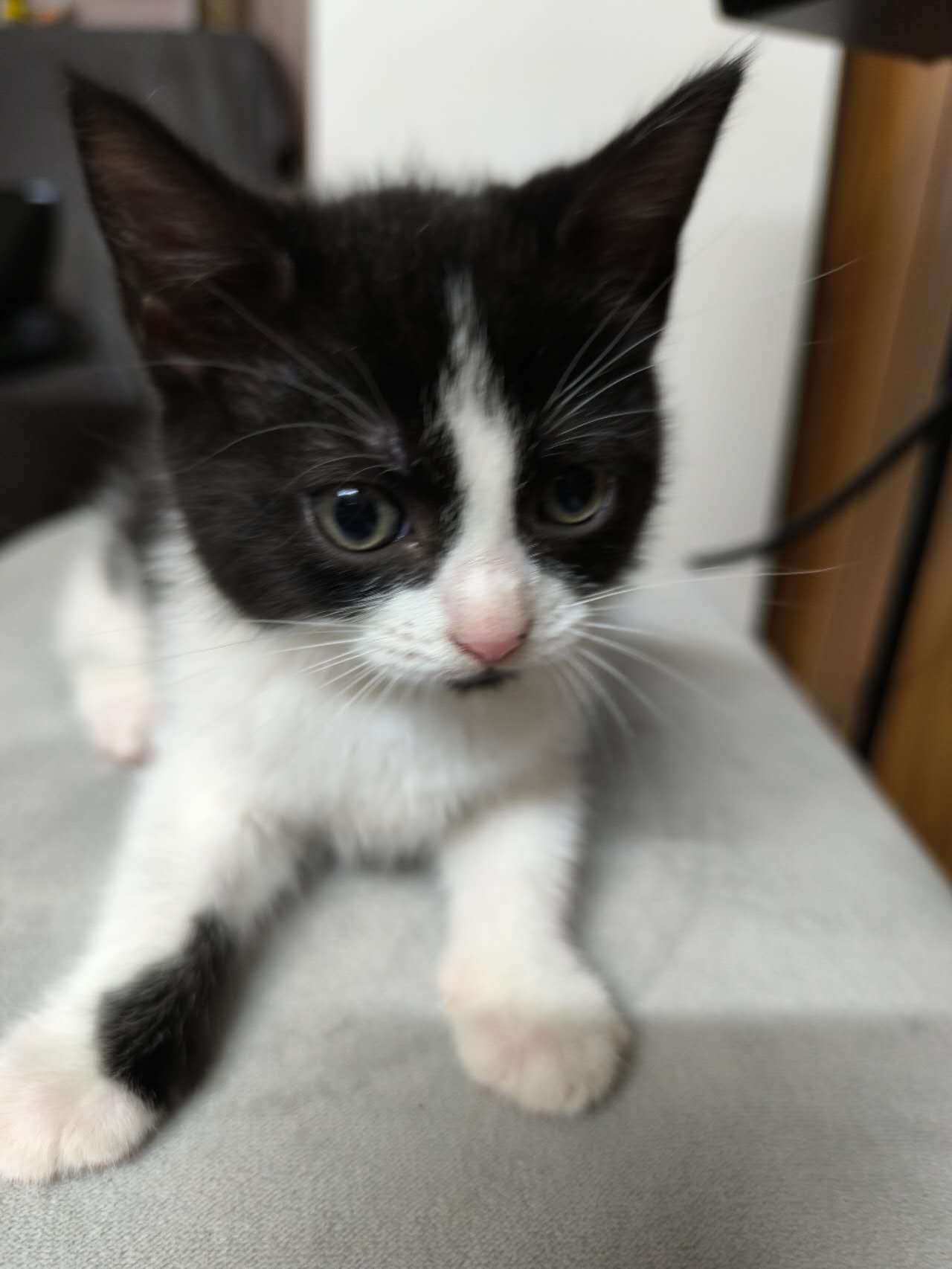 This little girl is our bundle of joy! She sports the classic black and white Tuxedo pattern and carries the Turkish Angora lineage, giving her a noticeably softer, silkier coat than standard domestics. Tuxedo cats are widely known for being highly intelligent, vocal, and deeply bonded with their humans—often described as dog-like in their loyalty.