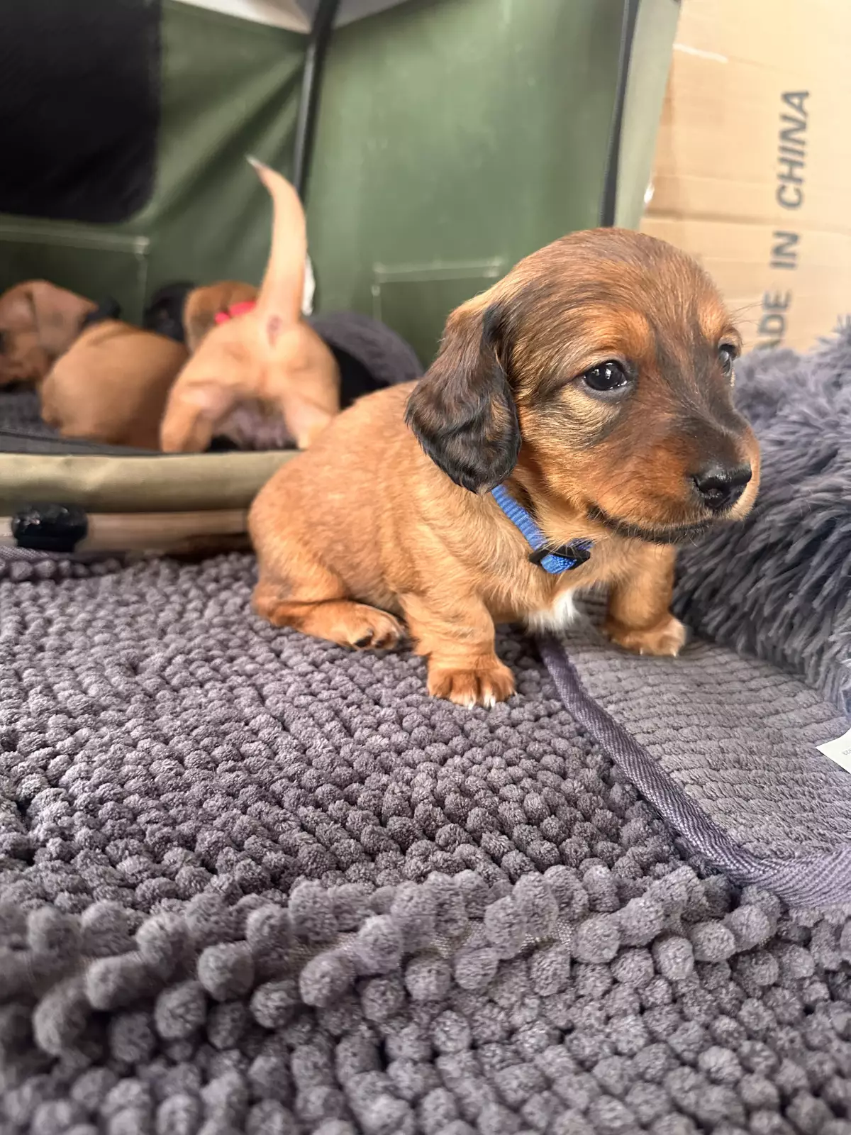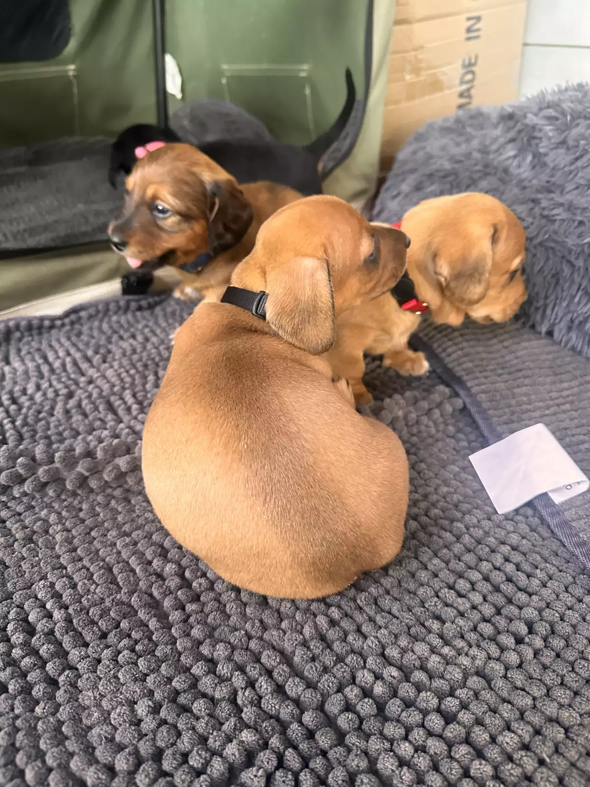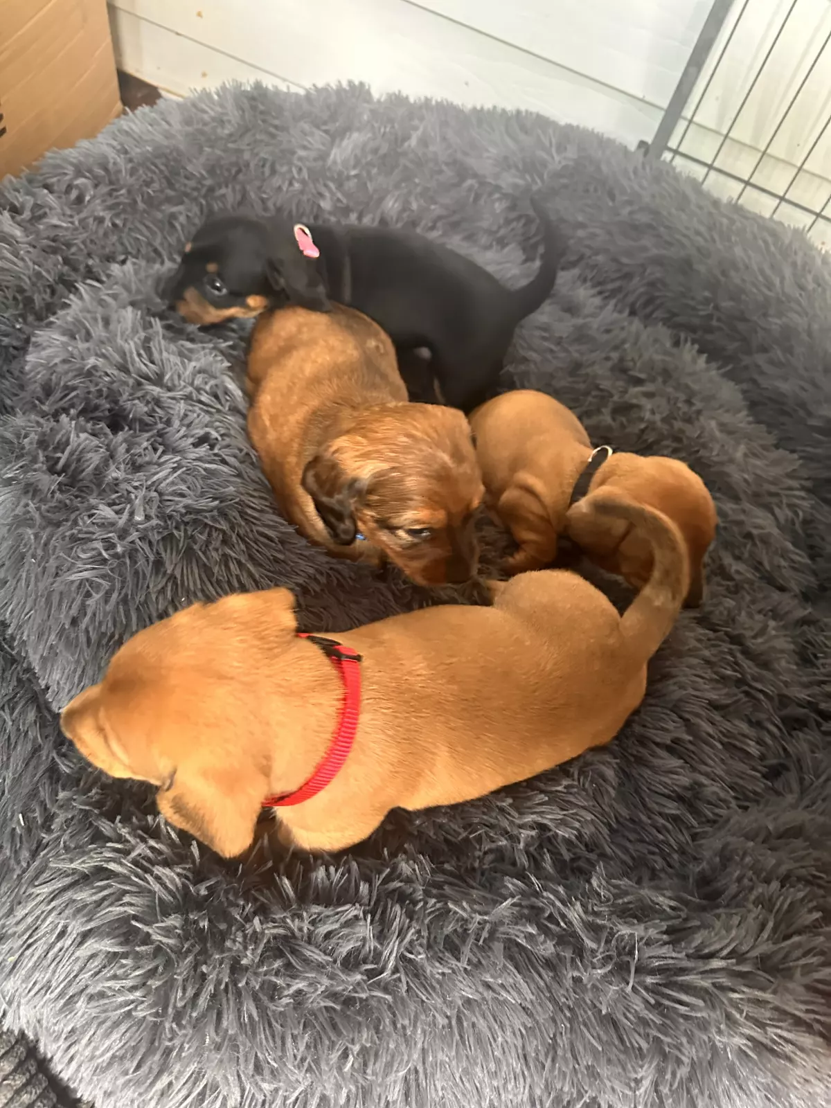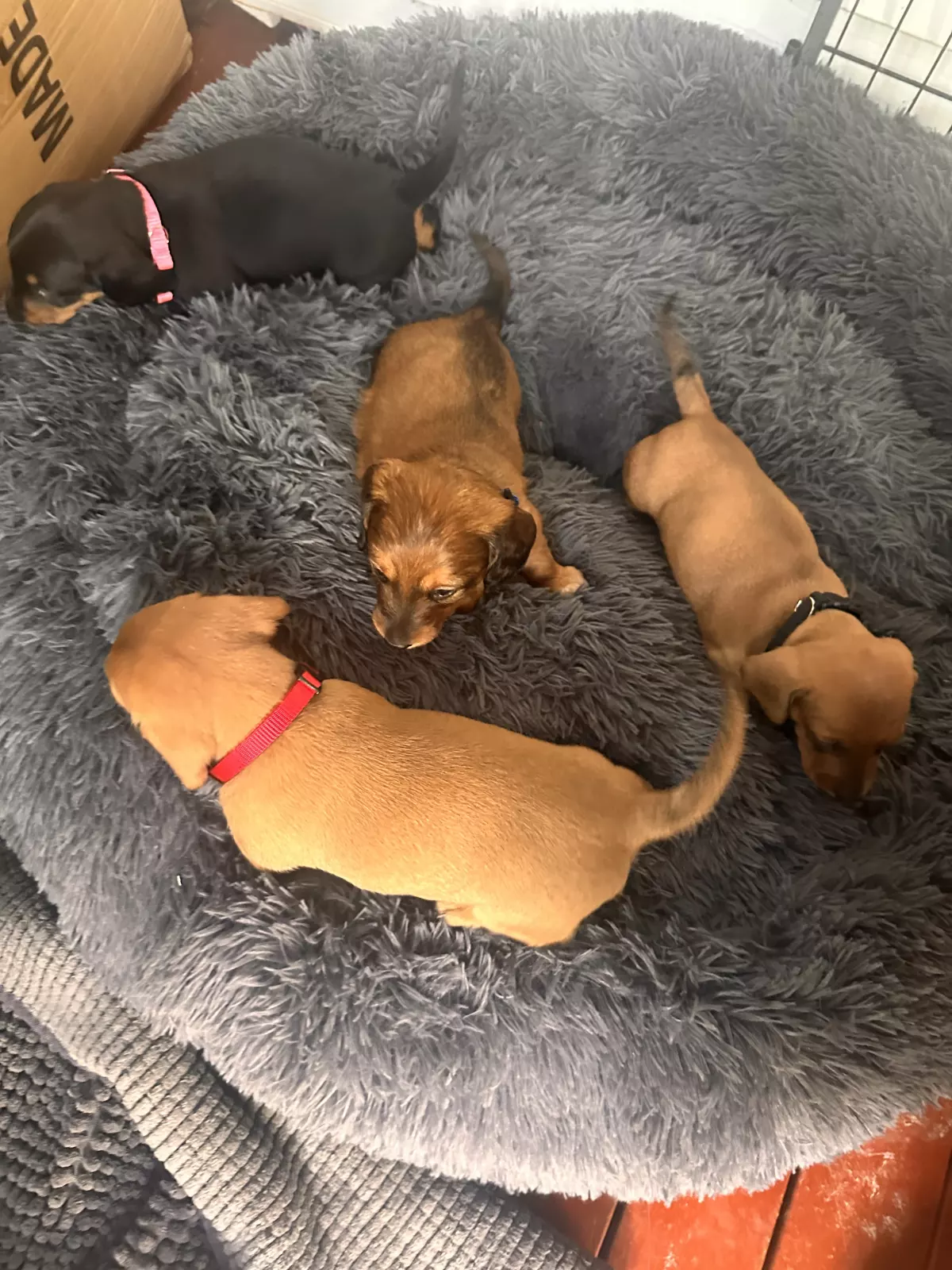 One of the puppies is a long haired Dachshund and the rest are short hair Dachshunds.