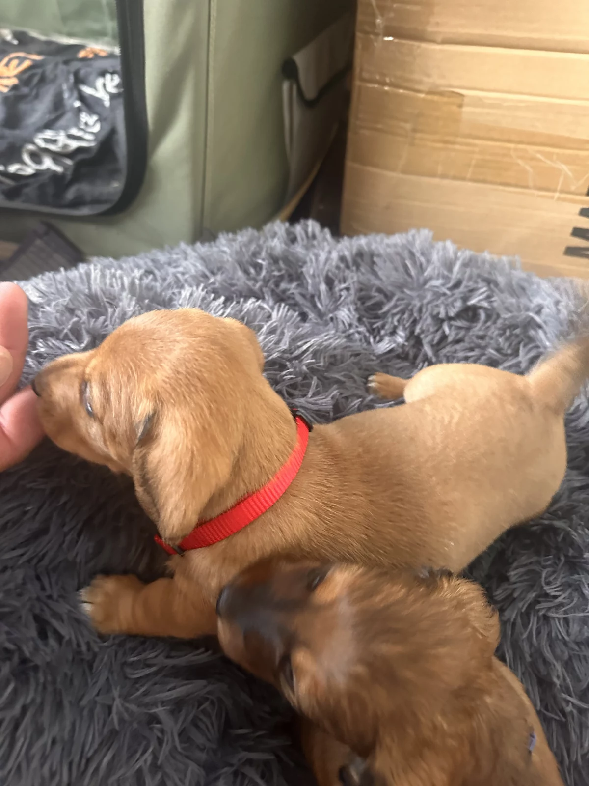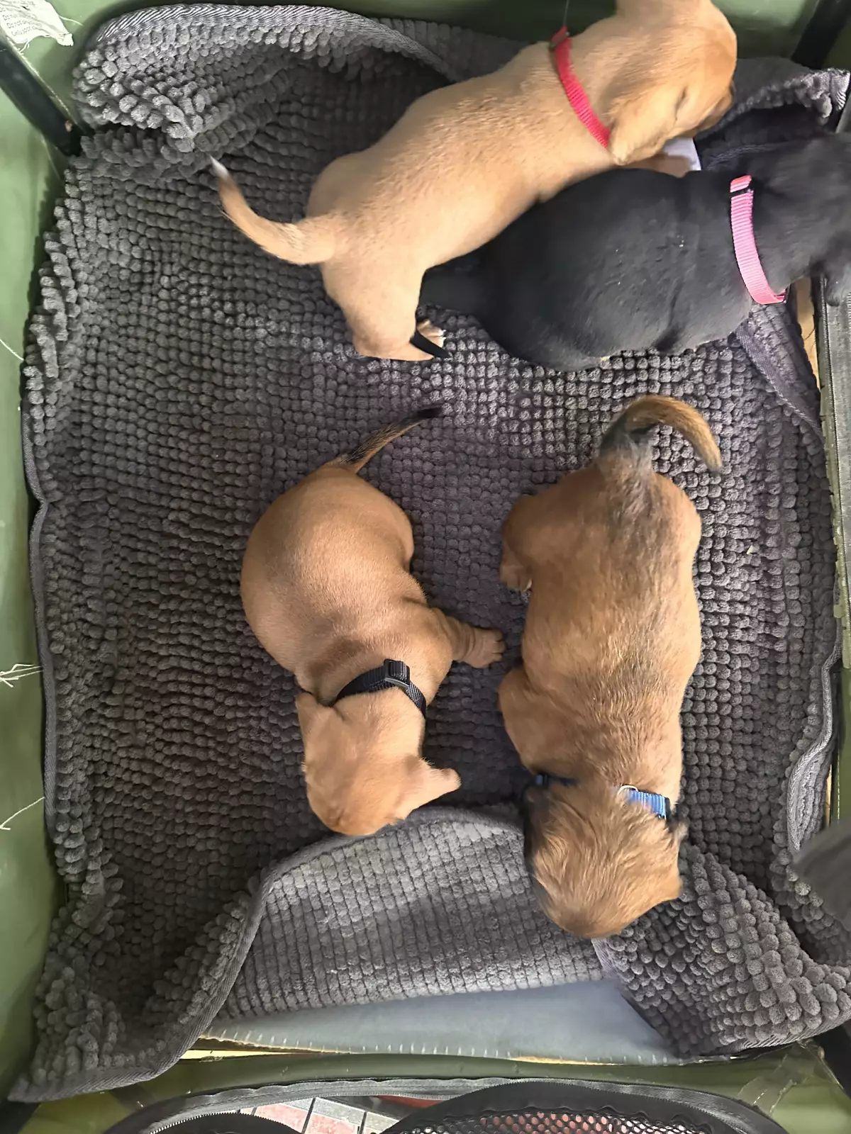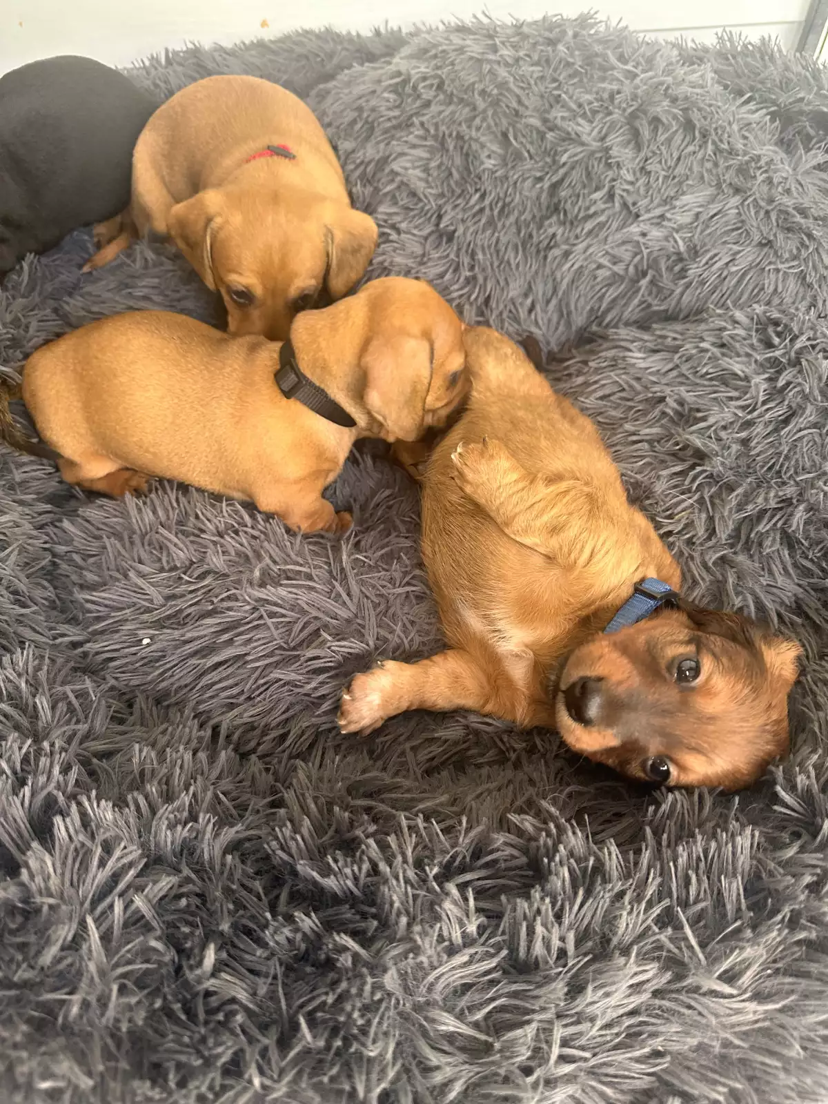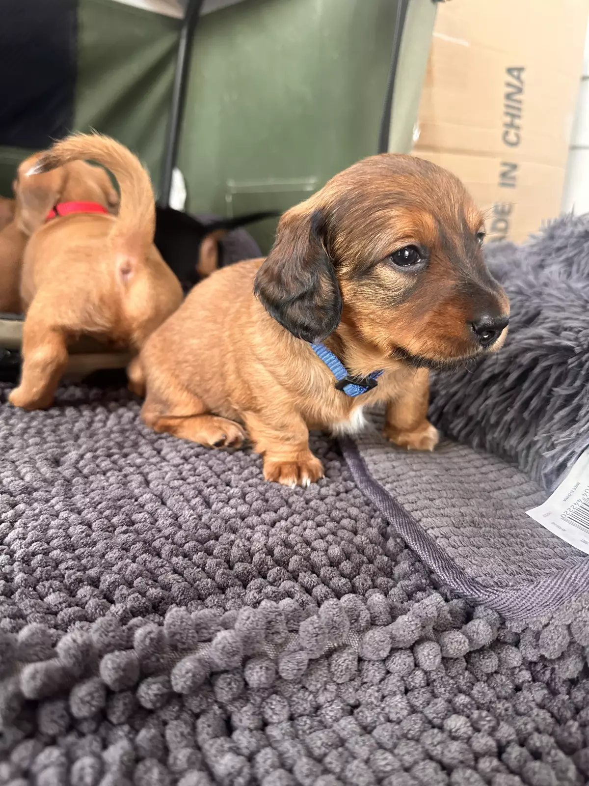 One of the puppies is a long haired Dachshund and the rest are short hair Dachshunds.