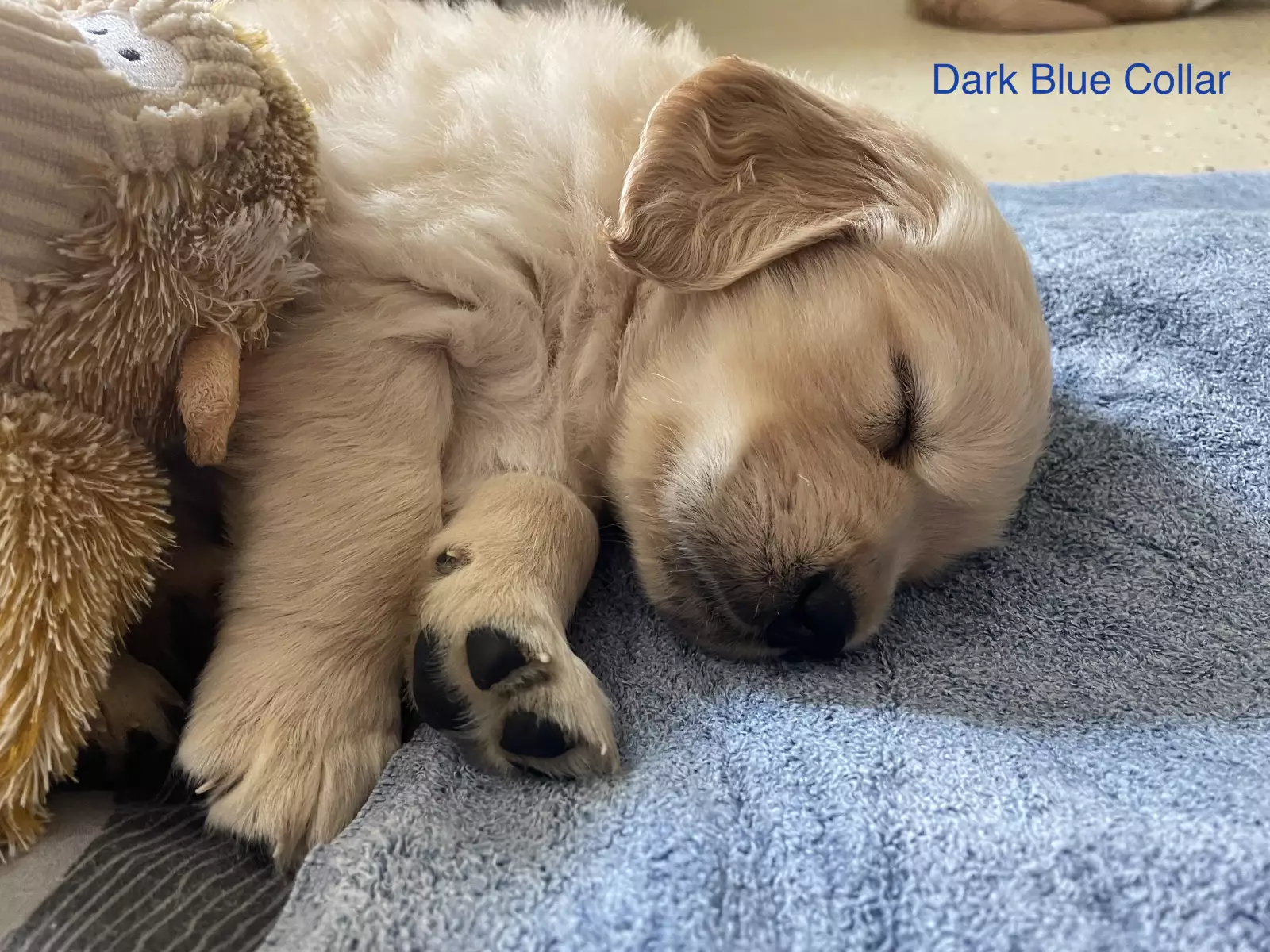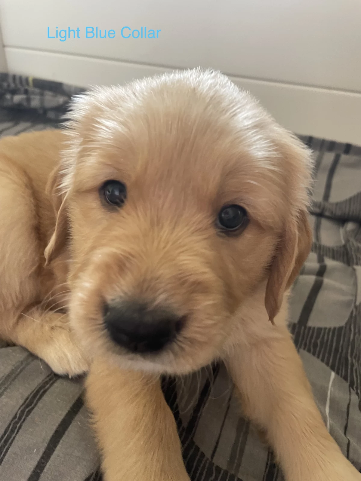 🐾 Light Blue collar: A darker-coloured boy who adores kisses and hugs, this affectionate pup is playful and fluffy. His charming white strip on his head resembles his mother.