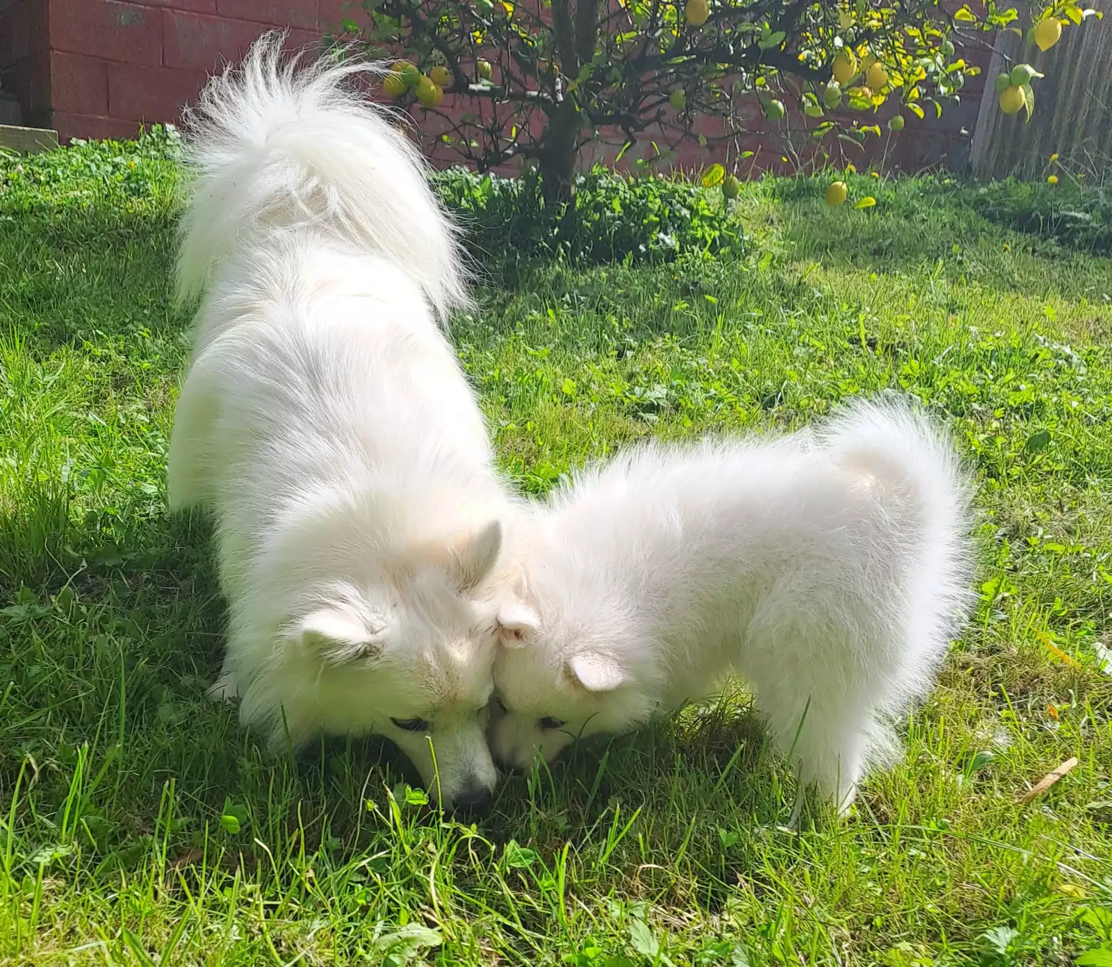 Japanese Spitz are gentle, loving and intelligent creatures. They have dark soulful eyes and a magnificent white coat. They are playful and spritely, and love the outdoors, but will also curl themselves up like an Arctic Fox and snooze peacefully for hours. They are confident, adore the company of humans, and respond well to training. Our pups have been raised in a loving clan with Mum and Dad, and are all thriving and happy. They have been vet-checked and are all perfect. Both our parent dogs have been DNA tested and are in excellent health. Puppies will come microchipped, wormed and vaccinated at 8 weeks.