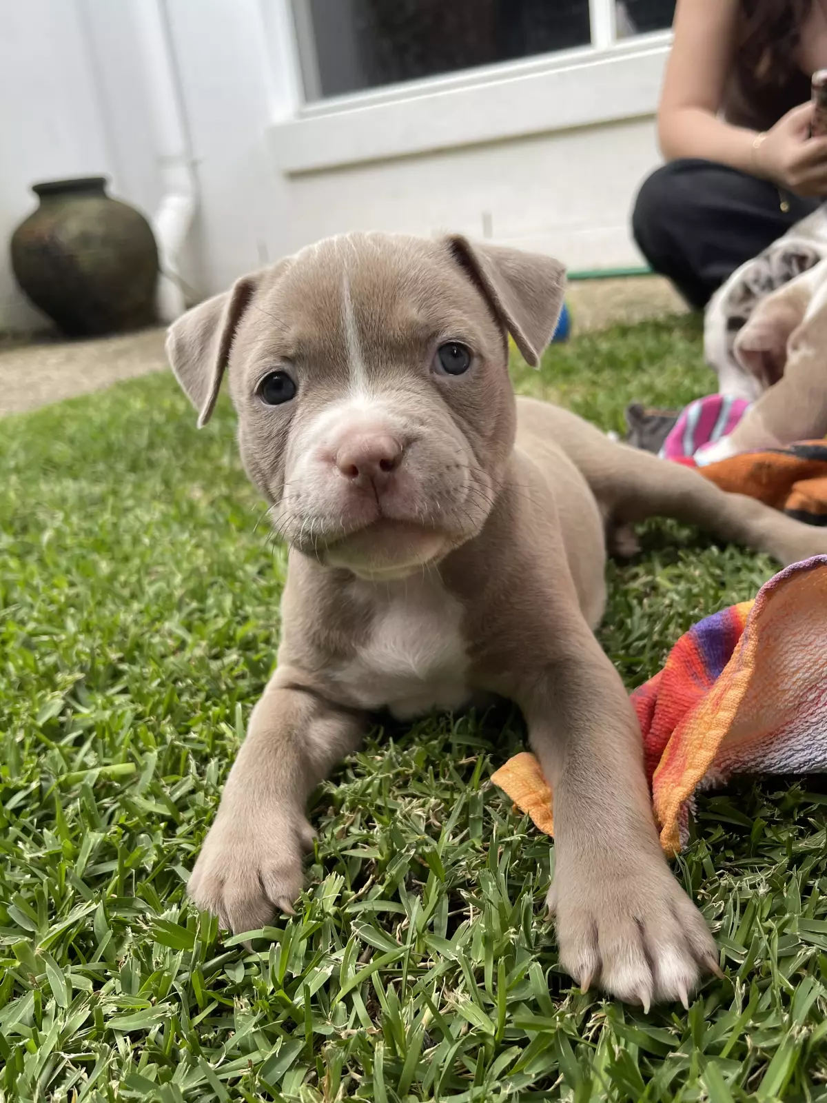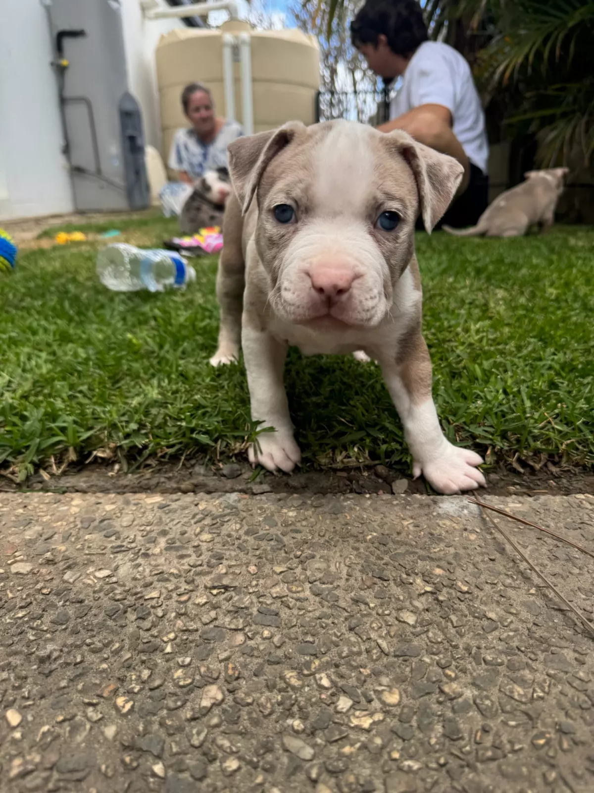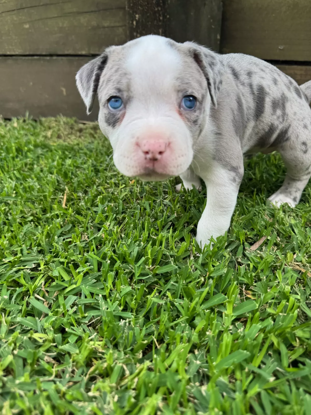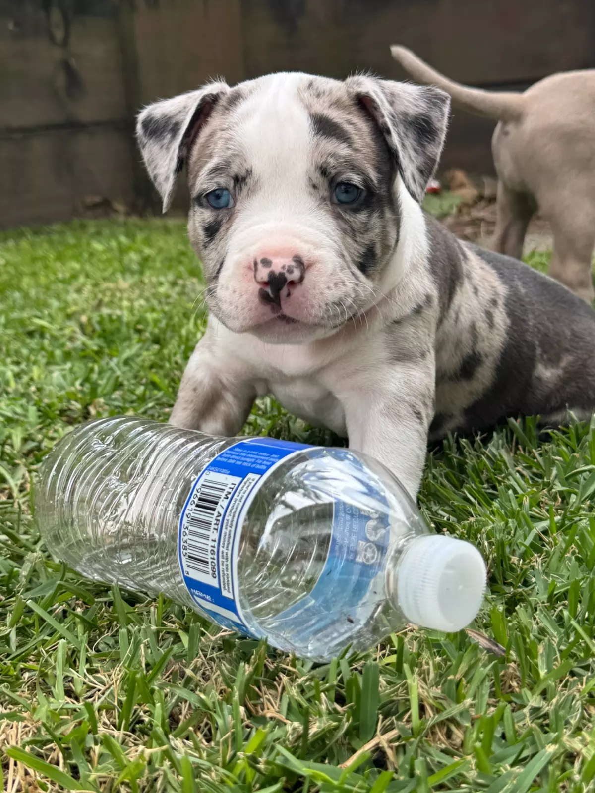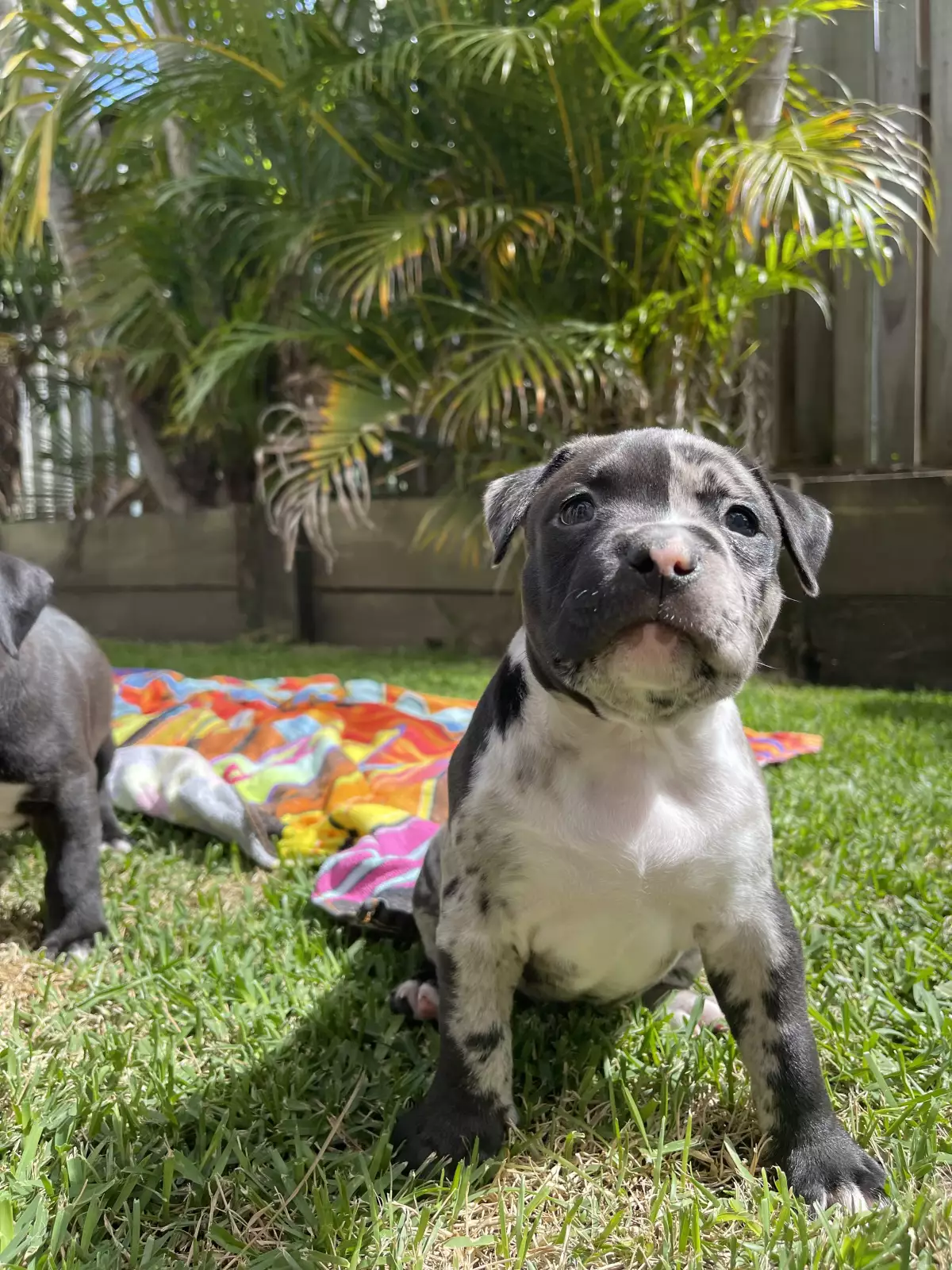 These purebred American Bulldog puppies are showing amazing potential for both family companions and impressive show dogs, thanks to their strong bloodlines and excellent conformation. They are developing into sturdy pups, known for their confident personalities and strong protective instincts that make the American Bulldog such a dedicated family guardian. The rare Merle coats and striking blue eyes make these pups stand out—they really are beautiful. We've been giving them lots of early handling and socialization so they're already happy, outgoing, and ready to bond easily with people. This is a fantastic opportunity to own a high-quality puppy with unique coloring and the stable, loving temperament this breed is famous for. They are eating solids well and will be ready to go to their approved homes soon.