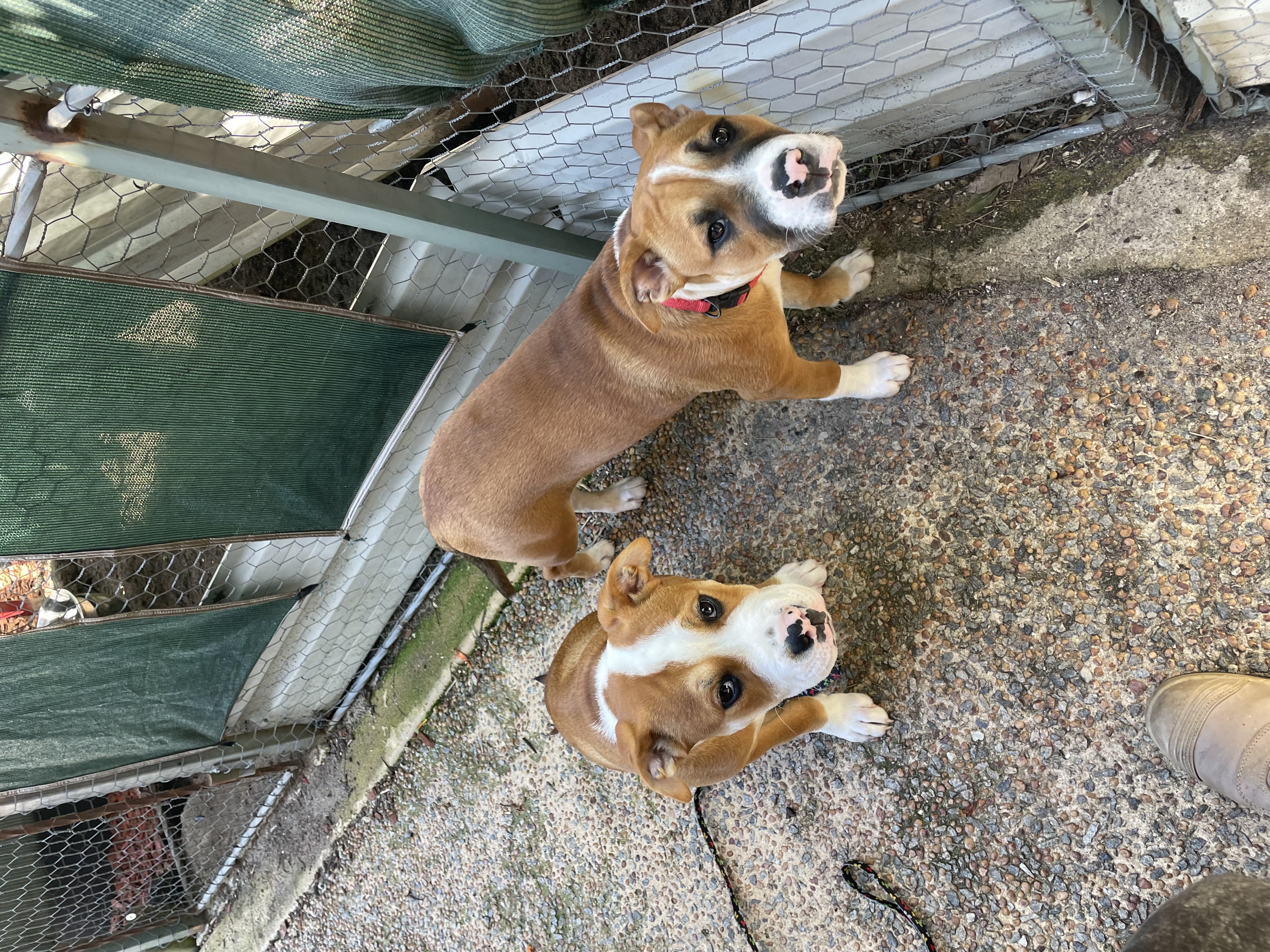 2 puppies, one female one male tawny and white 5 months old. They are toilet trained and good with other dogs, one is a little shy around big dogs but both have plenty of growing and confidence. Fully vaxed and up to date and have de worming/ flea treatment every month. Super cute family pups good around kids and other dogs the girl is full of confidence and wit and the male is a goofball both full of love to give to the right family. These young American Bulldogs are entering a crucial stage of development where consistency is key, and their excellent socialization foundations are already established. The American Bulldog is celebrated for its protective yet gentle nature, making them exceptional companions for active households. Their lineage ensures they will mature into powerfully built, loyal protectors, making the investment in early training invaluable for directing their natural drive. We are prioritizing placements in homes that understand the need for daily exercise and continued engagement to maintain their mental and physical well-being. Both puppies display the classic alert intelligence and steadfast devotion characteristic of the breed, ready to bond deeply with their new owners. This pair offers a wonderful opportunity to integrate two loving personalities into your home.