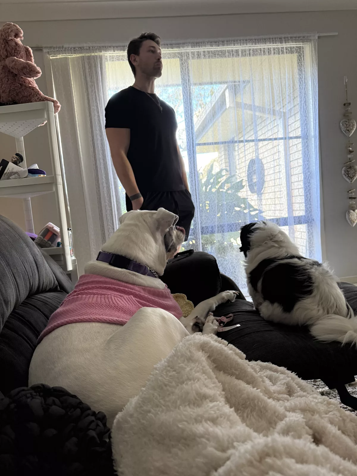 Dogs have access to: warm bedding, water at all times, ample space to exercise, natural light