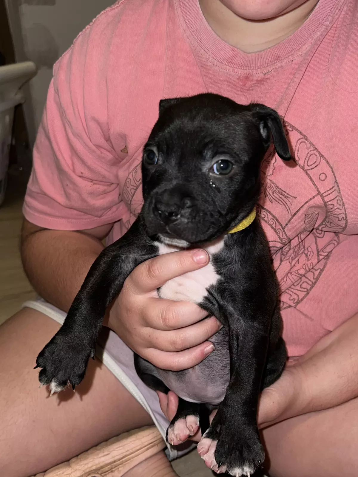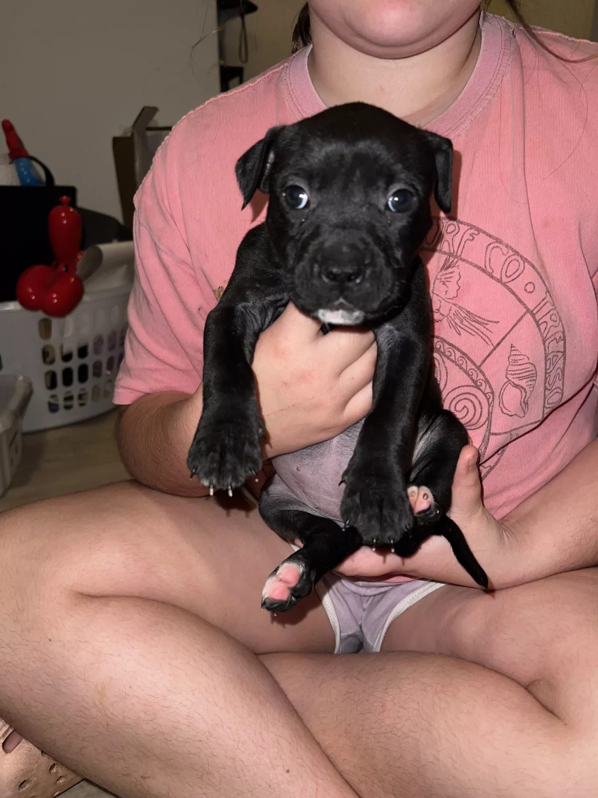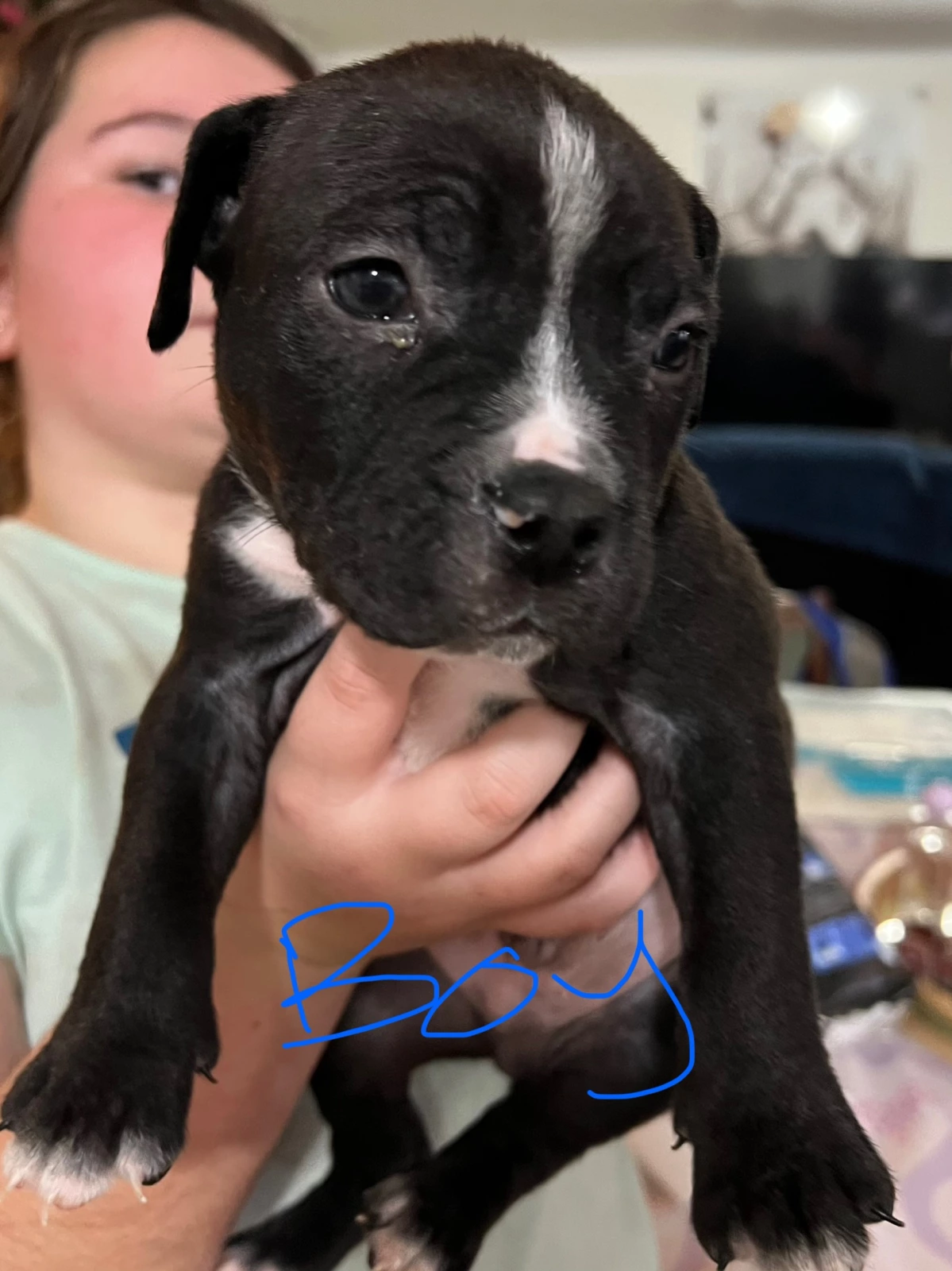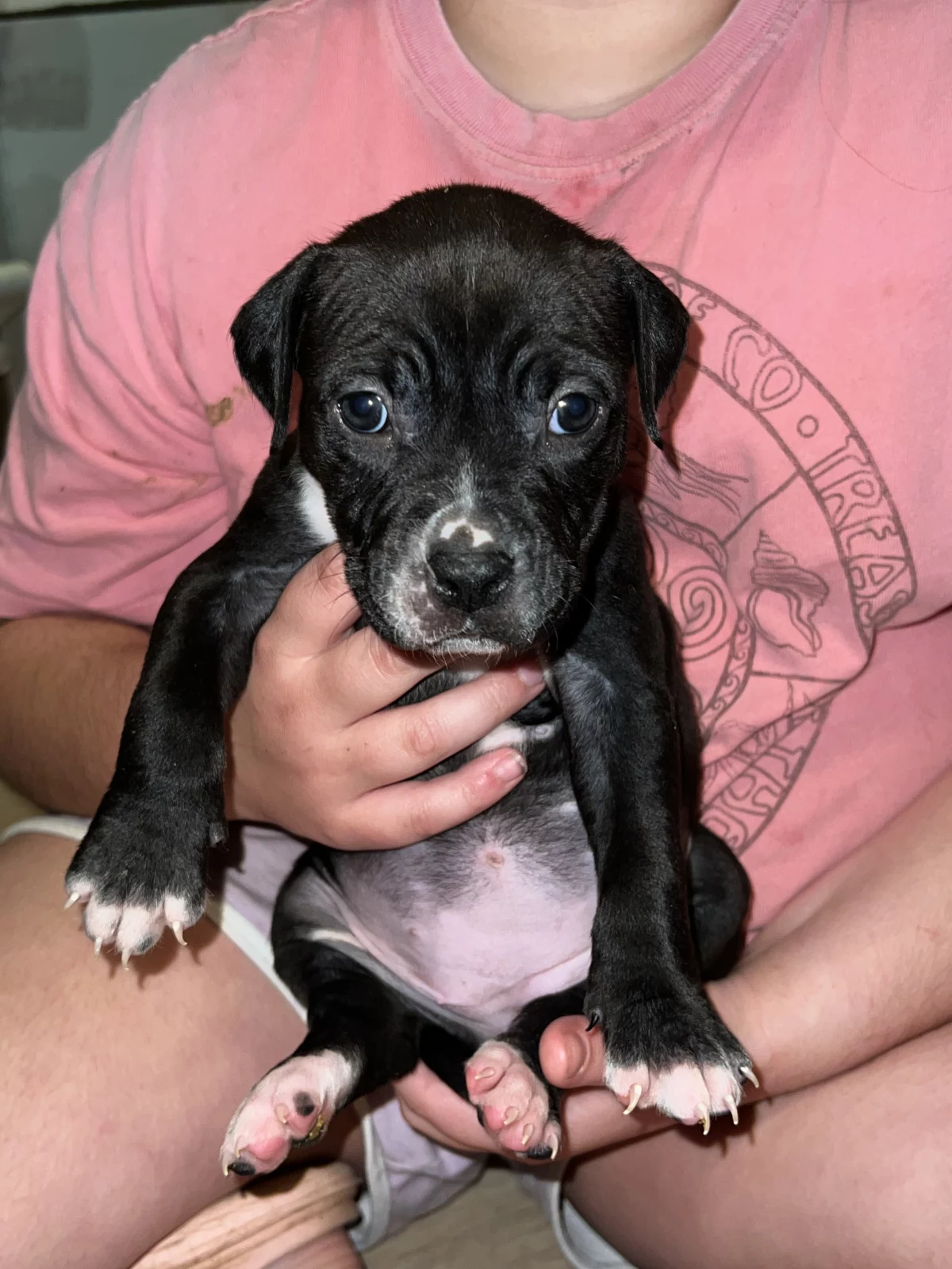 We have 8 beautiful Amstaff x puppies looking for their first and forever homes. Born 2/6/25. A healthy litter of 12.