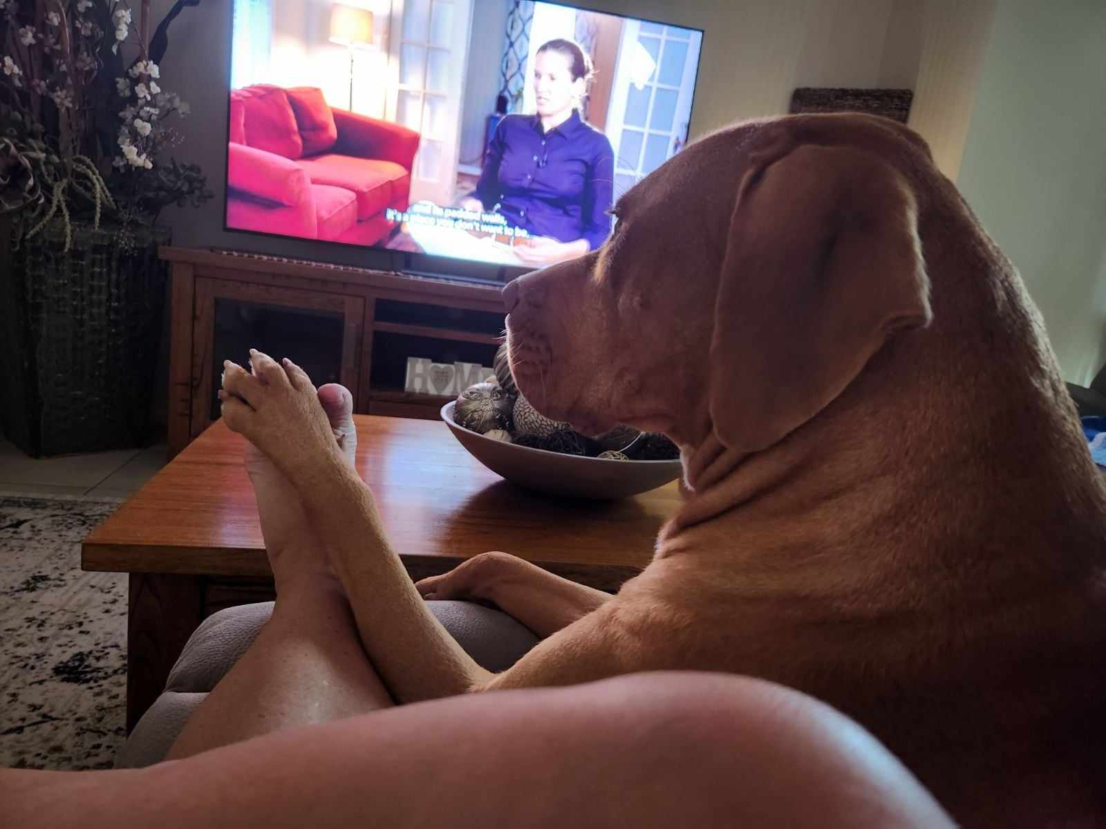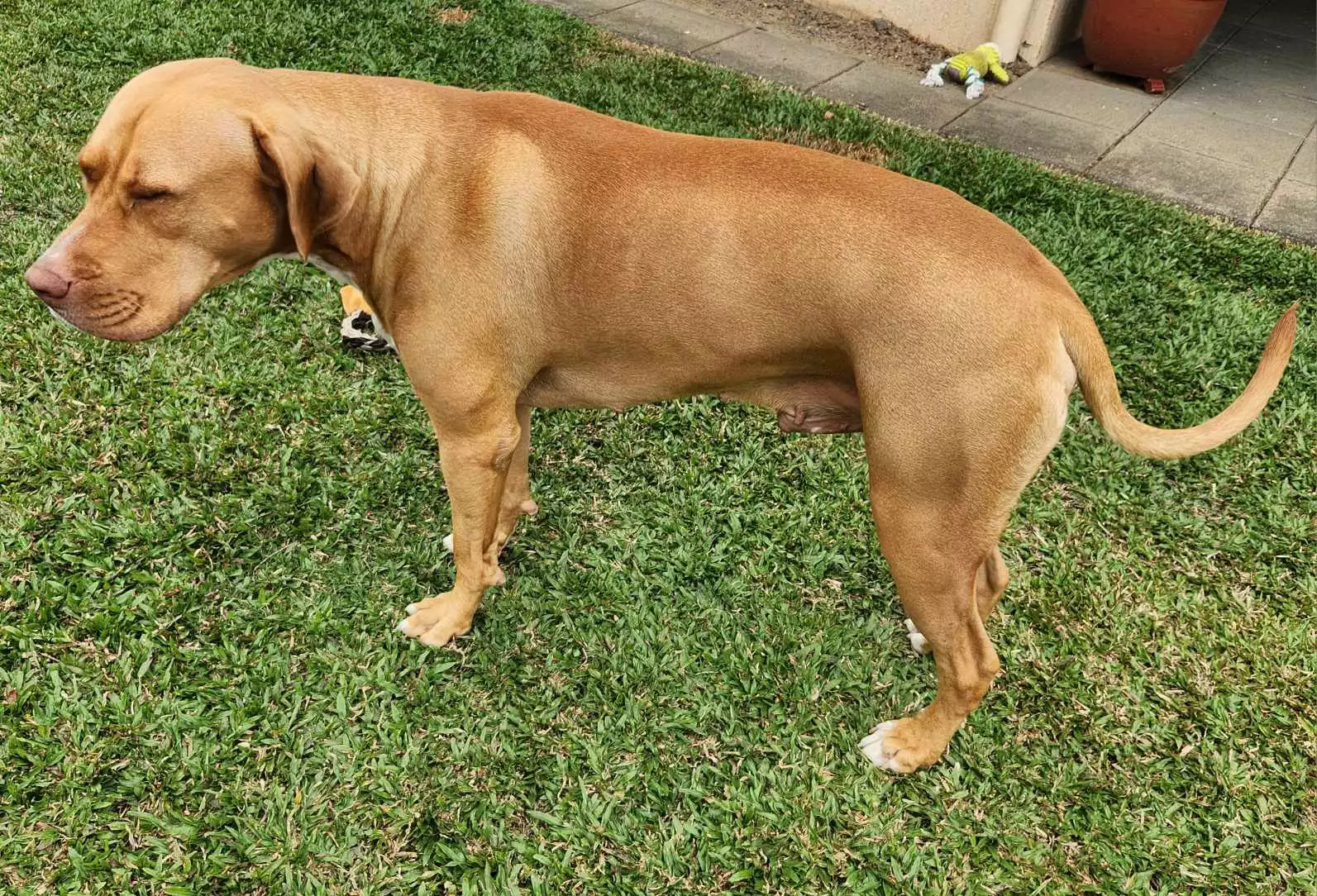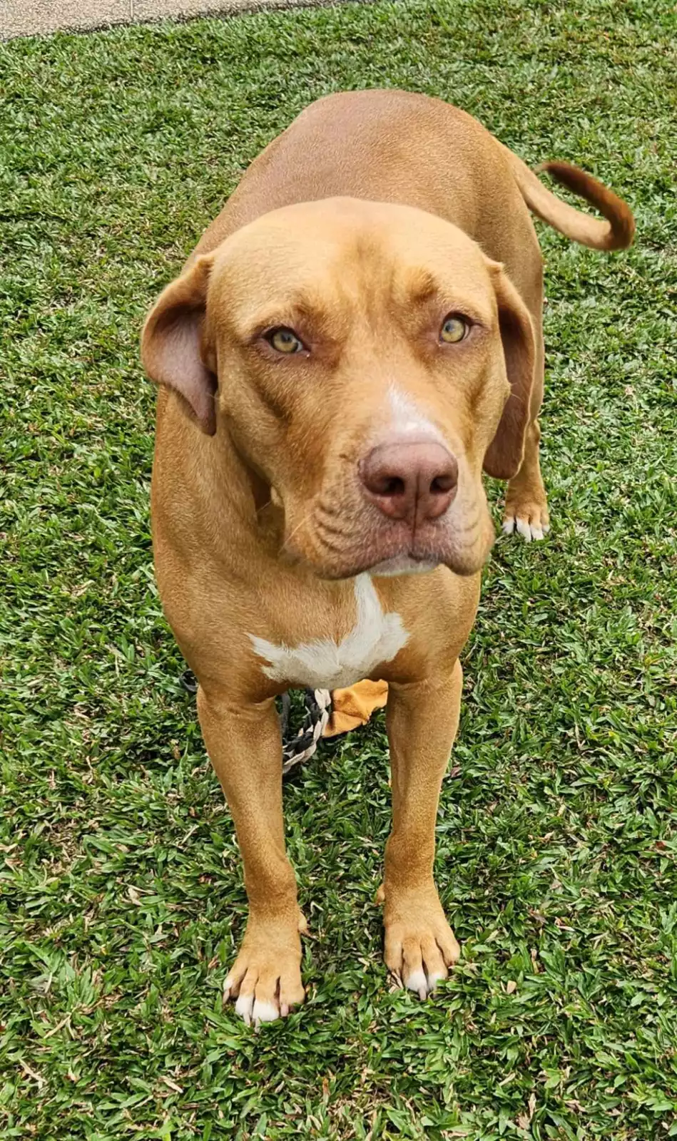 A typical day for Lockie includes leisurely finding a shady spot for a well-earned nap, followed by exhilarating afternoon zoomies to burn off some energy. He enjoys a good swim and loves a game of fetch if the mood strikes him. Despite his hefty 45 kg, Lockie is an excellent walker on a lead with a Halti, but he also does just fine with a simple collar.