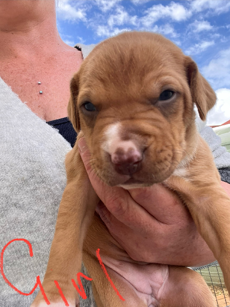 X3 5-week-old beautiful American Staffordshire x pups for sale. Will be ready 7th October — vaccinated, microchipped, wormed, and puppy checked.