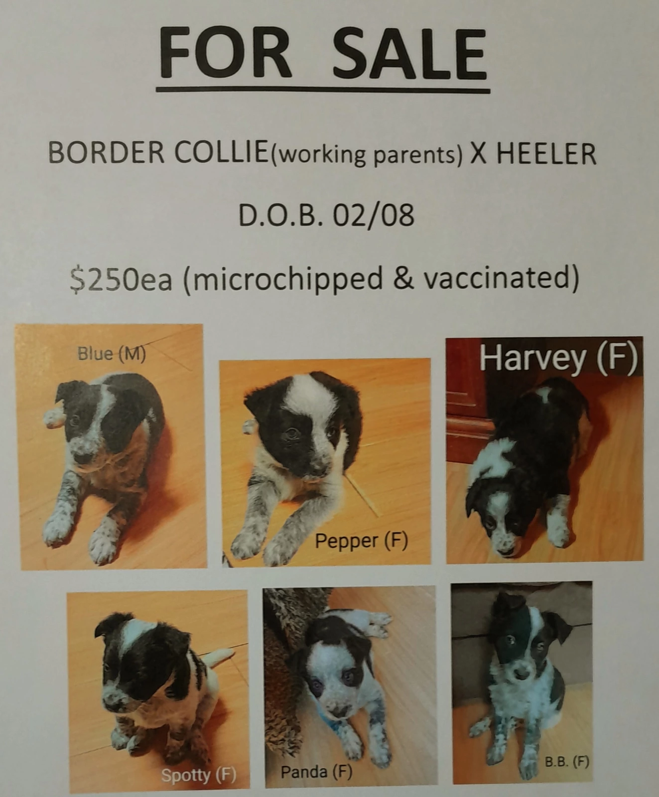 These energetic Border Collie cross Heeler puppies are in immediate need of loving, permanent homes. This unique crossbreed combines the world-class intelligence and herding instincts of the Border Collie with the legendary stamina and loyalty of the Australian Cattle Dog. Born in early August, these pups are now at a prime age to integrate into a new family and begin their foundational training. While we have decided to keep two members of this wonderful litter, we simply do not have the capacity to care for all of them long-term. At $250 or nearest offer, we are prioritizing finding responsible owners who can provide the active lifestyle these smart dogs require. They are perfect for property work or active families who enjoy outdoor adventures. Please view the photos to see their distinct markings and bright personalities. Contact us today to meet these beautiful pups.