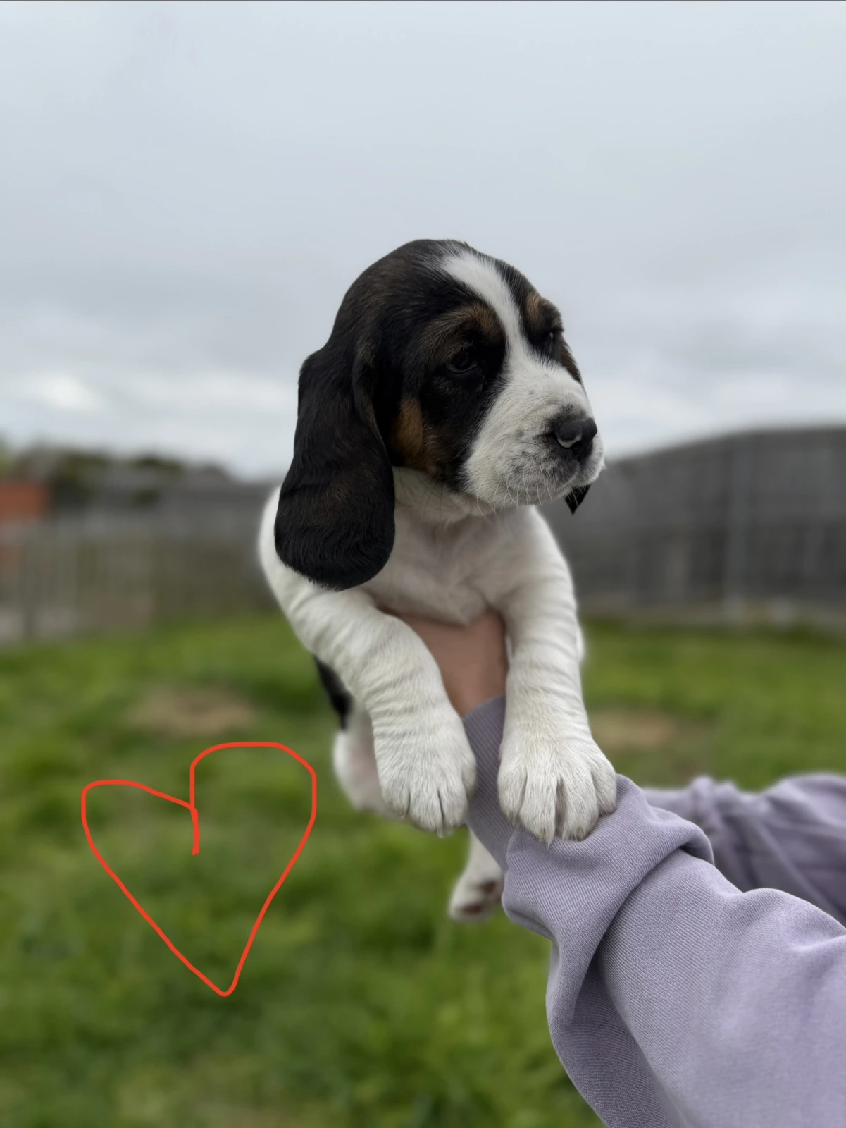 4 beagleXspringer spaniel pups, mostly black and white, three have tan faces