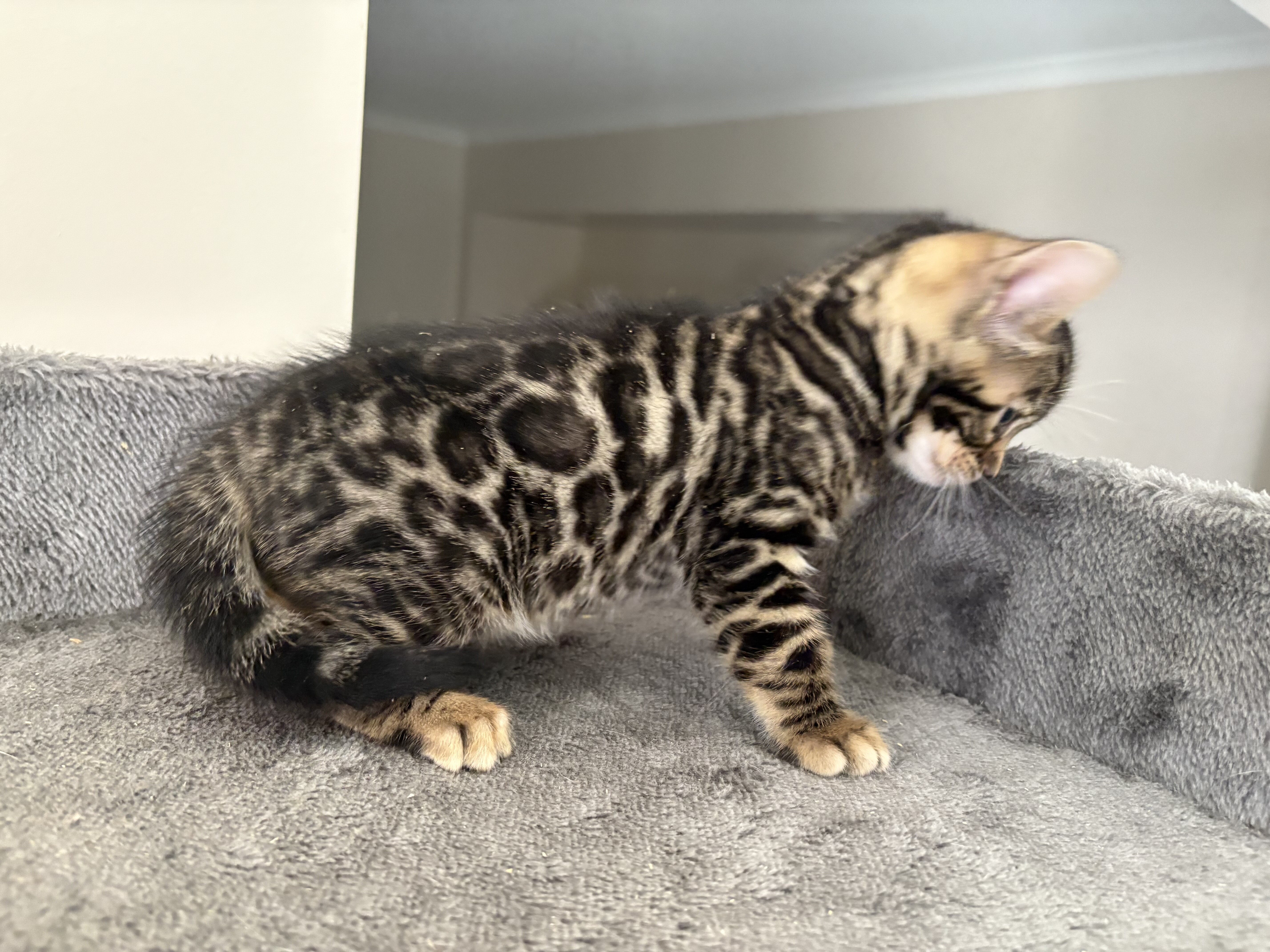This little beauty is growing into a striking Bengal with bold markings and a confident, curious nature. At just 6 weeks old, the kitten is already showing the playful energy and bright temperament the breed is known for.