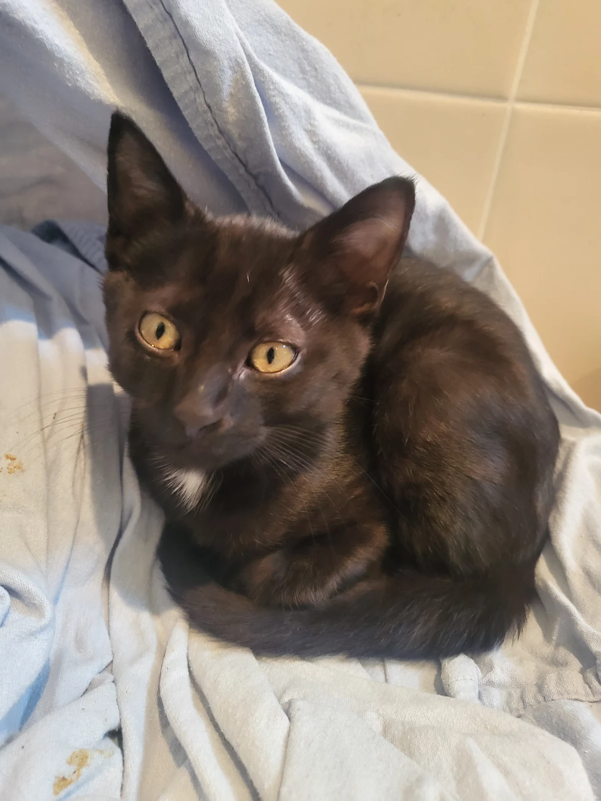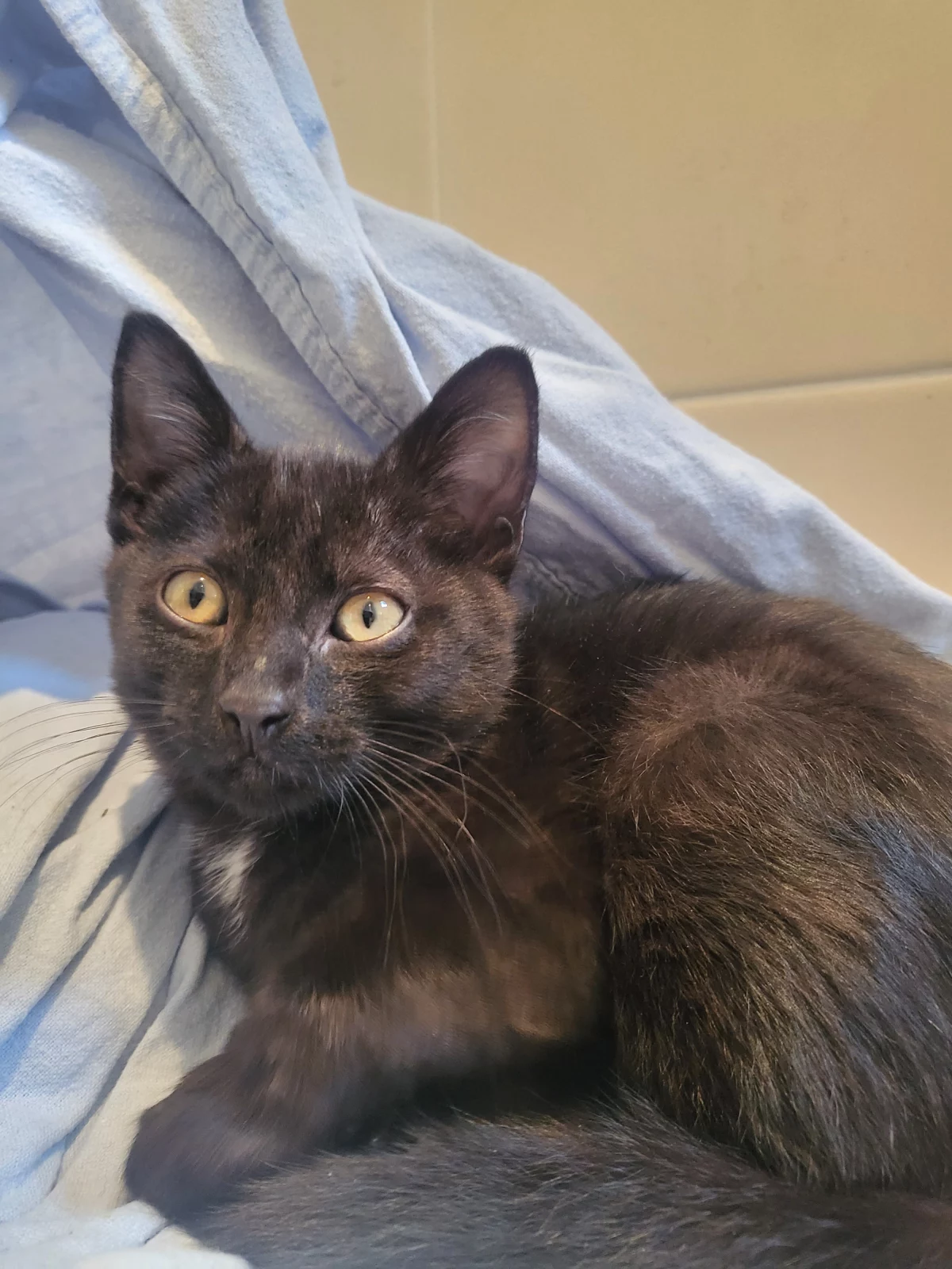 Hi, this kitty is a small black cat with an amazing personality, he is a pur machine. He has already had a vet check and his first vaccination. He will need to be desexed once he is 6 months old and it would be best to keep him as an indoor only cat at least until he has recovered from his desexing.