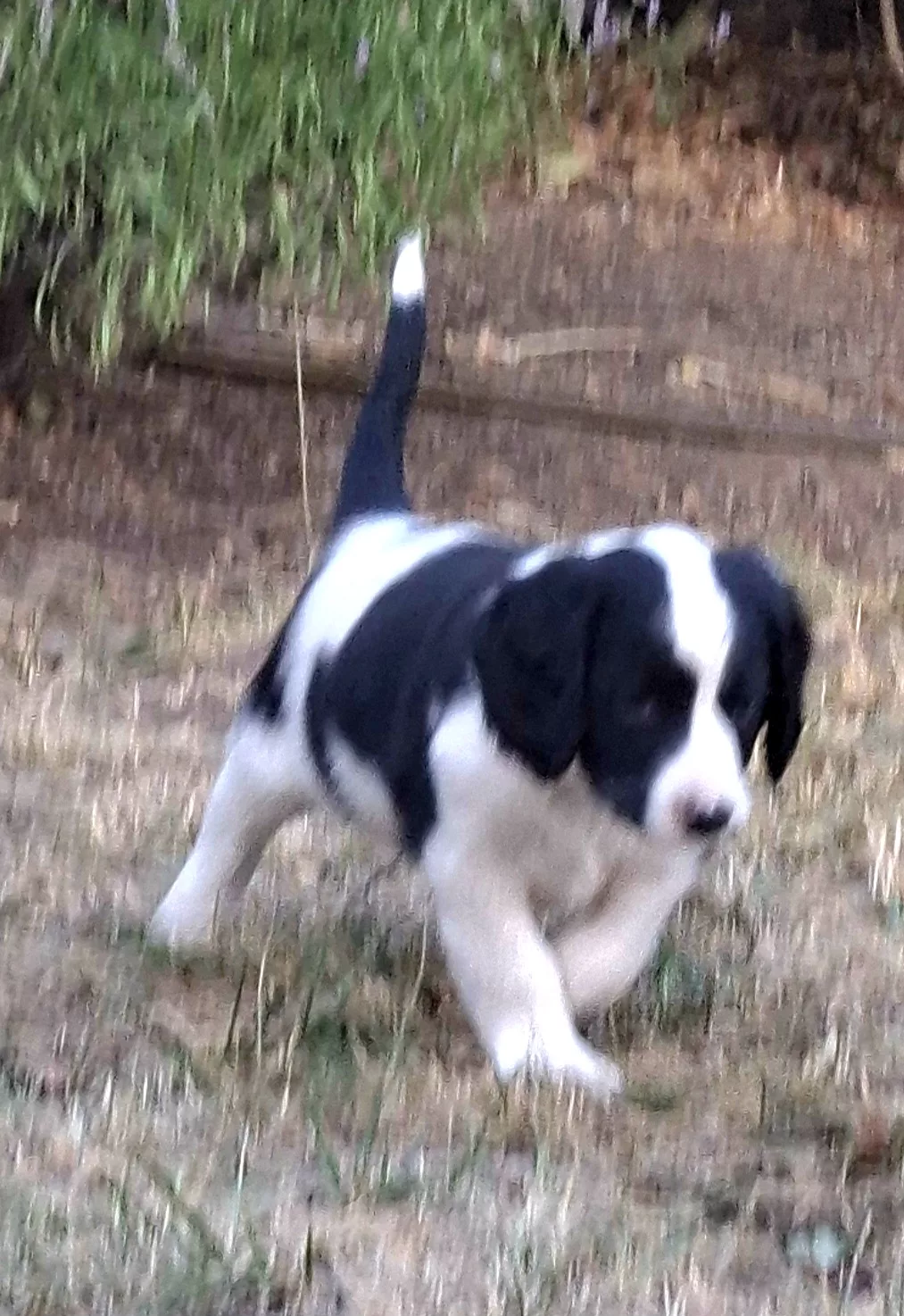 This little personality has an energetic working and show dog lineage but stands out as a quieter version as he hails from a particularly calm pure bred Black and White Border Collie mother, and a sweet pure bred English Black Cocker Spaniel father- both intelligent and interactive parents.