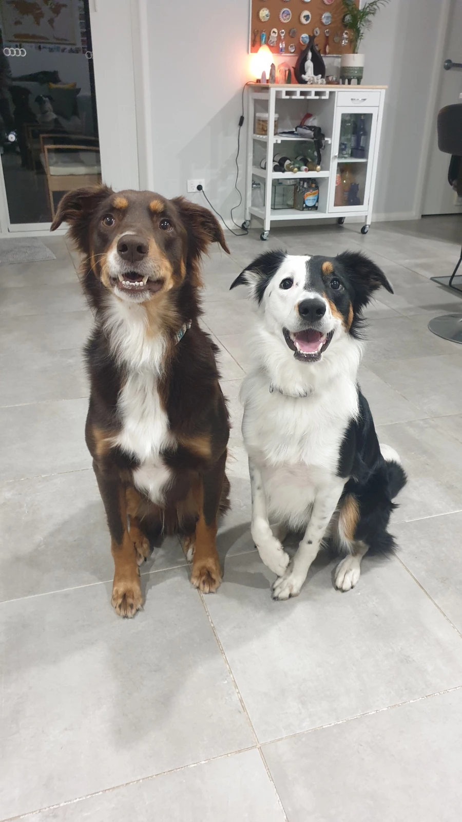 They know lots of tricks and will pee on command as they used to live inside at our bigger house. They are friendly with other dogs and cats and any other pets and anyone that will give them the right attention. Will walk on a lead with you comfortably and both love to be loved.
