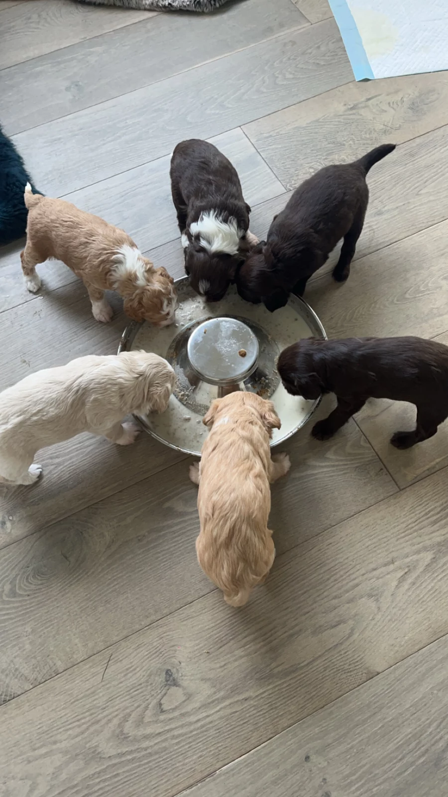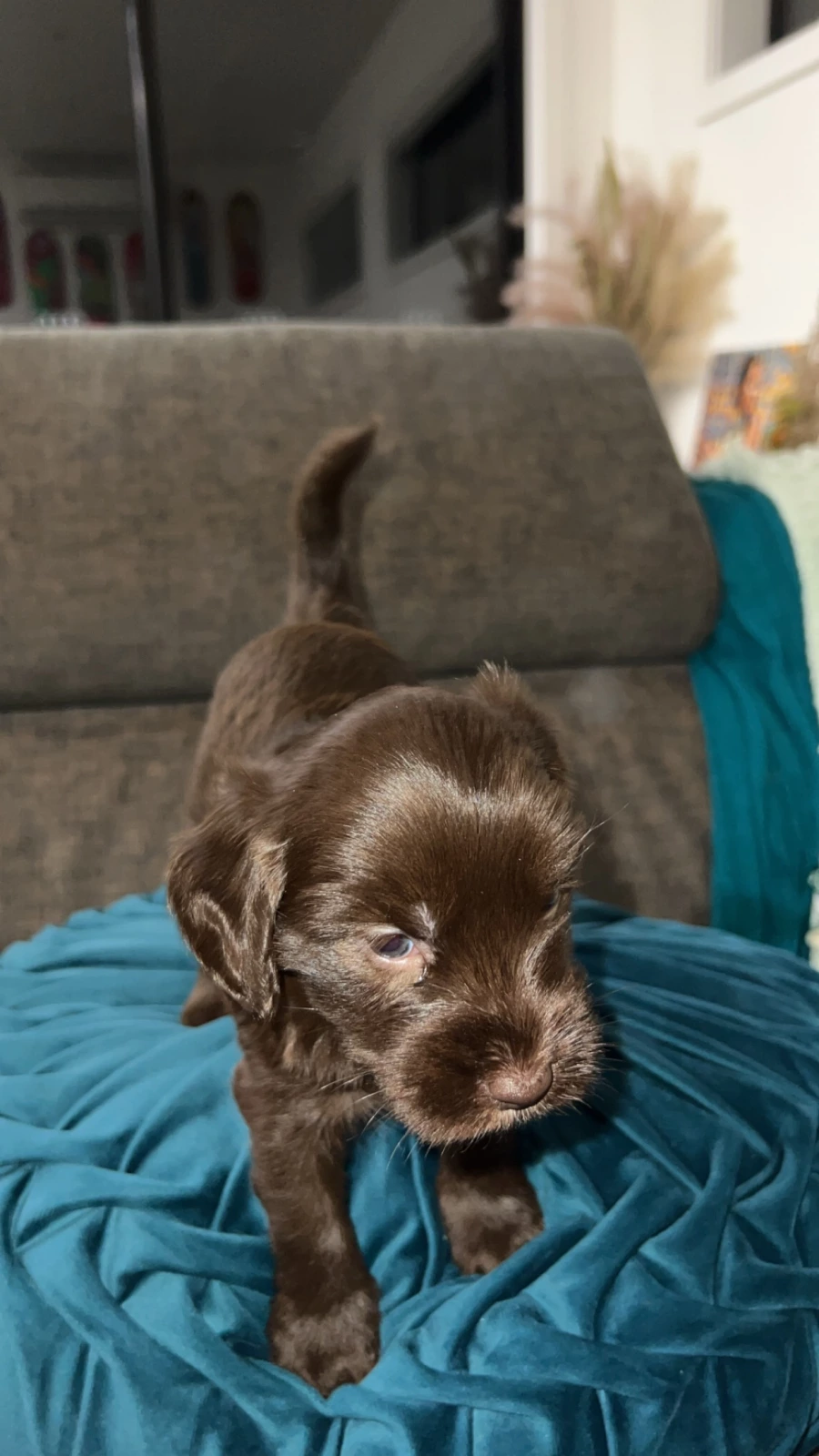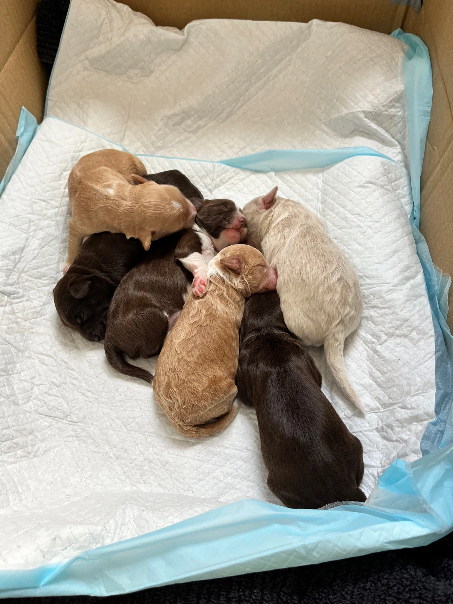 Our beautiful F1 Chocolate boordoodle had a litter of puppies on the 14/5/24 and they are ready to go to their forever homes now. The sire is a chocolate brown F1b Boordoodle, making the litter low shedding.