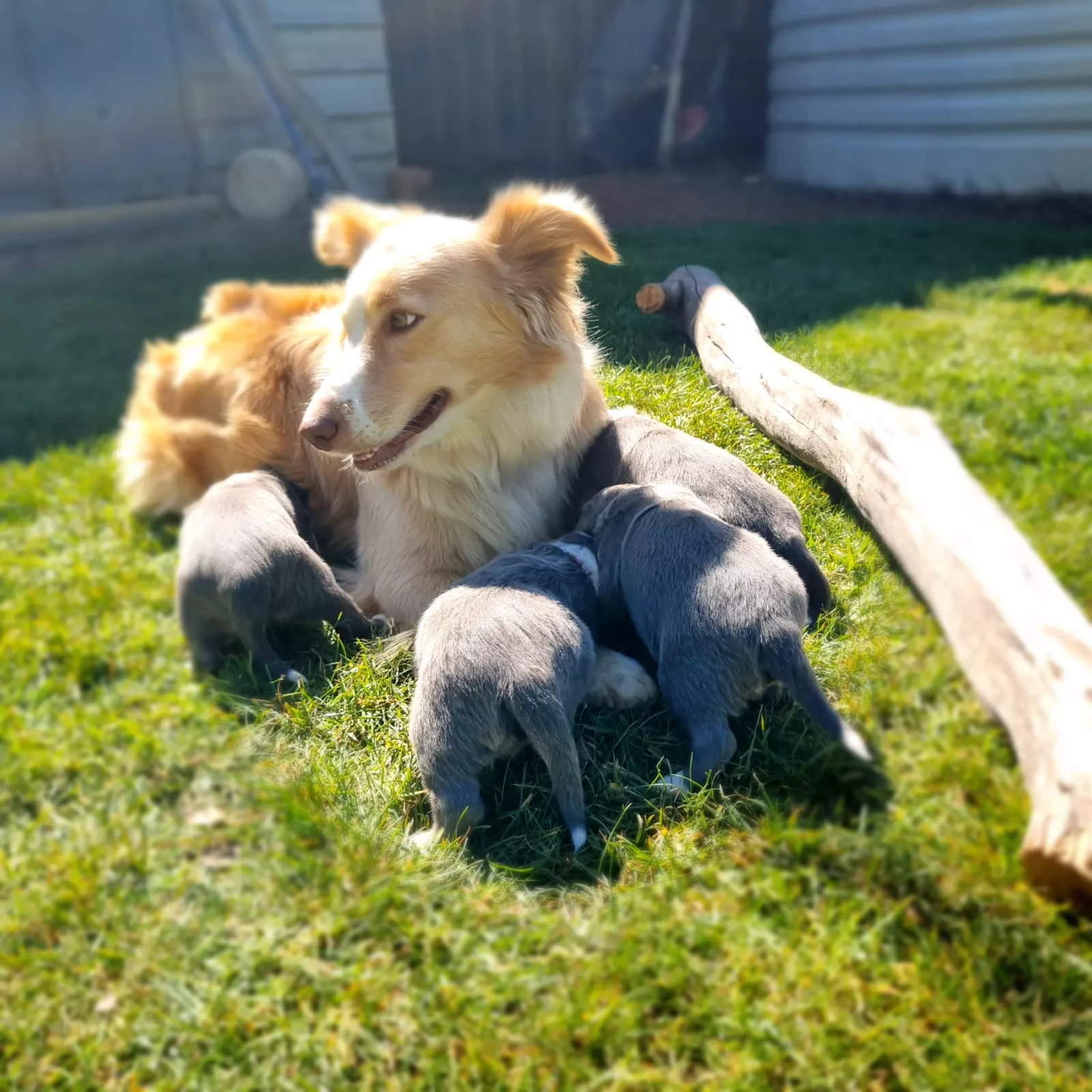 Parents have loving natures and have been raised on a farm with chickens, ducks, kids and livestock. Both mum and dad come from working farm lines. Dad (Bluey) is a super chilled long haired E1 Border Collie and Mum (Pippa) and Mum (Jordy) are loving, loyal and active medium haired Border Collies. We own all parents. All are pure bred, Blue is a pedigree certified Border.