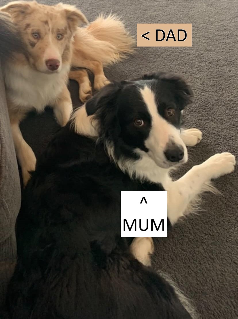 Mother is Black and White with brown eyes. Father is Lilac Merle with green and blue eyes (heterochromia). Both have had full Orivet DNA profiles done.