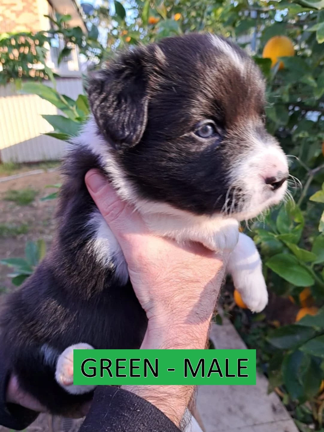 GREEN: Black & White, Male. Sweet, cuddly, playful, cheeky, loyal, very social. ($1000)