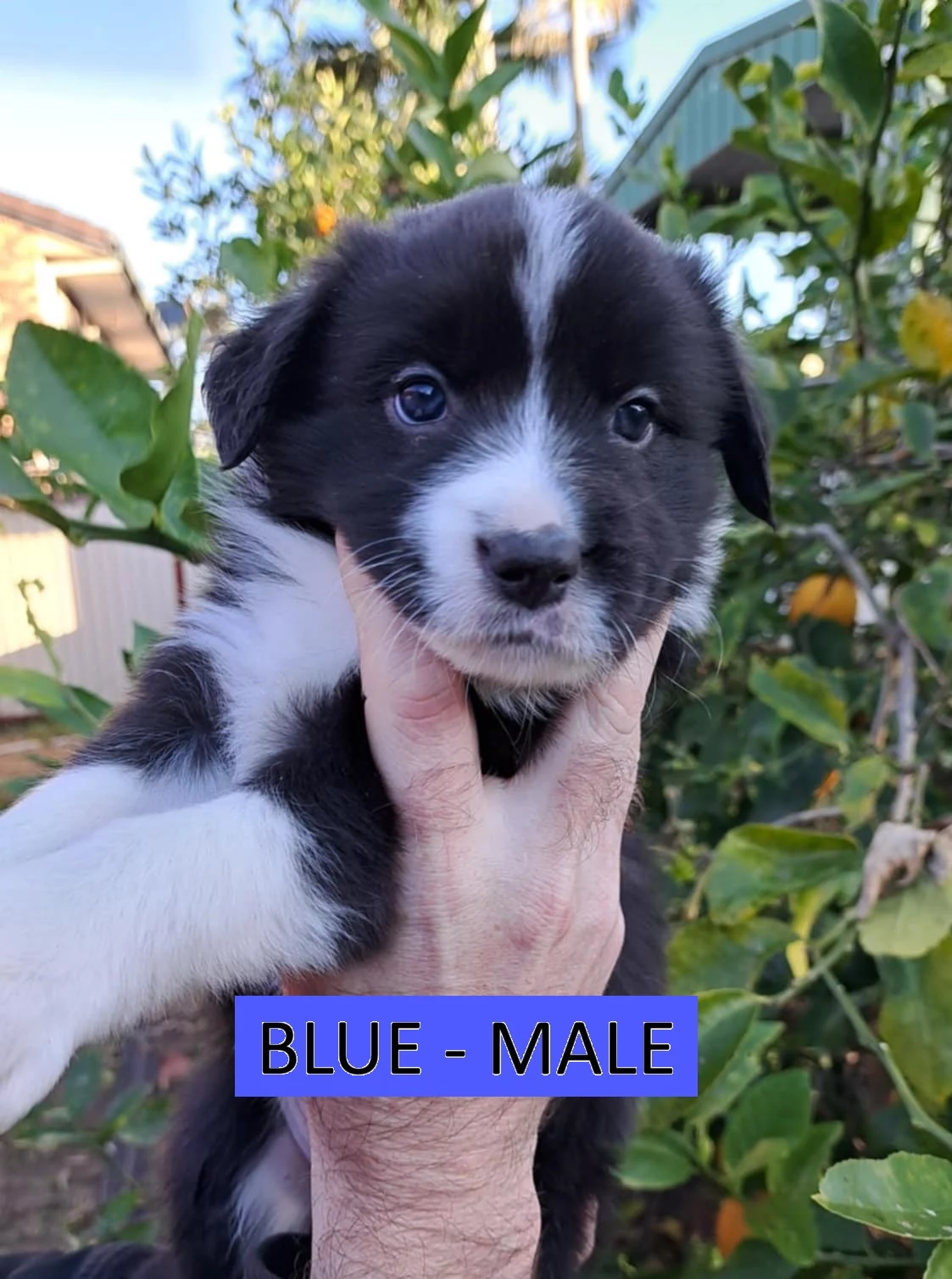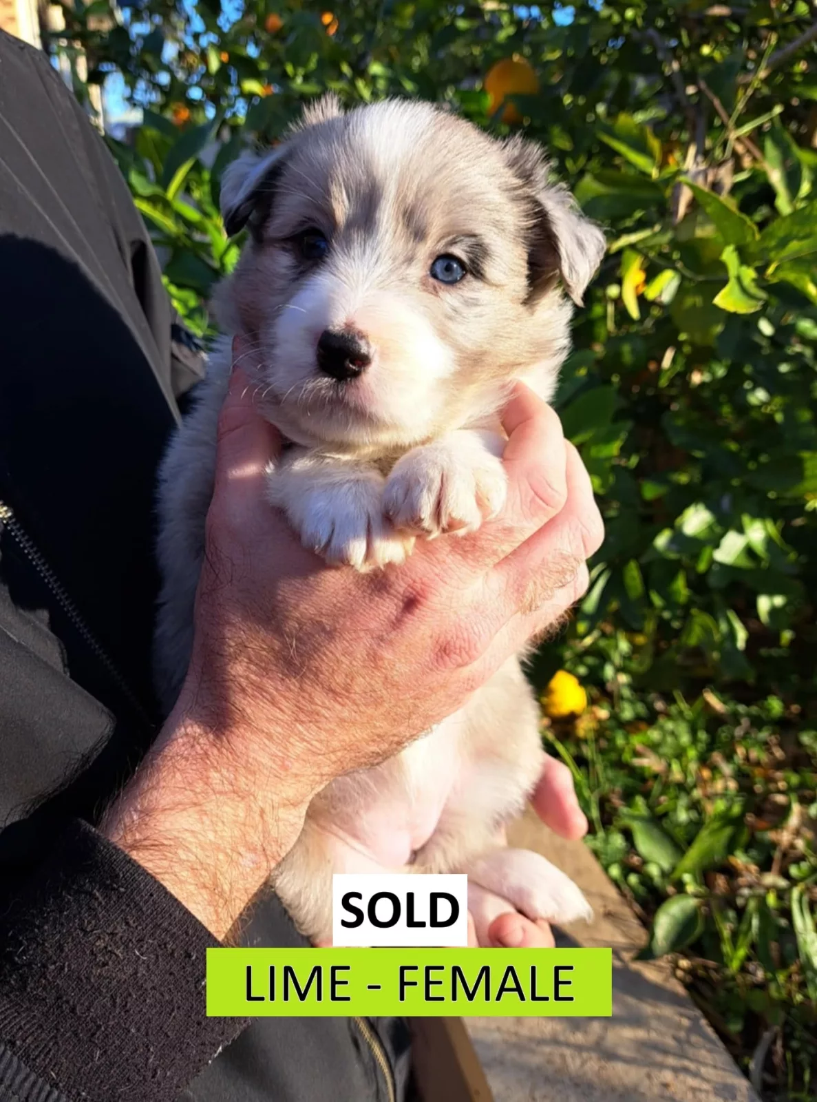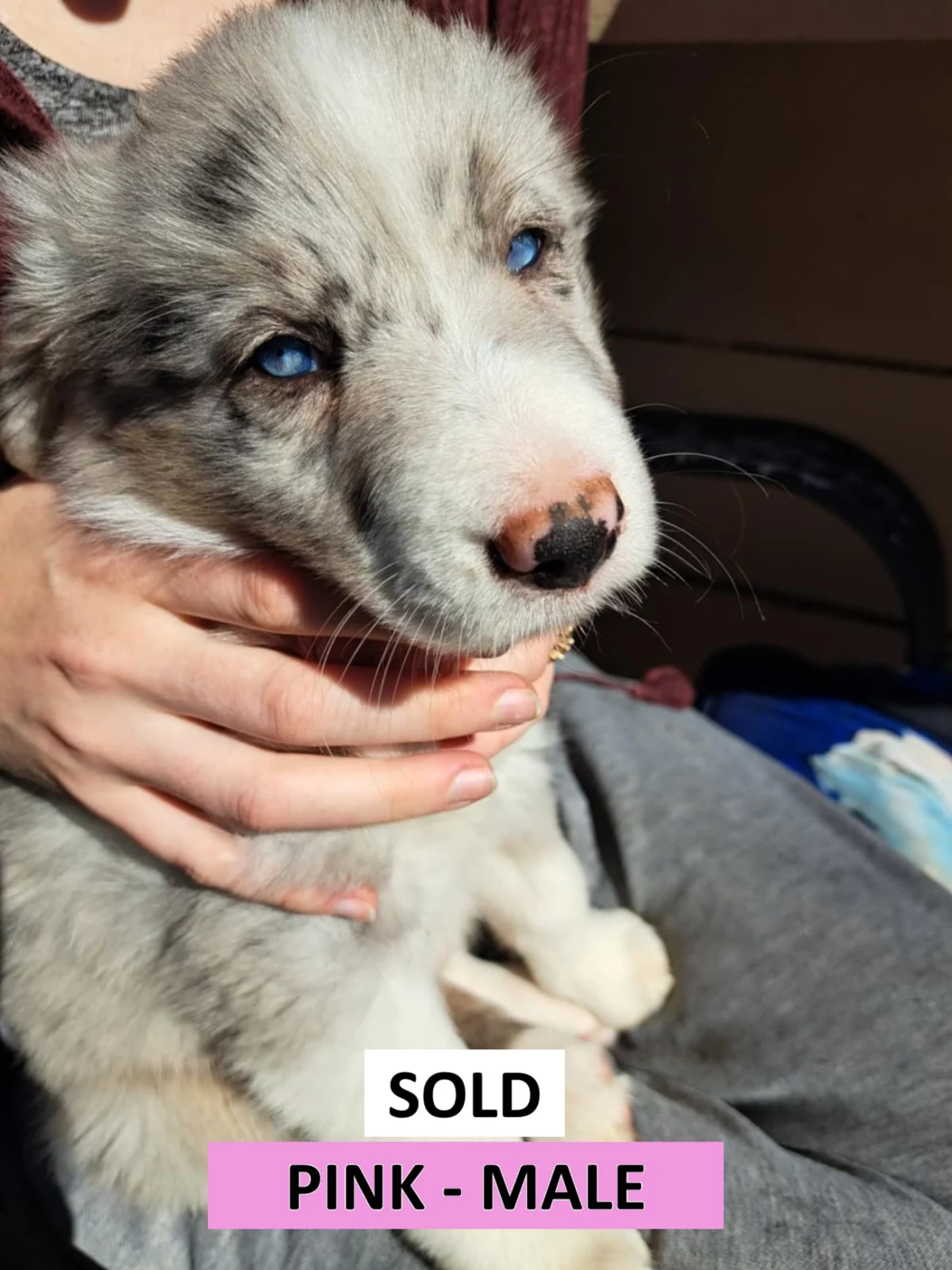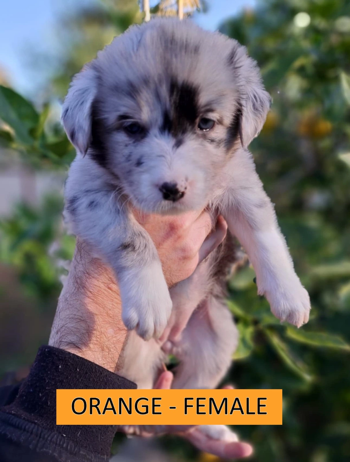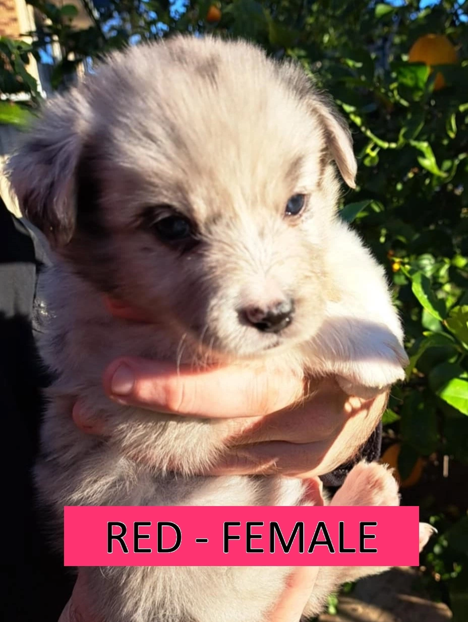 ORANGE: Blue Merle, Female. Sweet, cuddly, playful, energetic, cheeky. ($2500)