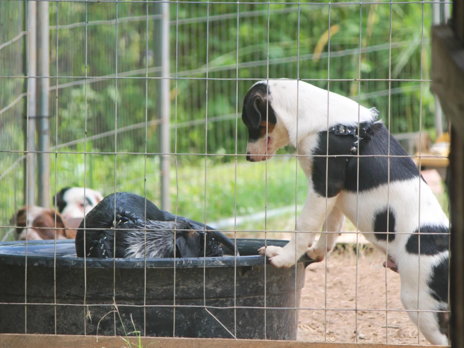 Dogs have access to: warm bedding, water at all times, ample space to exercise, natural light