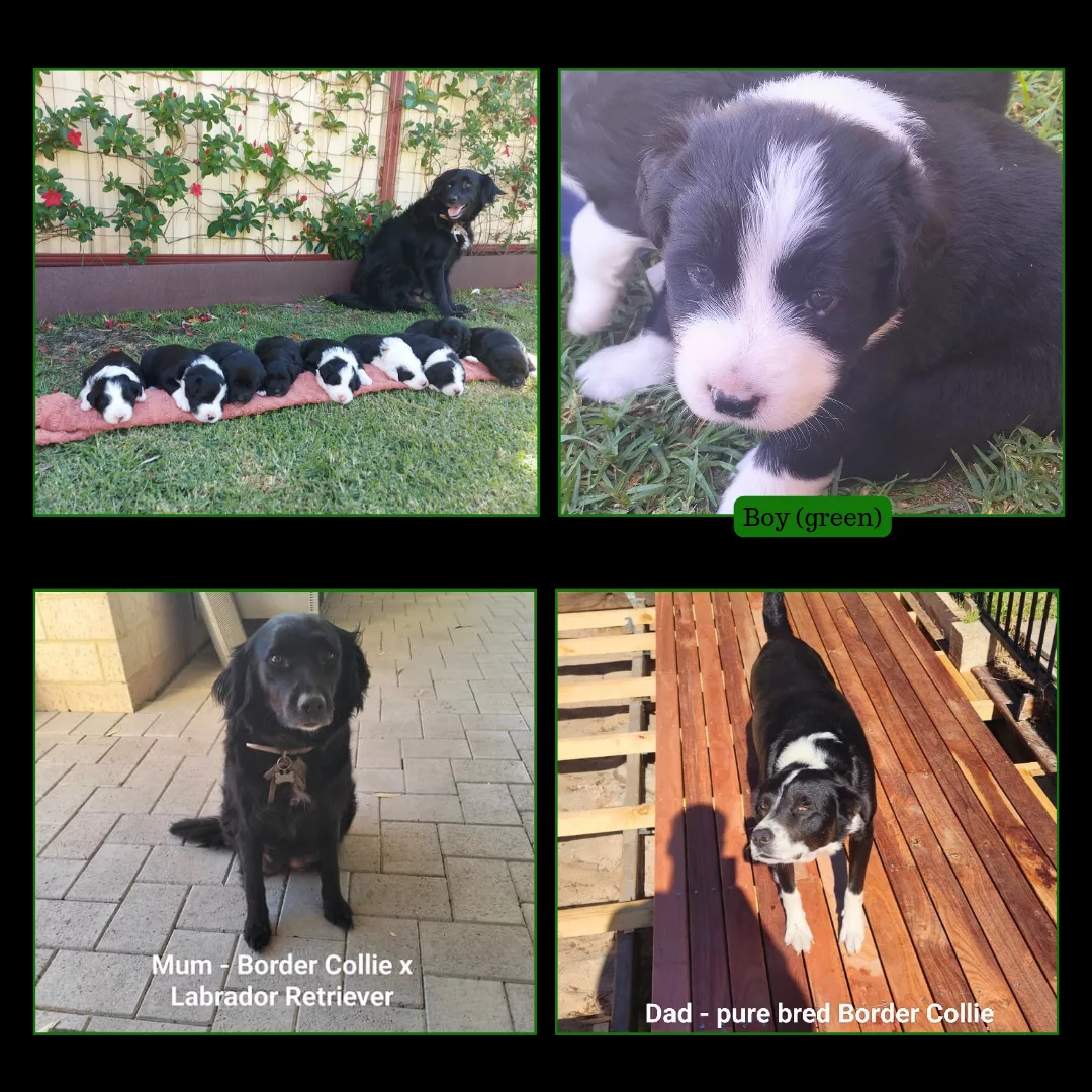 Dad is a full breed Border Collie. He's a beautiful, calm and easy dog with a short haired coat. He's a big softy who loves playing with his family who have 6 young kids.