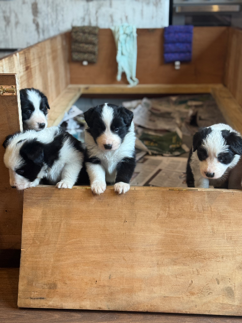 The puppies are handled often to support confidence around people.