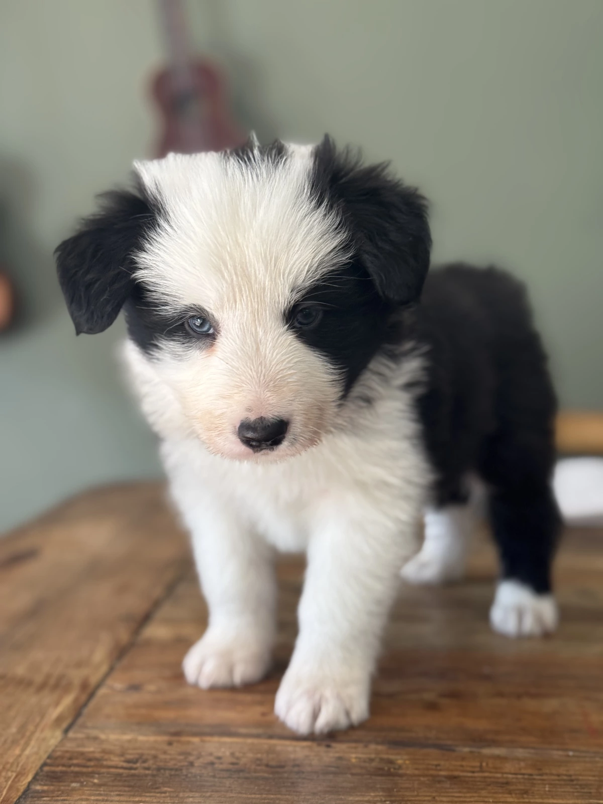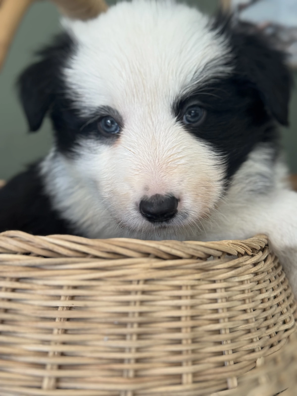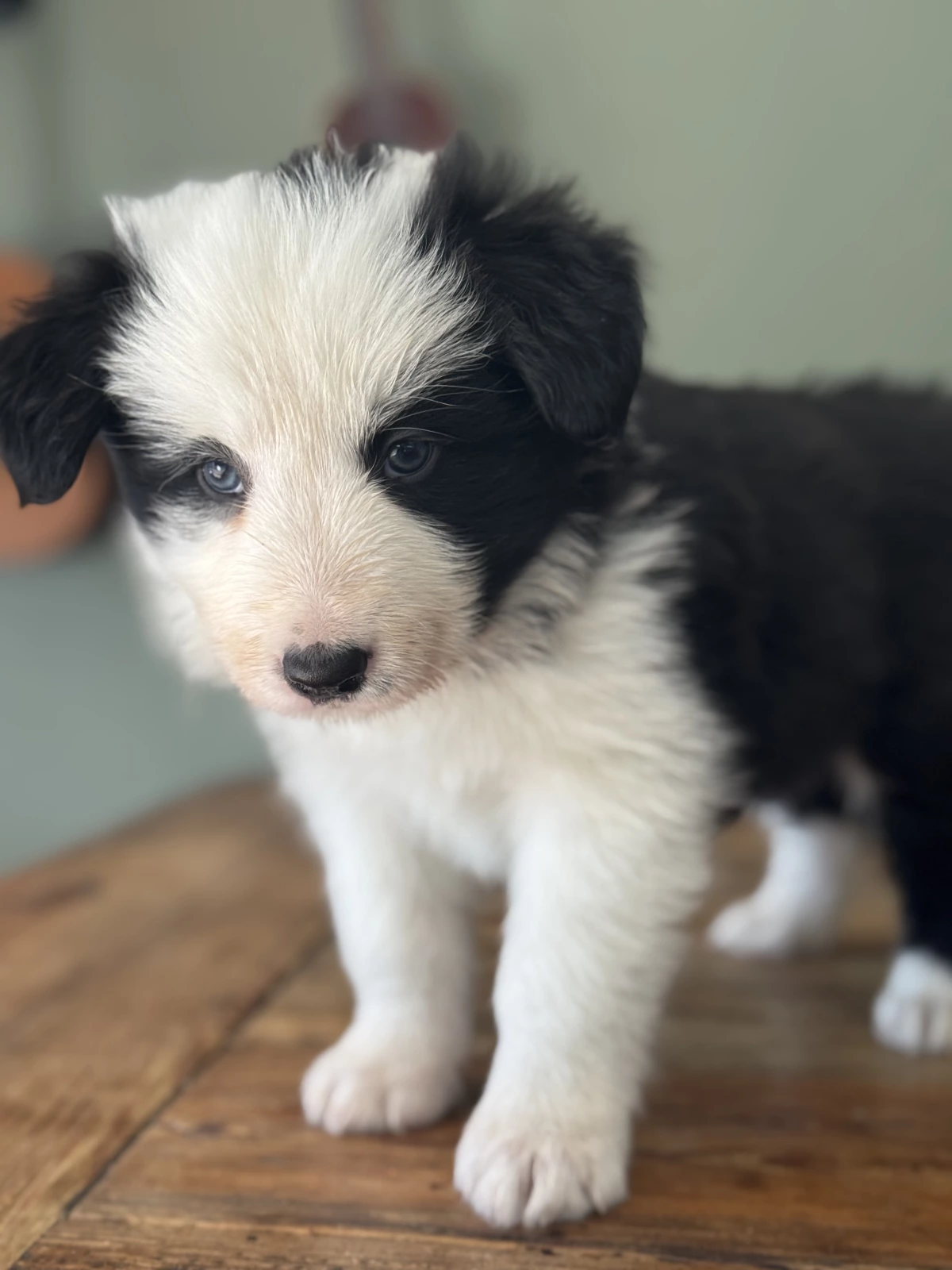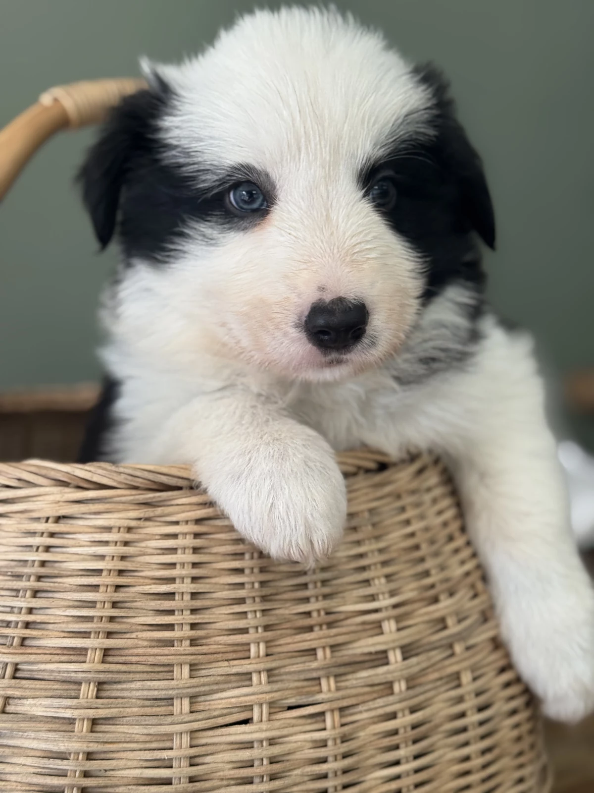 Male puppy available for $1,800. He is black and white with a spot and striking blue eyes.