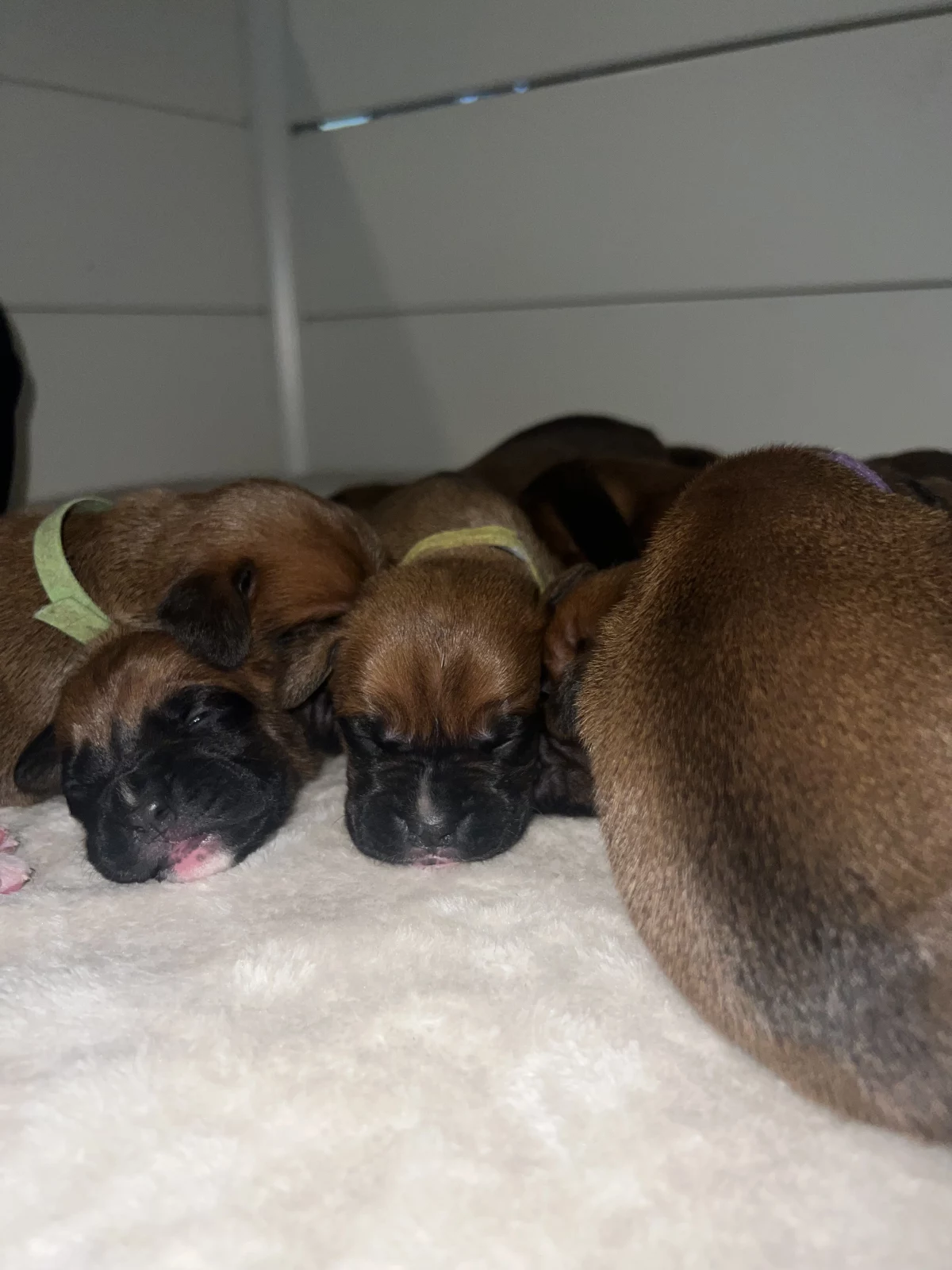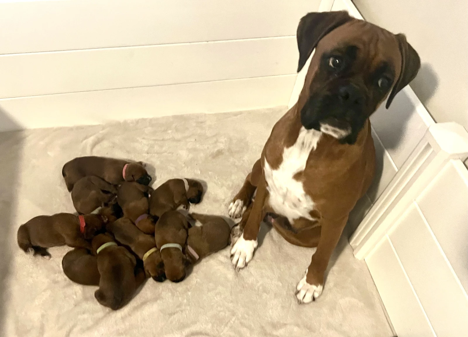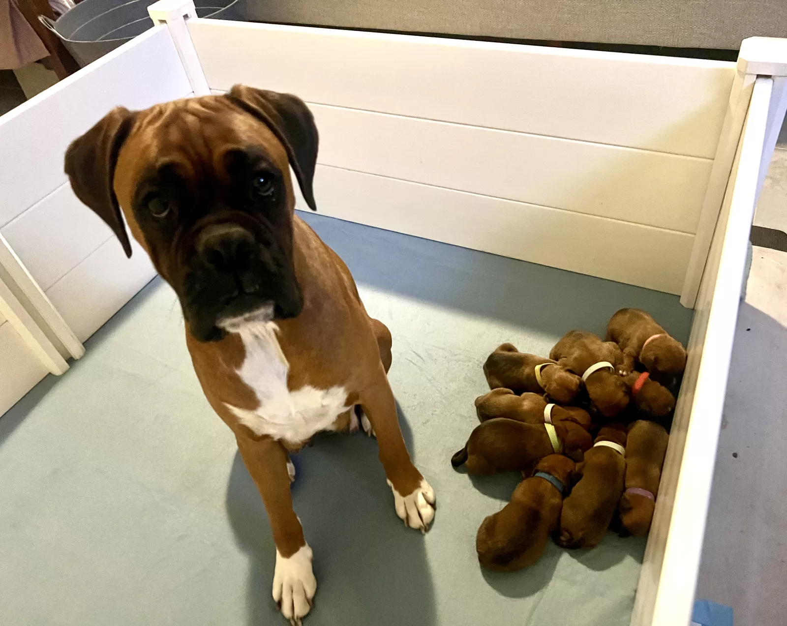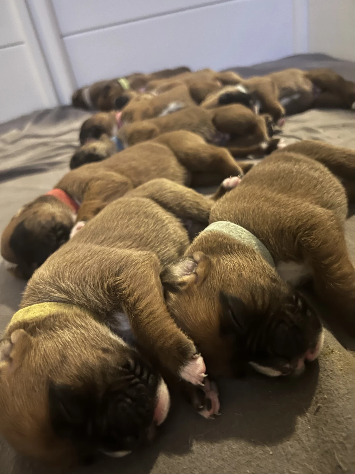 We have 10 gorgeous Boxer puppies available — 5 females and 5 males — each with their own unique charm and personality. Three have adorable natural bobtails like their mum, six have long tails like their dad, and one has a cute in-between length. Born on 17/09/24, they will be vet checked, microchipped, vaccinated, and wormed before heading to their forever homes from 12/11/24. Both parents are our family dogs — they are friendly, loyal, and wonderful with children. You’re welcome to meet mum and dad, see the pups in person, and choose the perfect companion for your home and lifestyle. Contact us if you would like to learn more.