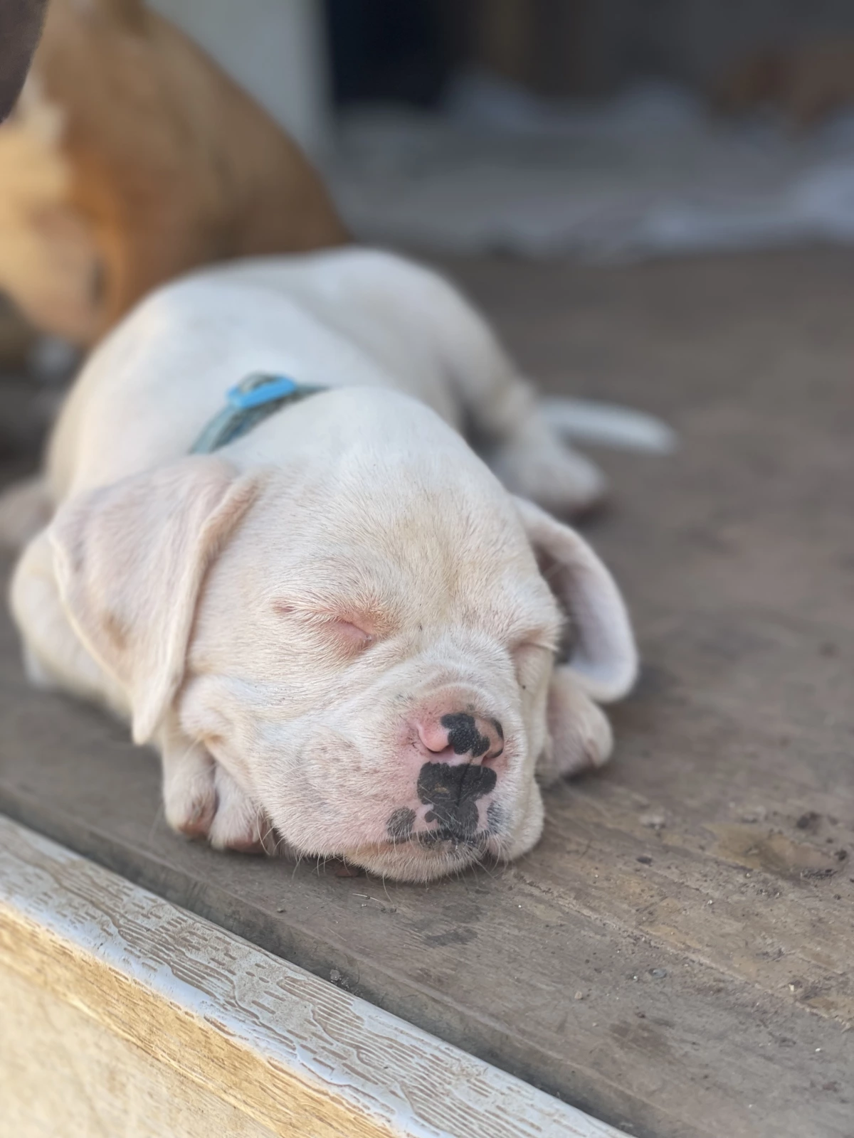 🔵 Blue Collar: White with a tan spot on his back. This charming fellow has a gentle and loving nature, making him a perfect companion for cuddles and playtime.