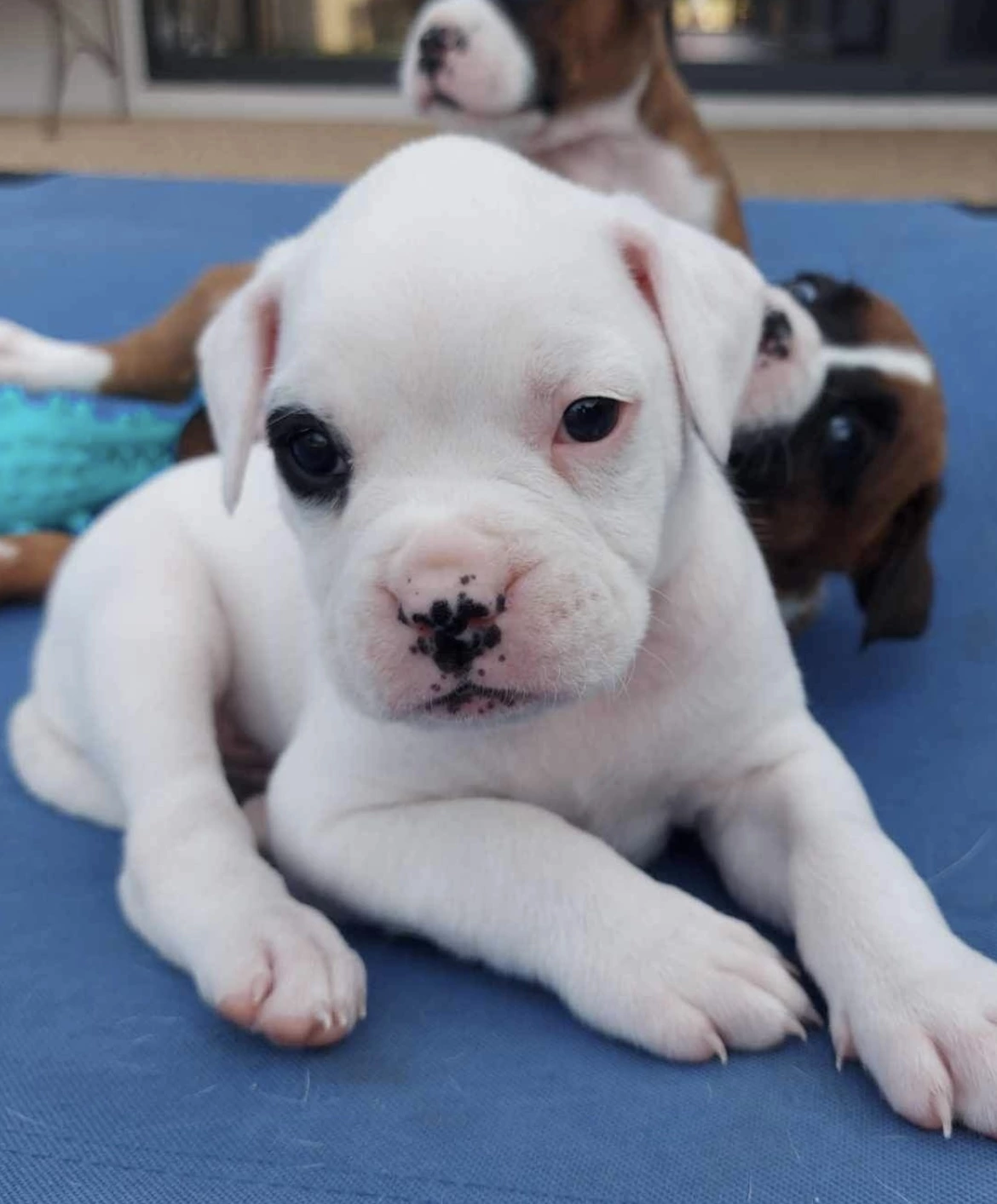 Only one beautiful male Boxer puppy remains, and he’s ready for his forever home now. Born on 8th August 2023, this charming boy is a striking white Boxer with an adorable patch over his right eye — giving him a little pirate look that makes everyone smile. He has been vet checked, microchipped, vaccinated, and wormed, ensuring he’s healthy and well cared for. Mum is a brindle Boxer, and dad is a white Boxer cross, both with lovely, gentle temperaments. This handsome pup is affectionate, playful, and full of character. Make an offer today — he won’t last long!