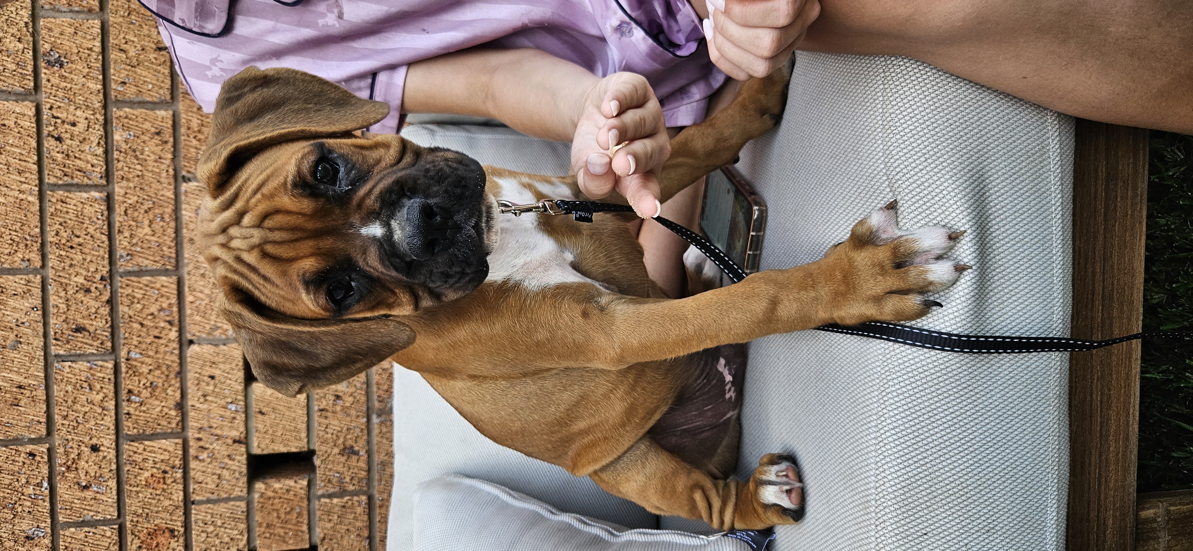 We have one stunning male Boxer puppy available — a natural bobtail with a bright, loving personality and plenty of playful energy. This purebred boy has been raised with care and attention in our family home, surrounded by children and other dogs, making him well socialised and affectionate.