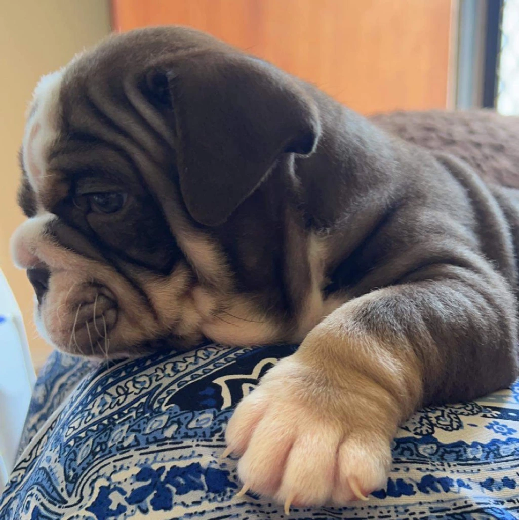 Purebred British Bulldog male available—9 weeks old and ready to find his forever family. This stunning choc tri boy is a big, strong pup with a gorgeous coat and an affectionate nature. He has been wormed, vaccinated, and microchipped, and has been raised in a loving home with plenty of handling and care. His playful yet gentle personality makes him a perfect companion for families or individuals looking for a loyal, people-loving dog. The photos truly don’t capture how handsome he is—you’ll fall in love once you meet him in person. He’s healthy, social, and ready to settle into a home where he’ll be part of the family. Genuine enquiries only—come meet this beautiful boy today.
