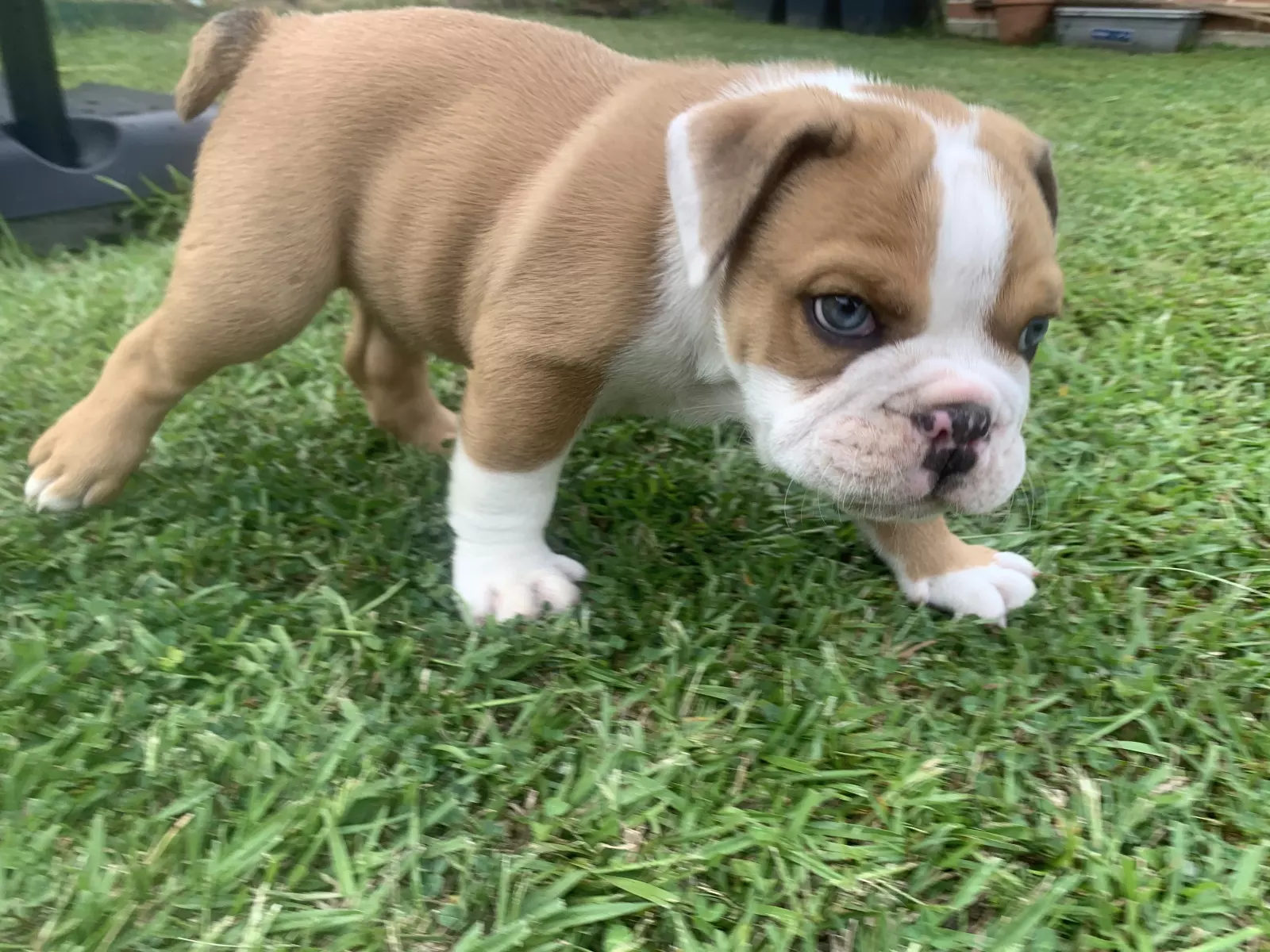Adorable 7-week-old male purebred British Bulldog puppy available soon to a loving home. He will come registered with Master Dog Breeders and Associates (certified pedigree), giving you peace of mind about his quality lineage. Before going to his new family, he will be fully microchipped, vaccinated, and health checked to ensure he’s strong and thriving. This little boy has been raised in a caring home environment, handled daily, and is already showing his sweet, affectionate nature. British Bulldogs make wonderful companions—loyal, calm, and great with children or families who enjoy a relaxed lifestyle. Pickup or delivery can be arranged to suit the new owner. Genuine enquiries only, looking for a caring forever home for this beautiful pup.