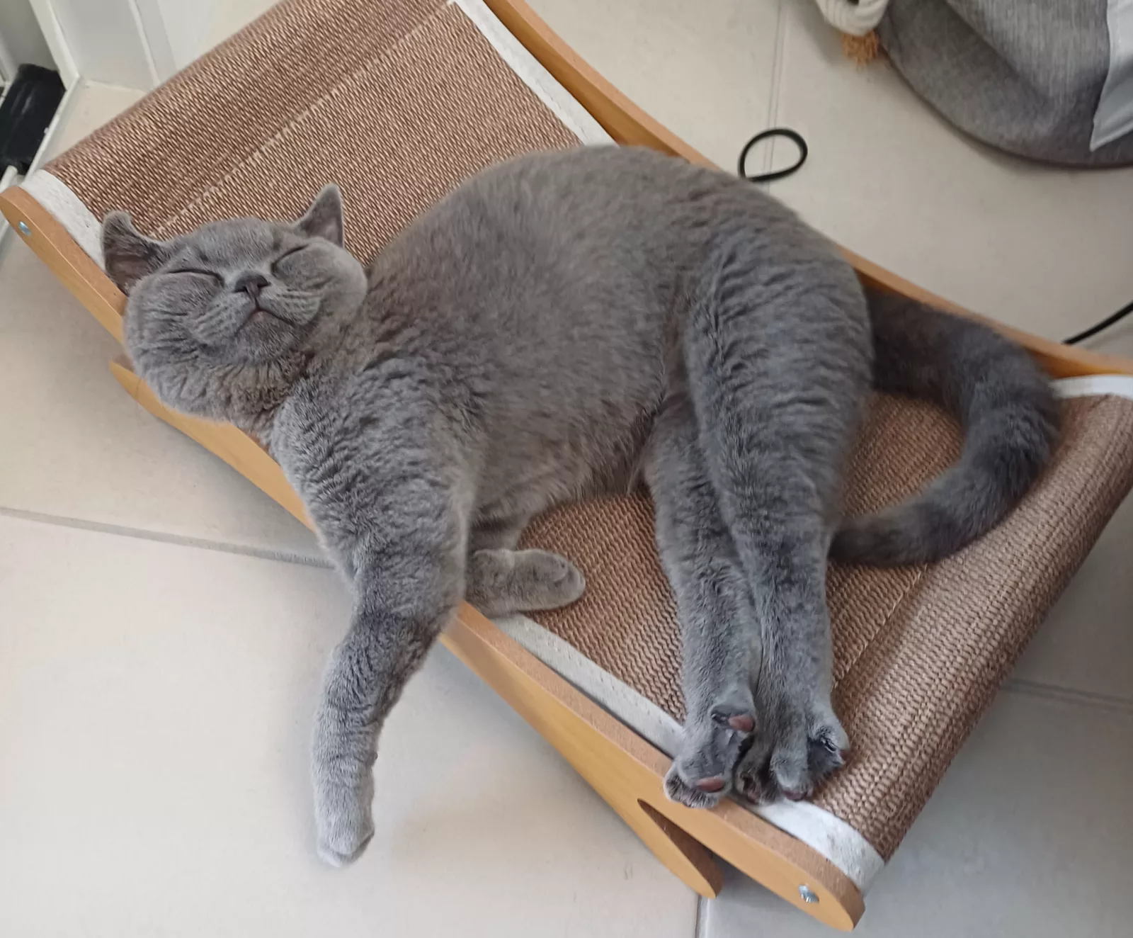 He eats wet and dry food, loves to play with kids and his toys, running in the hallway area, climbing on his scratching post and more.He sleeps on the living/bedroom area and he likes to exercise and get some fresh air in the back garden.