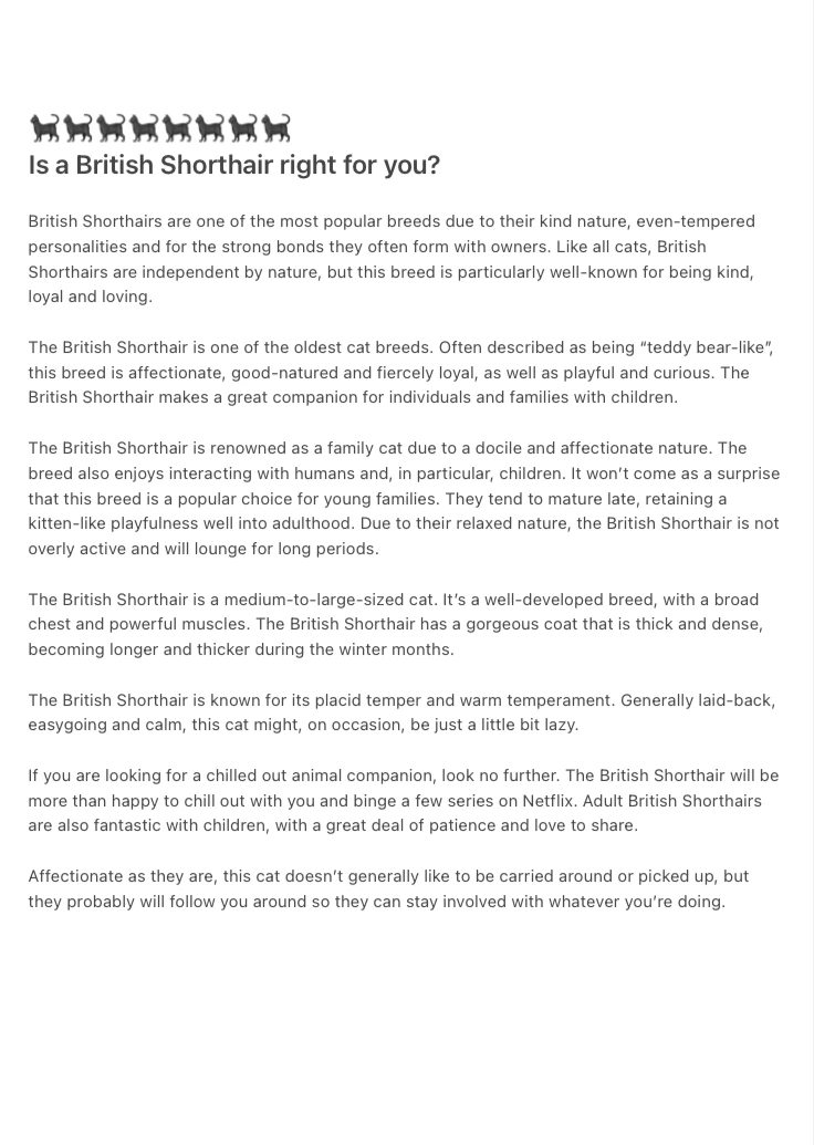 One of the most popular cat breeds in the world, the British shorthair makes an ideal family cat and enjoys being with their owners, When it comes to temperament, they are hard to beat: They're active without being boisterous, they're affectionate without being clingy , and they're extremely intelligent.