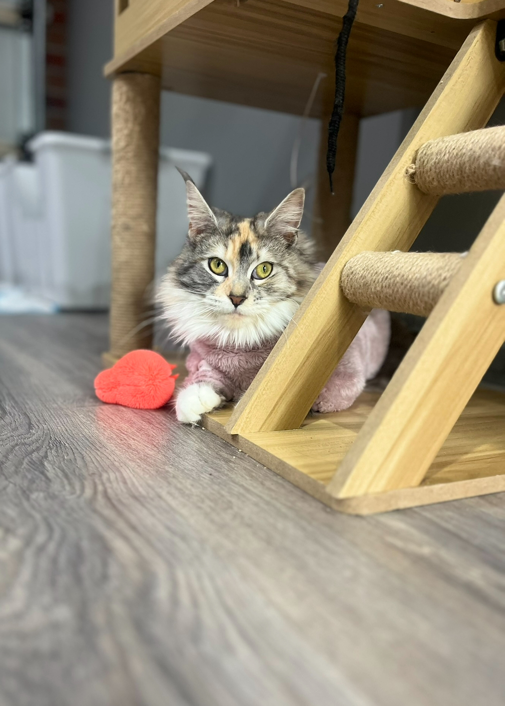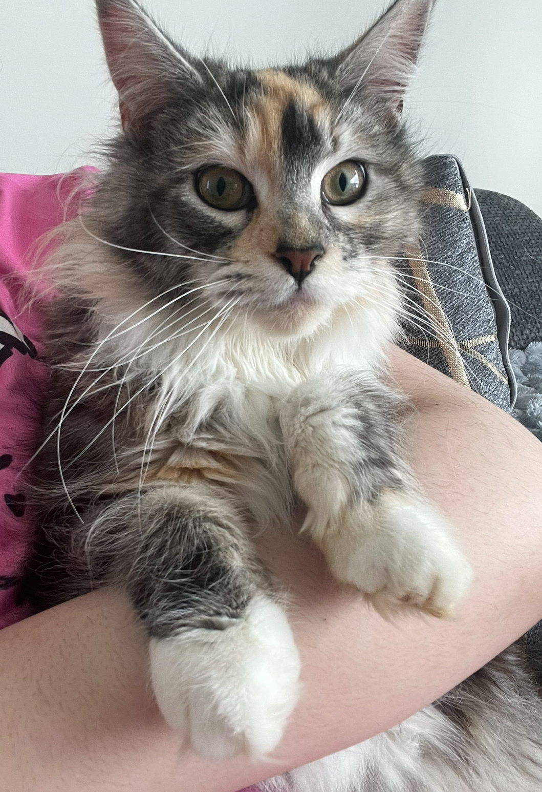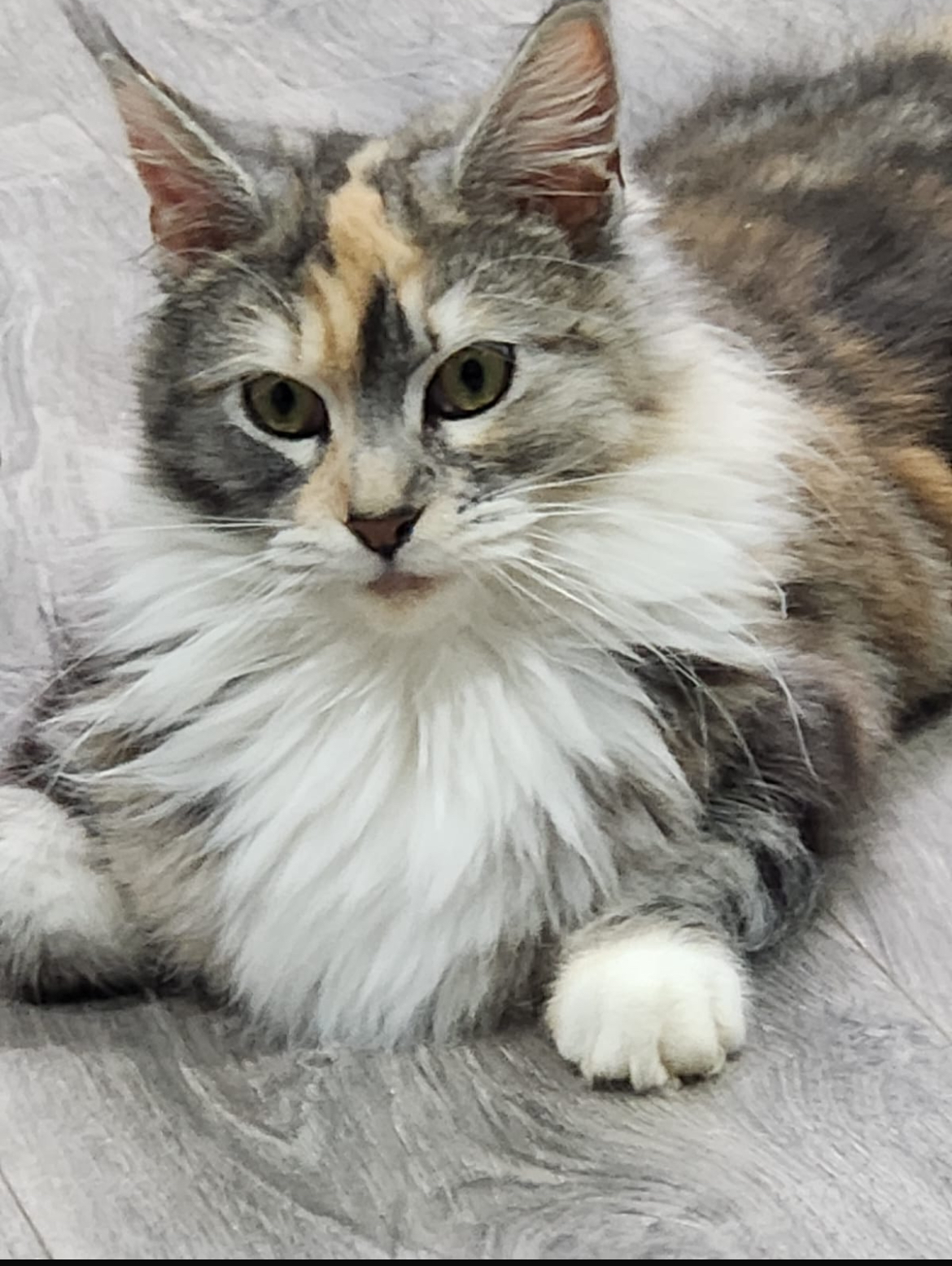 Meet our young stunning tortie girl β a true showstopper with her rich colours, fluffy coat and sweet, gentle nature. She has the classic Maine Coon features with a majestic presence and loving personality, making her the perfect companion for a forever home πΎπ