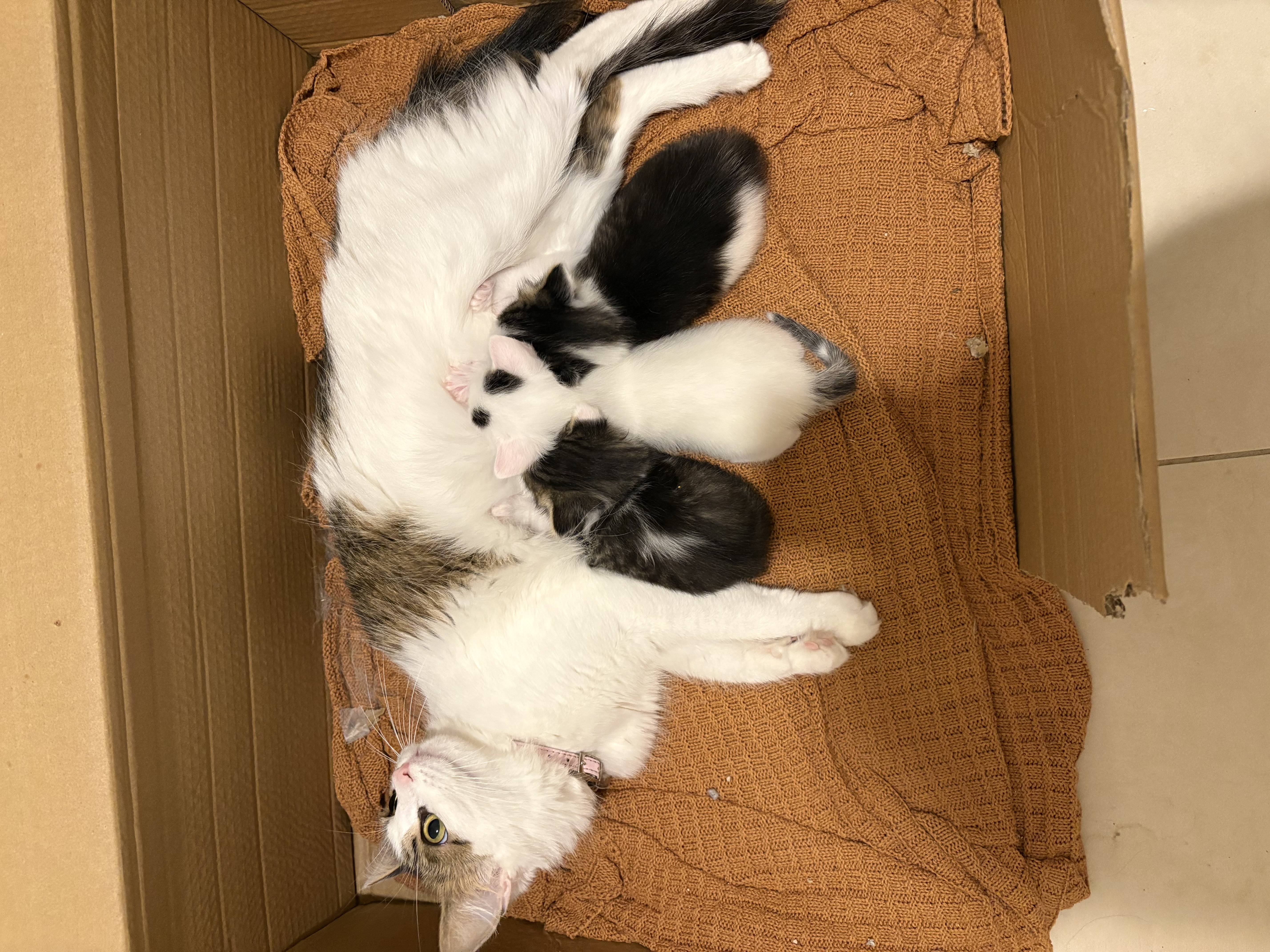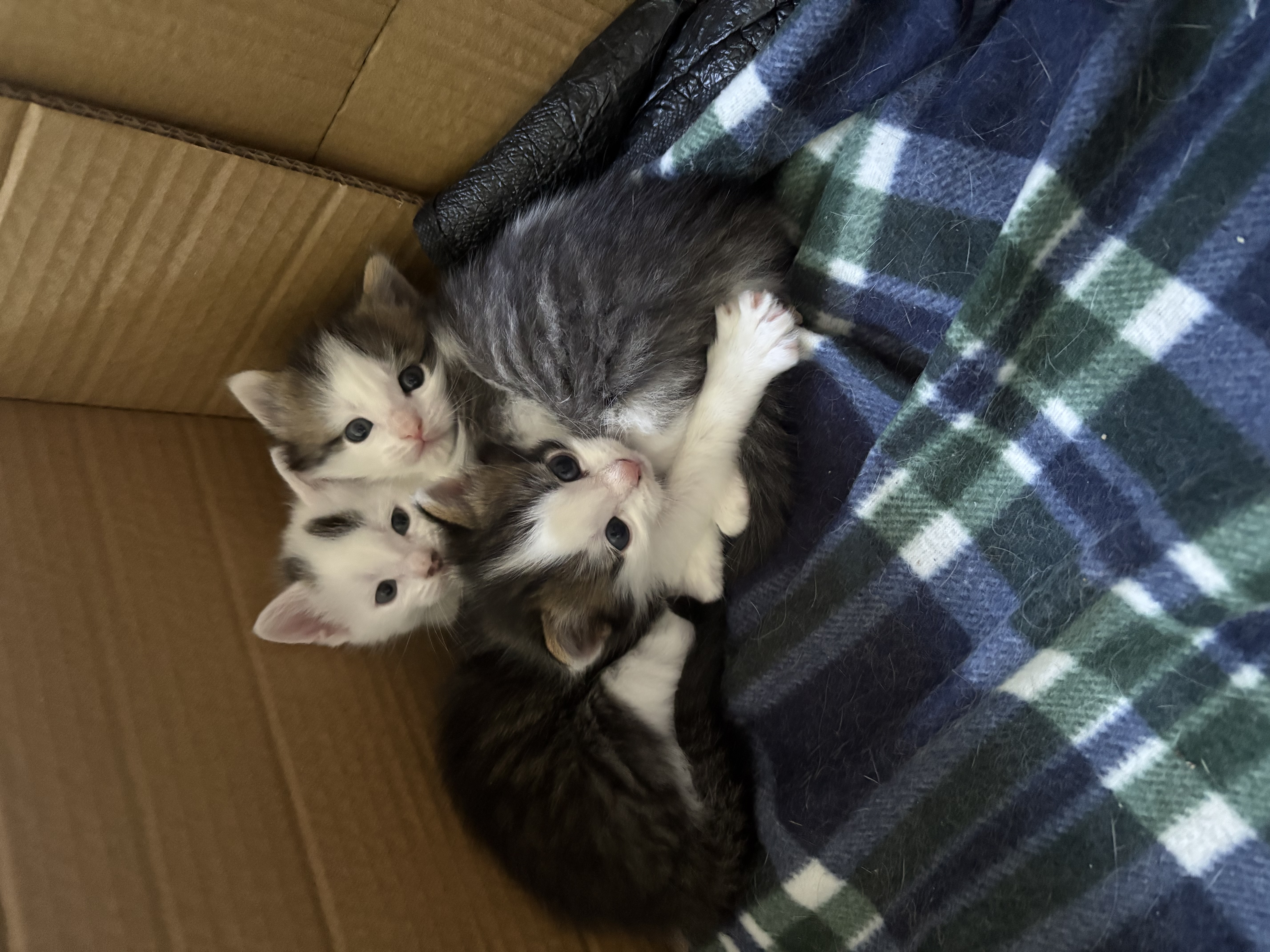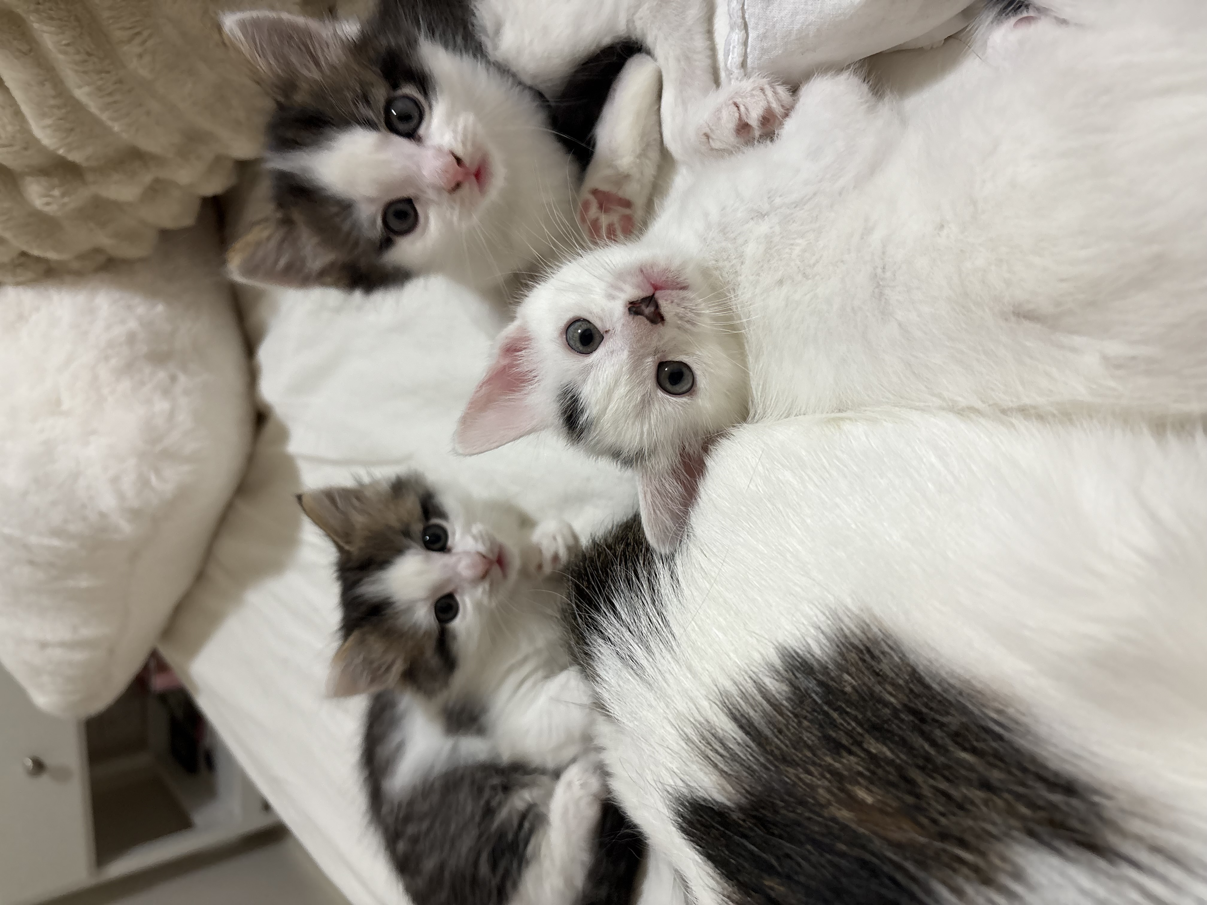 2 kittens for sale, 1 black and white boy and 1 white girl with two black spots and a black tail.