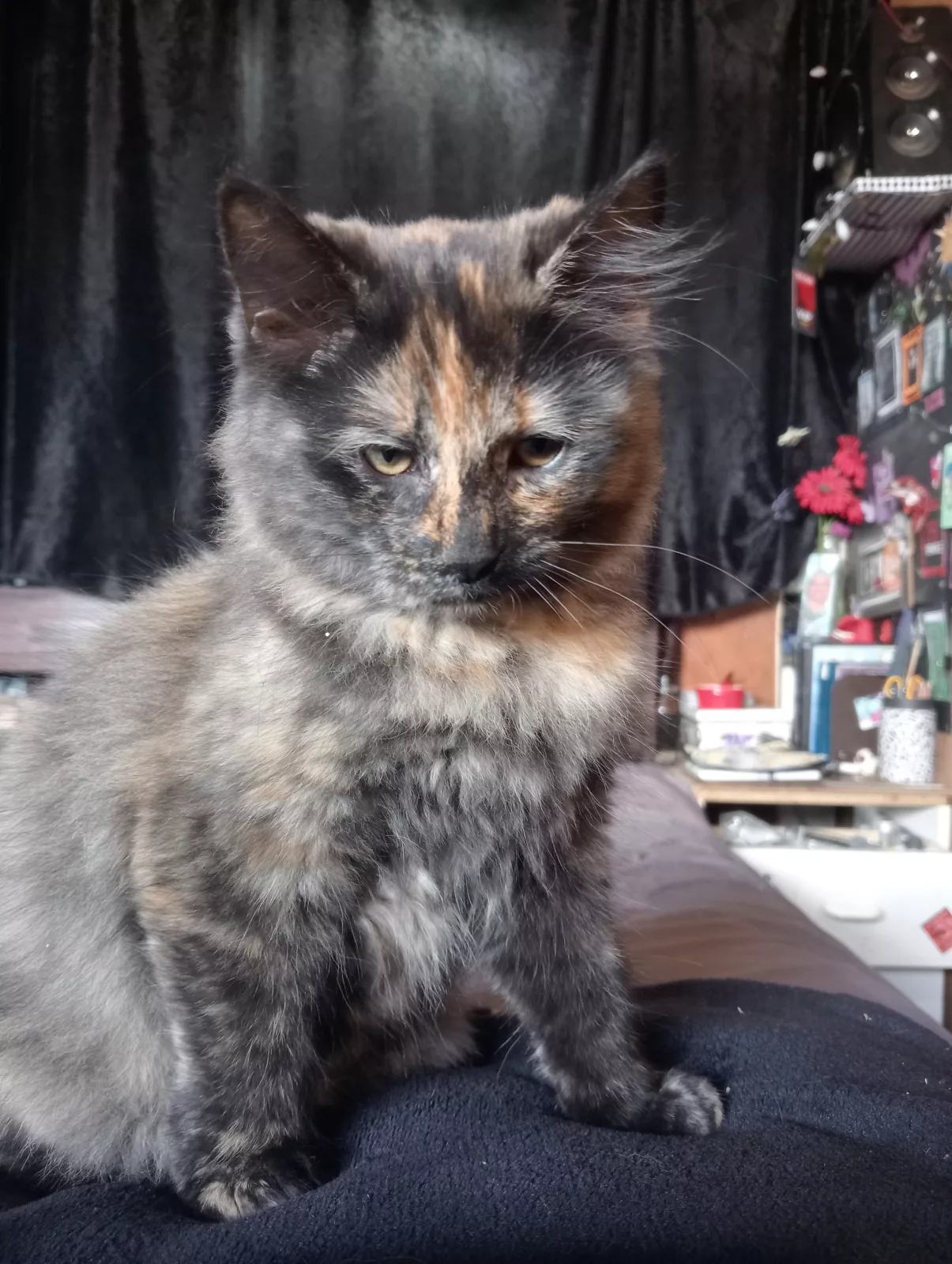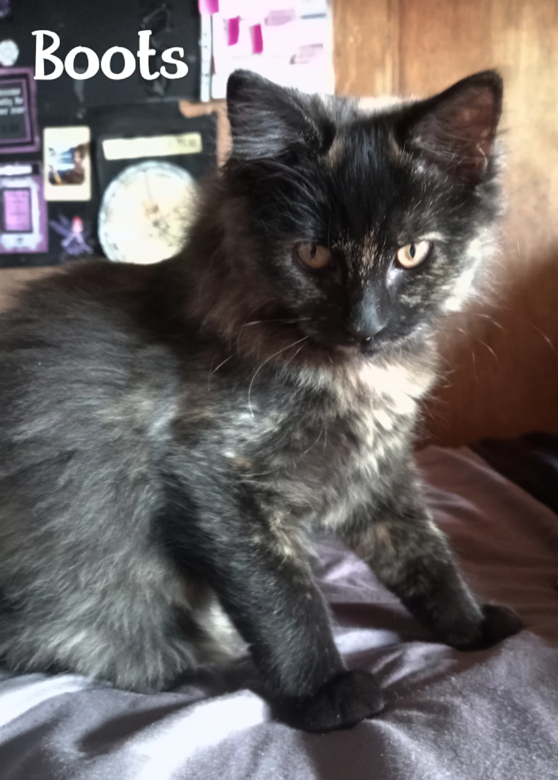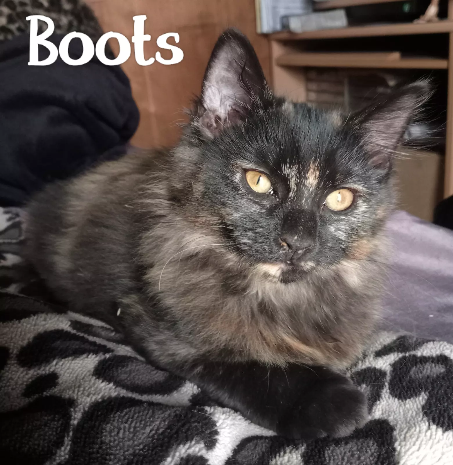 A bit of a lone cat, Boots doesn't mind being away from all the attention. She'll quietly cuddle up to you for pets and with fur as soft as hers, you'll want to. You'll most often find her curled up around a pair of boots or playing with your feet!