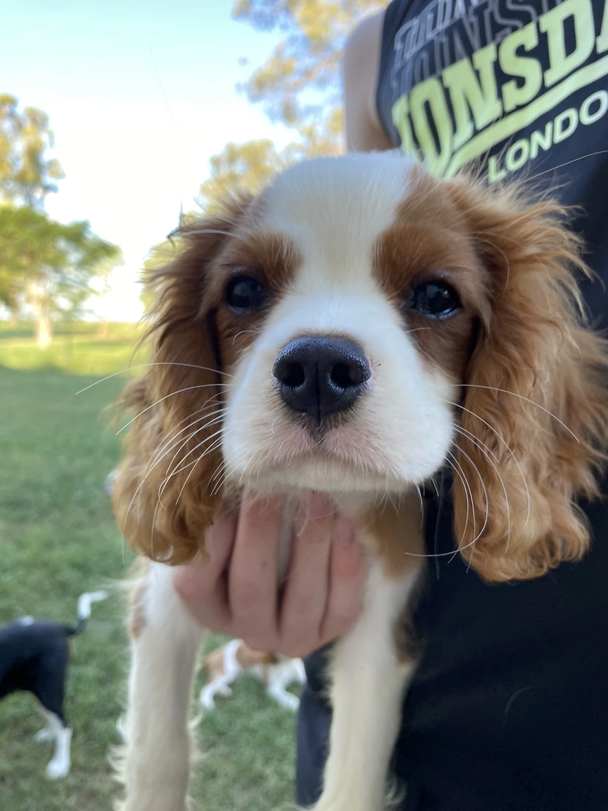 There are four Blenheim males and one tri-colour male in the litter. Each puppy is full of personality, affectionate, and playful, with the gentle and loving temperament Cavaliers are so well known for. They have been raised in a family environment and are well acclimatised to children and cats, making them confident and adaptable companions.