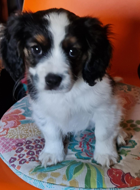 BLACK & WHITE MALE CAVALIER/PAPILLON X WITH COUPLE BROWN MARKINGS ON FACE