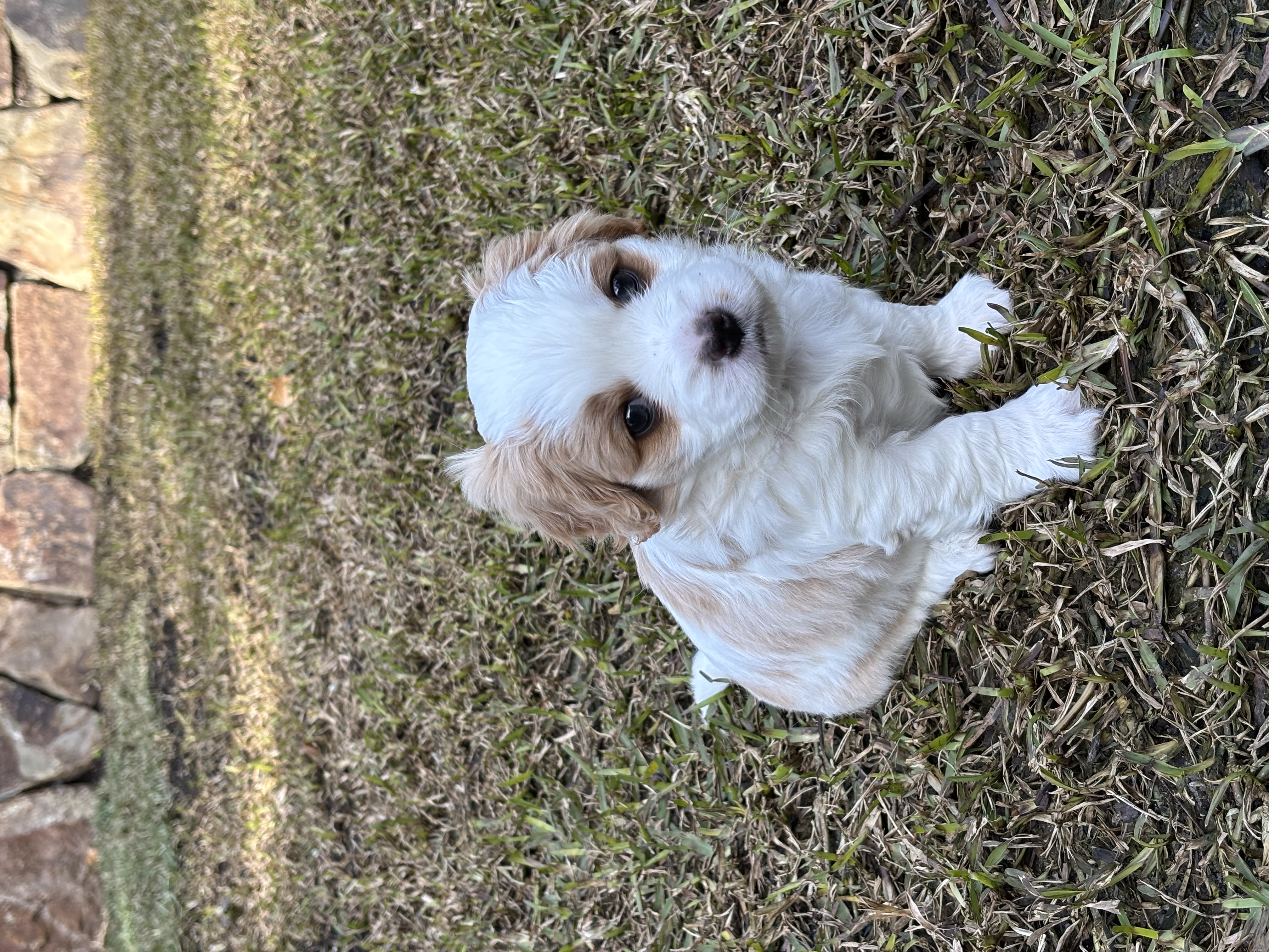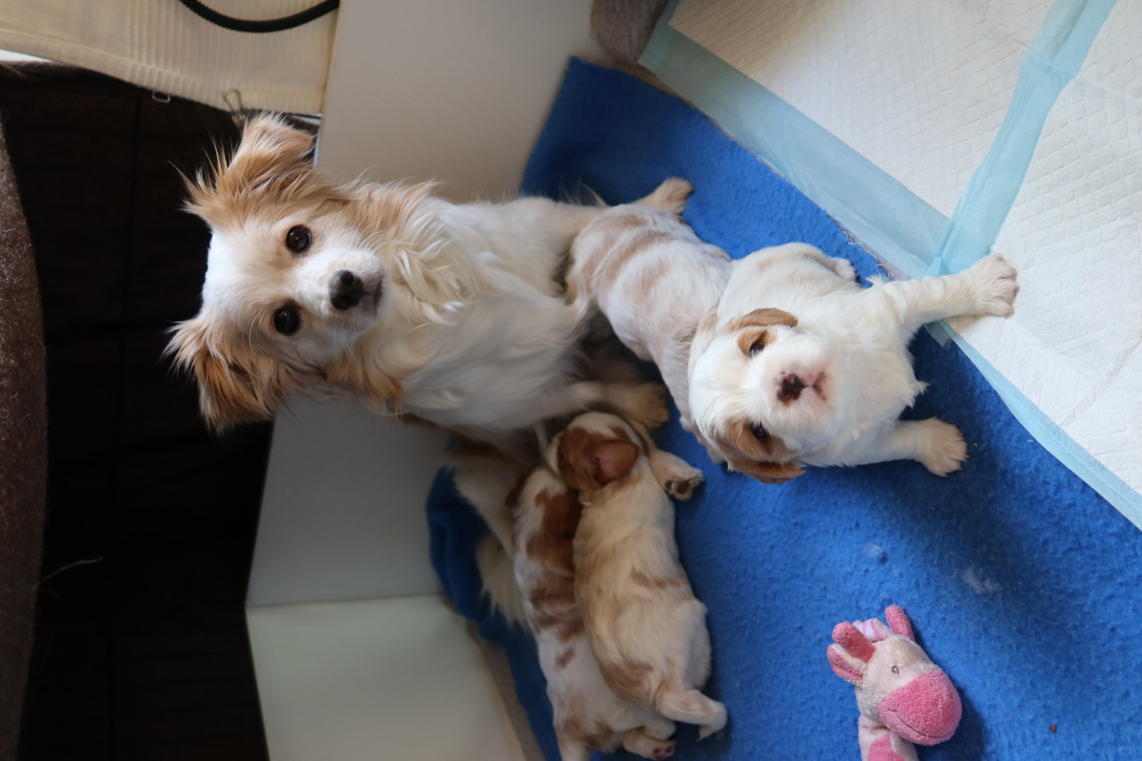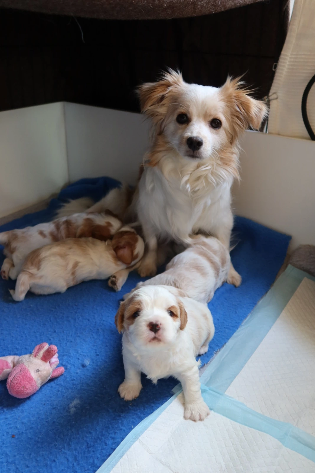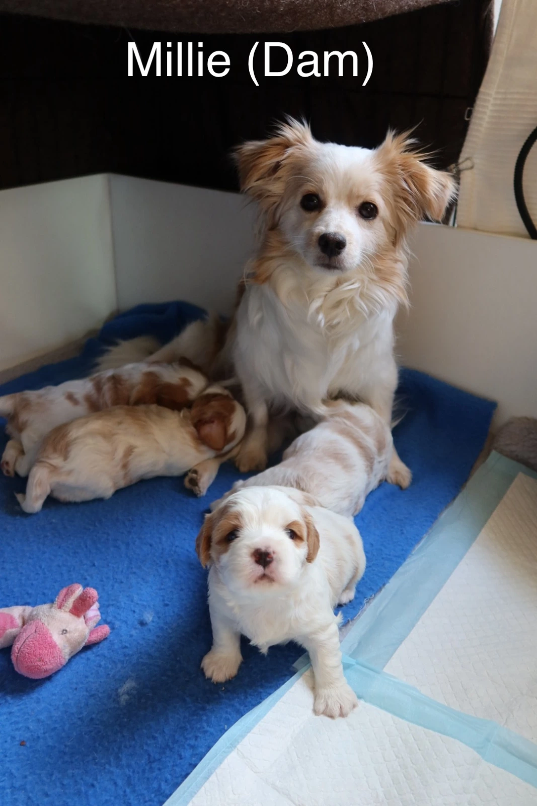 The puppy’s mum is Millie, our family dog. A beautiful and healthy three-year-old Japanese Spitz x Cavalier King Charles Spaniel/Maltese hybrid, white and cream, 7kg. The puppy’s dad is Bently, a pedigree Cavalier King Charles Spaniel, white and Blenheim, 7kg. He carries new bloodlines (Dam imported from New Zealand). DNA CLEAR for DM, EF, DE/CC, ADAMTS3. Single copy CM. AG Protective heart gene carrier. Bently is a healthy male and has no signs of other serious health issues including his parents. Photos of Millie and Bently attached.