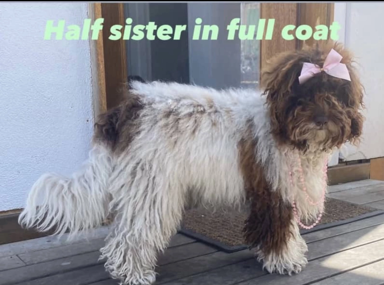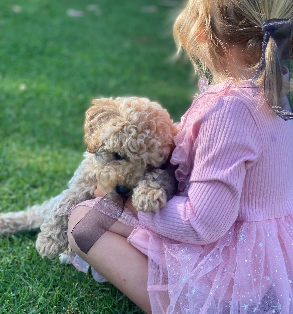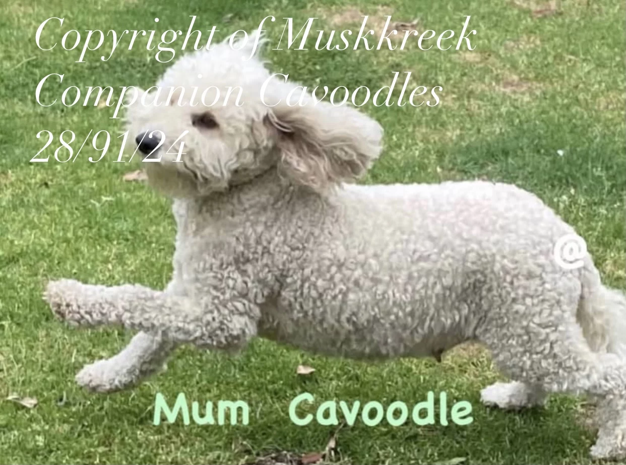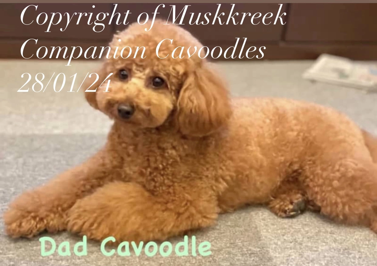 Both parents are curly Cavoodles (¾ Poodle, ¼ King Charles Cavalier), giving him a lovely soft, low-shedding coat and a calm, people-focused temperament. Cavoodles are known for being intelligent, easy to train, and great family companions.