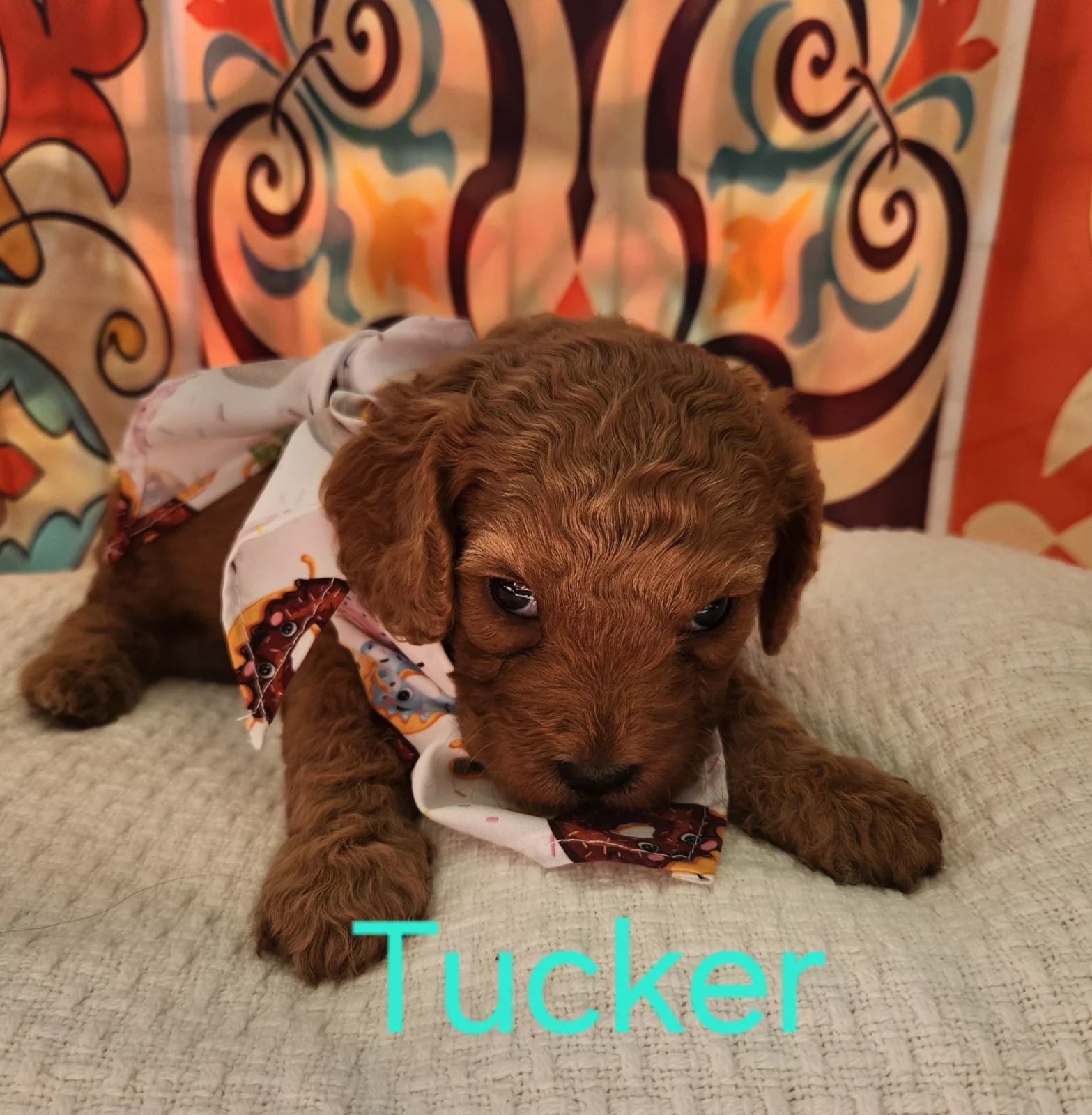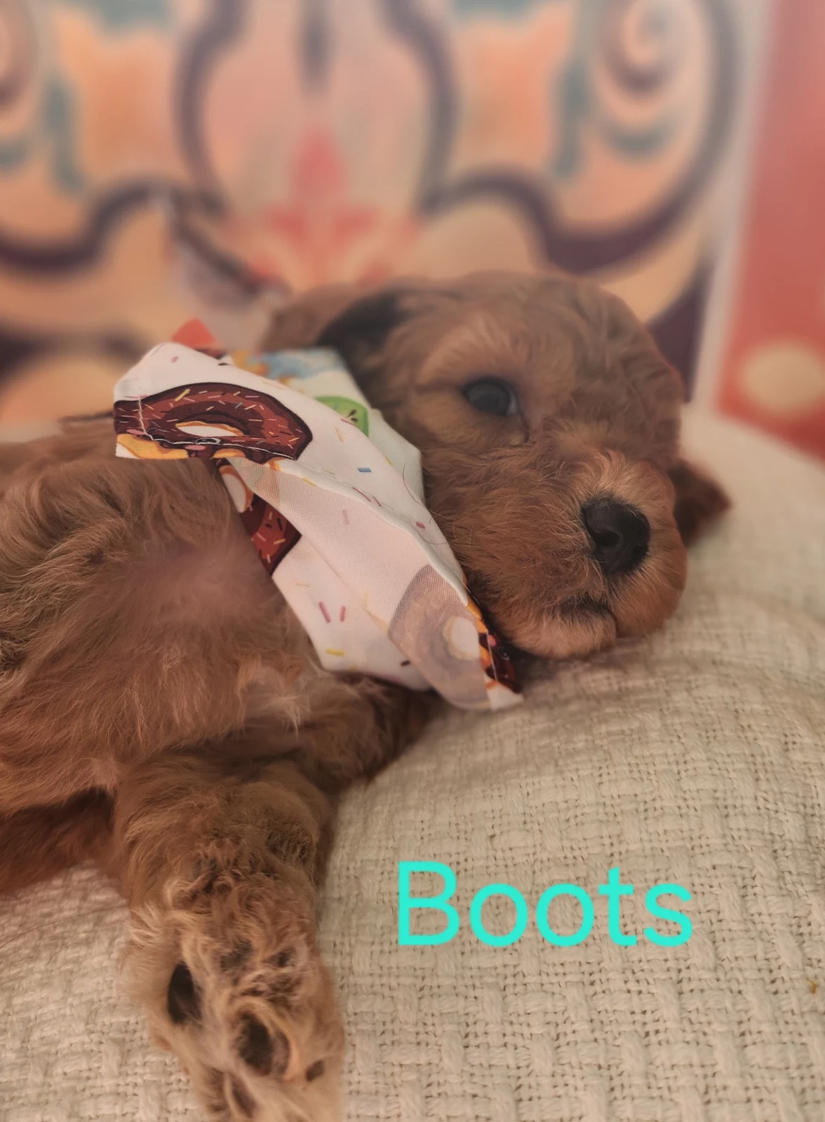 Our puppies begin their journey in life on a little hobby farm surrounded by cows, sheep, goats, chickens, a pig and our other beautiful dogs. This helps them to get used to different noises and to be well socialized before they go to their new forever homes.