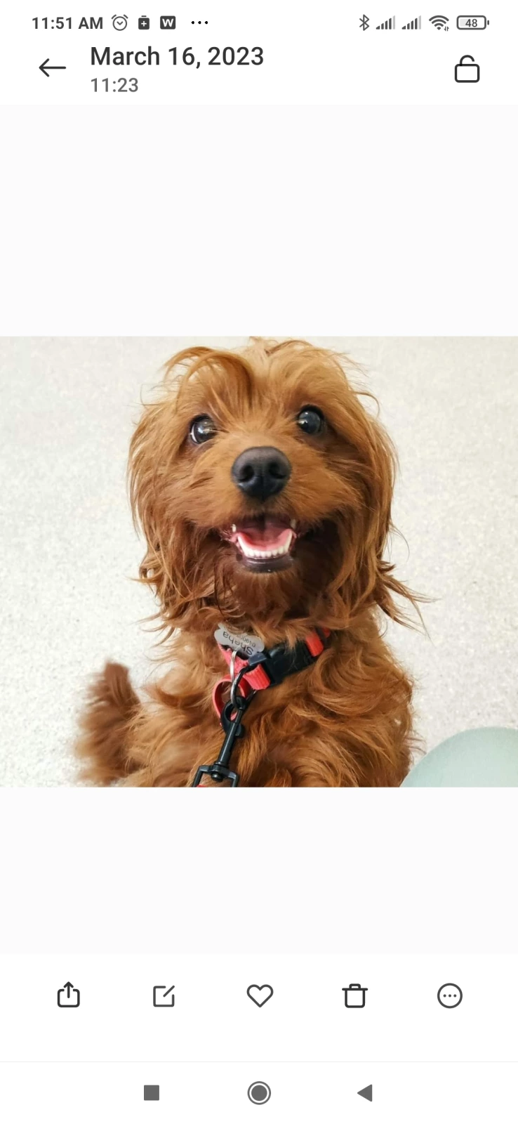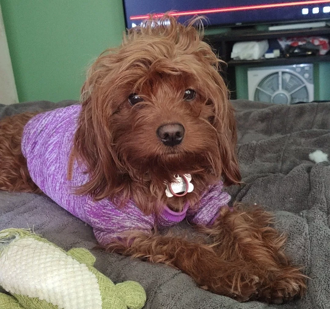 Mum is 11kg, red, fleece, loose curl, maintenance free coat. Very laid back girl, independent, happy, affectionate, very smart, loves other animals, recently started assistance dog training after passing behavioural test.