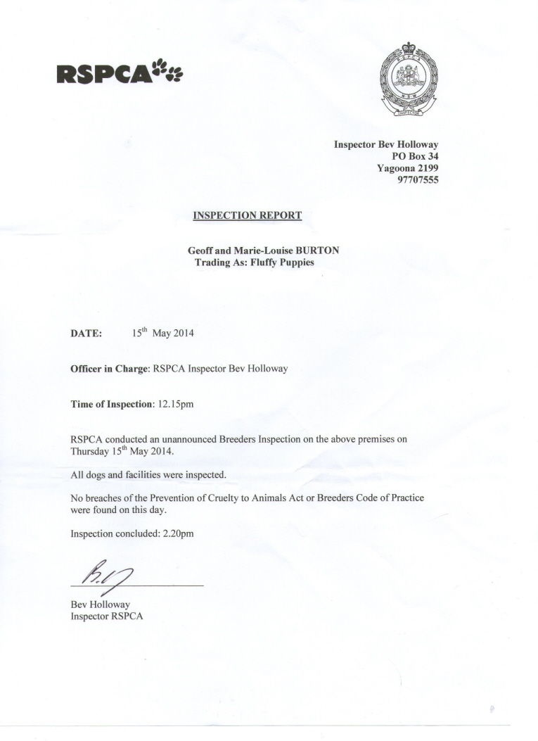 • Inspections include: RSPCA Inspected - Fluffy Puppies conforms with Breeder’s Code of Practice ; Annual Vet Audit Inspection