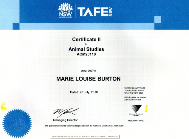 • Qualifications: Animal Studies Certificate II; Registered identifier with NSW Pet Registry. I0002765