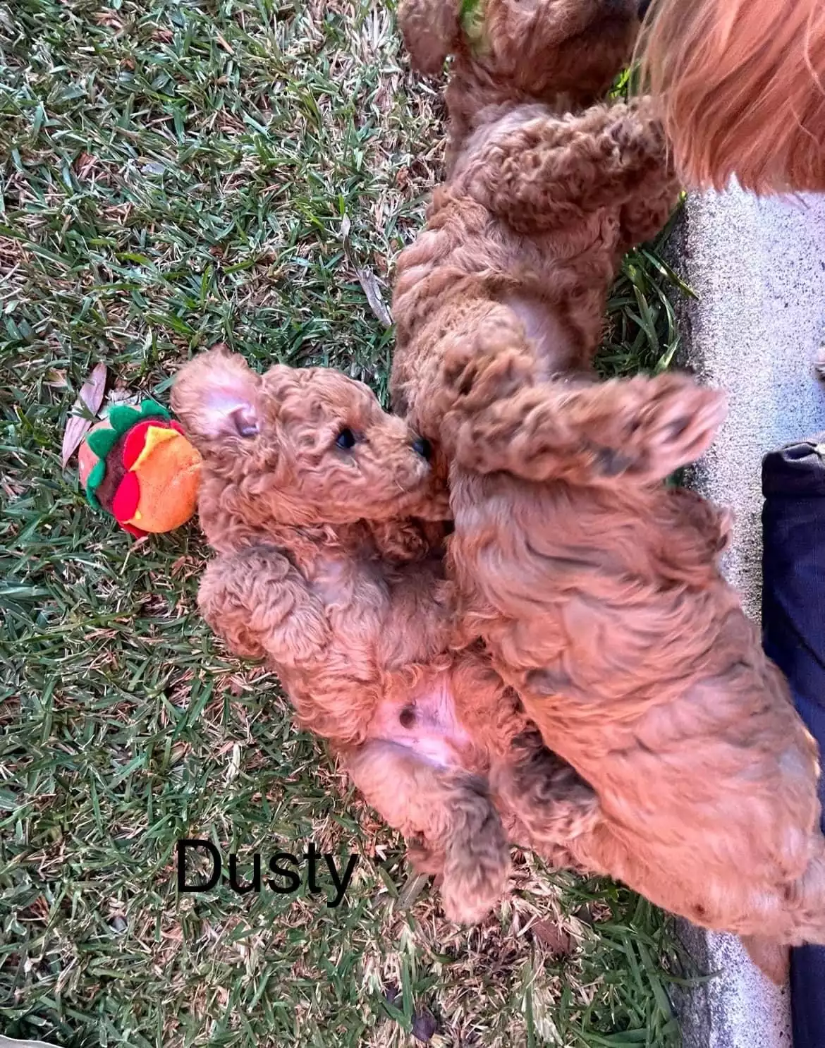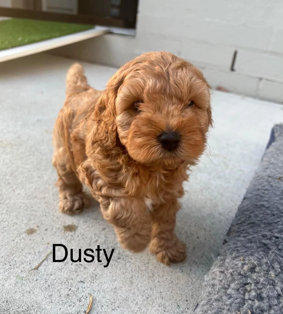 Mum is a beautiful F1 Cavoodle, full of energy, love, and personality. She’s a bit of a talker and is always after cuddles and kisses, weighing 9kg. Dad is a purebred Toy Poodle, weighing 5kg, a deep mahogany colour with a very friendly and energetic nature (not our dog).