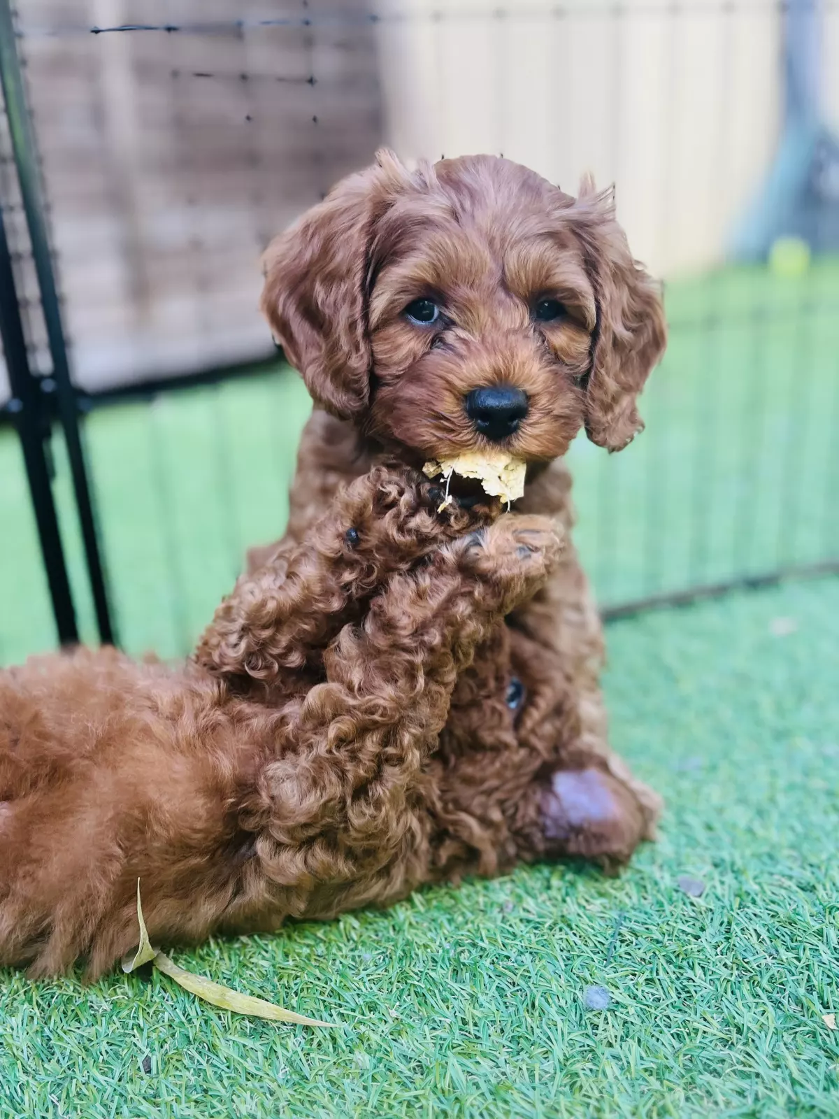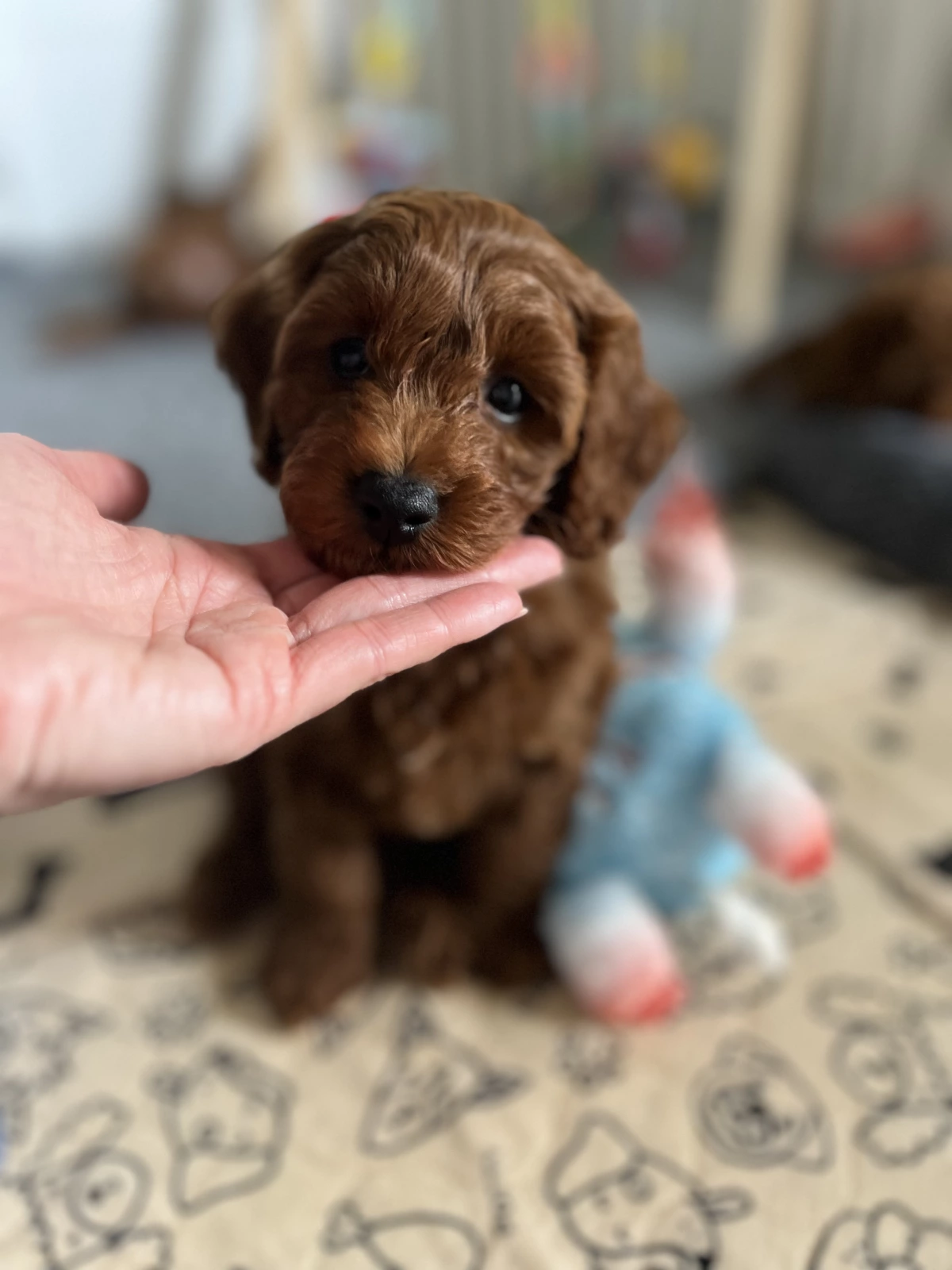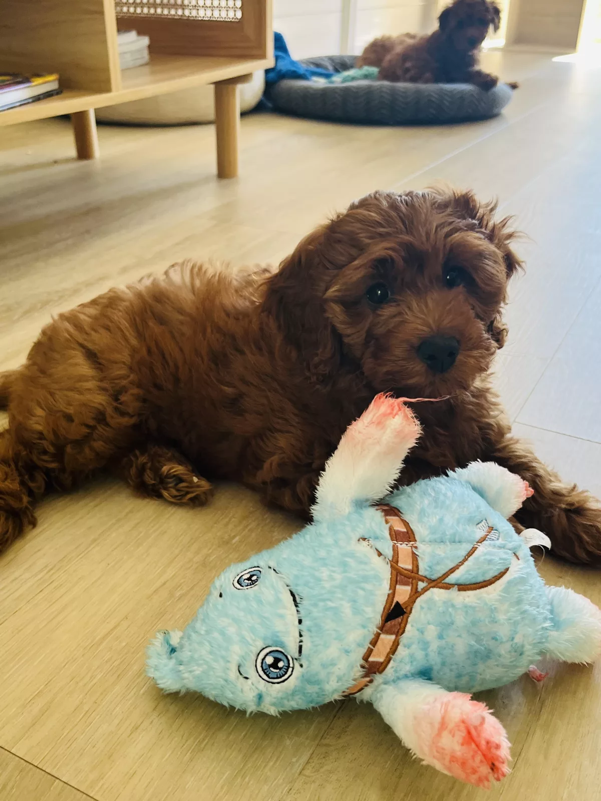 Two beautiful red F1b Toy Cavoodle puppies lovingly raised in our family home (with children spoiling them rotten!) They have such sweet little temperaments.
