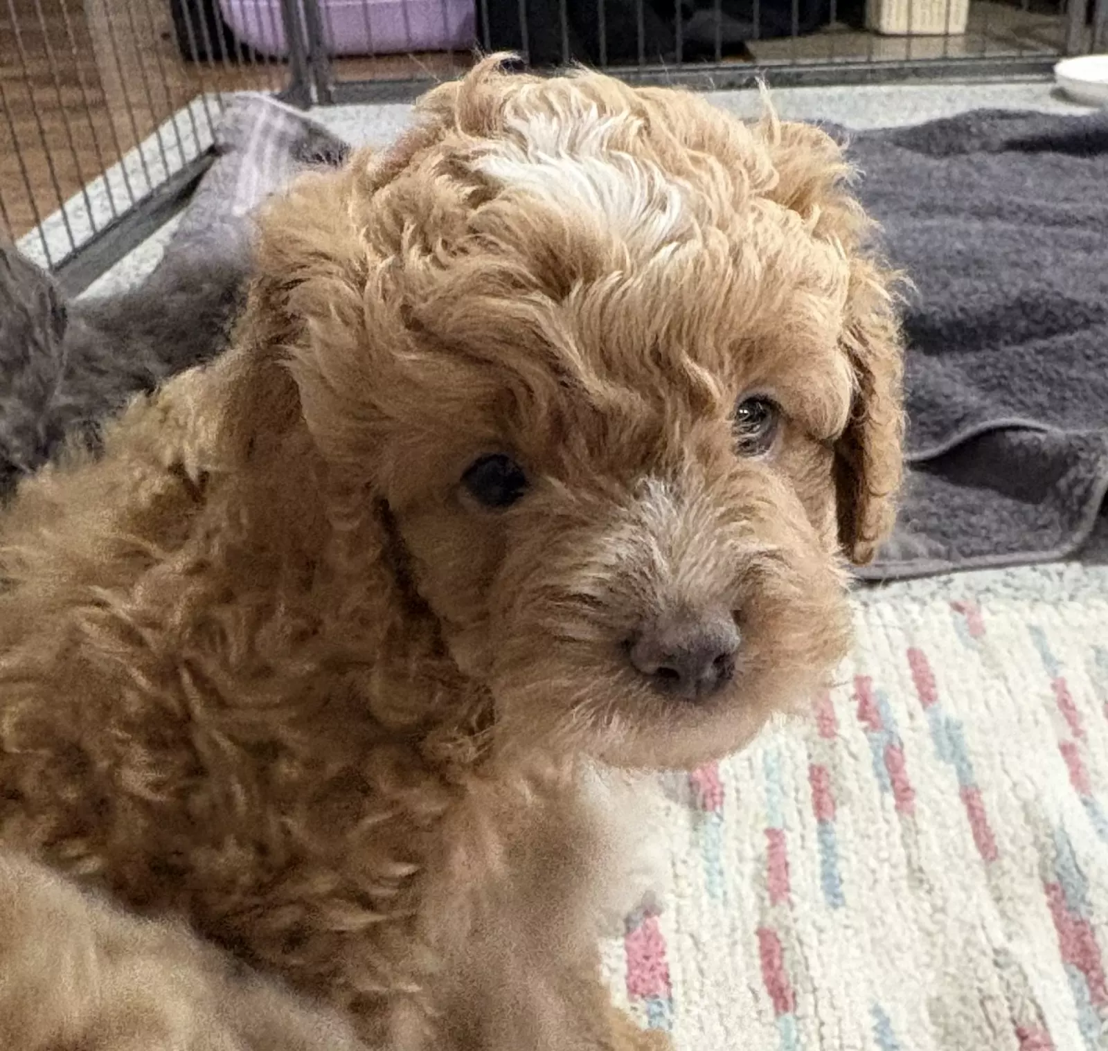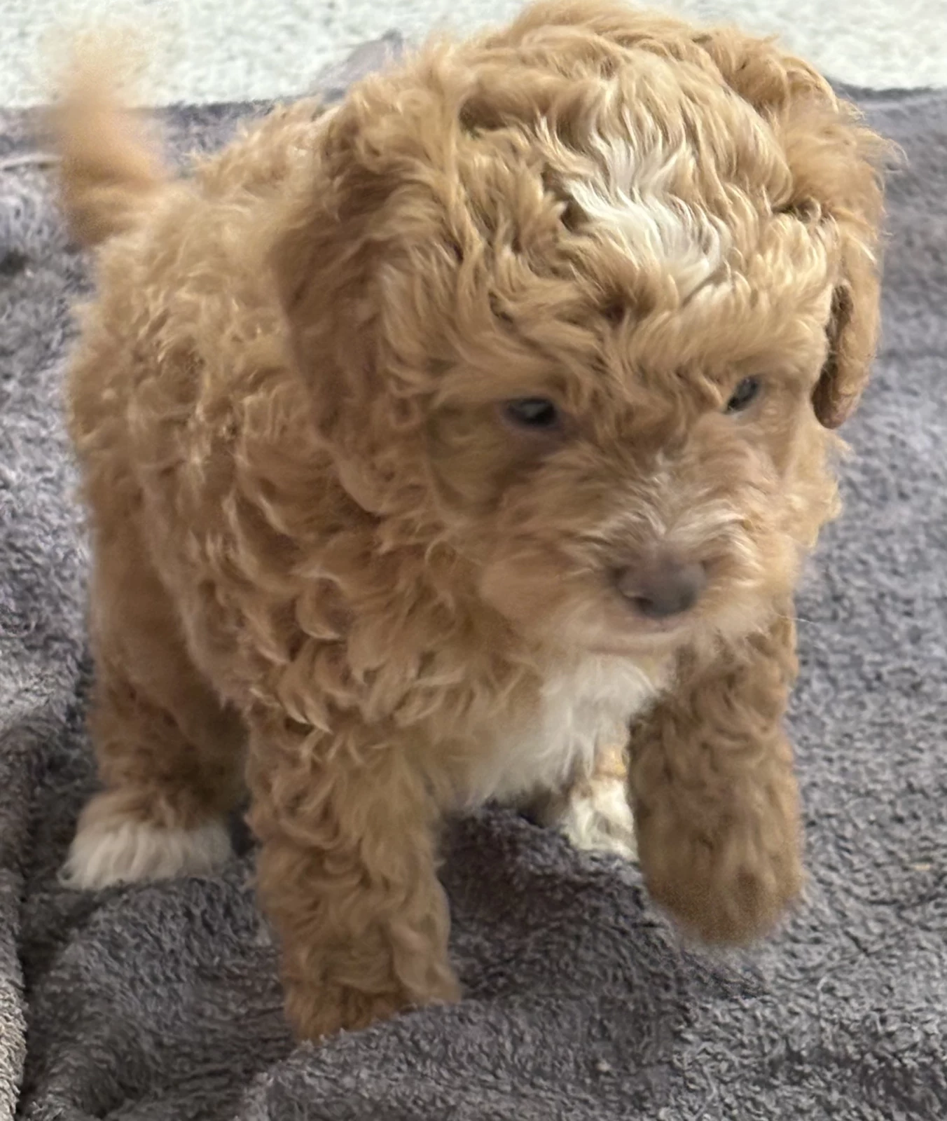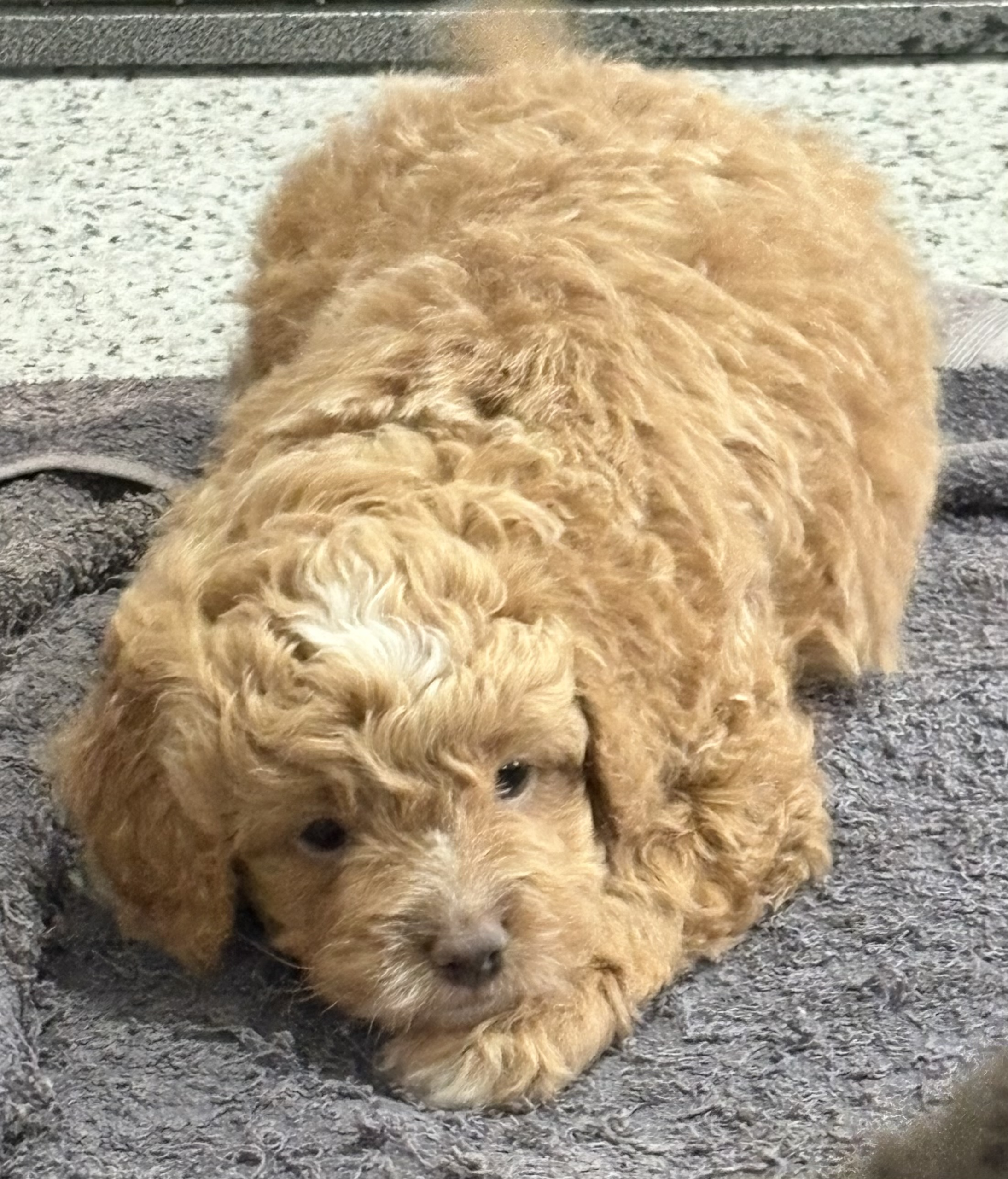 Meet Hunter, our gorgeous caramel and white Cavoodle boy, the last puppy available from this beautiful litter. Hunter has a soft, fluffy coat and a sweet, curious nature. He has been house raised in a loving family home alongside children and cats, making him well socialised, confident, and comfortable with everyday household life.